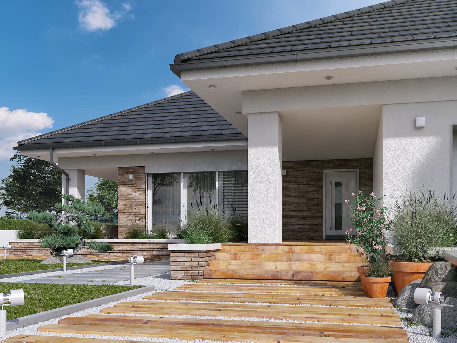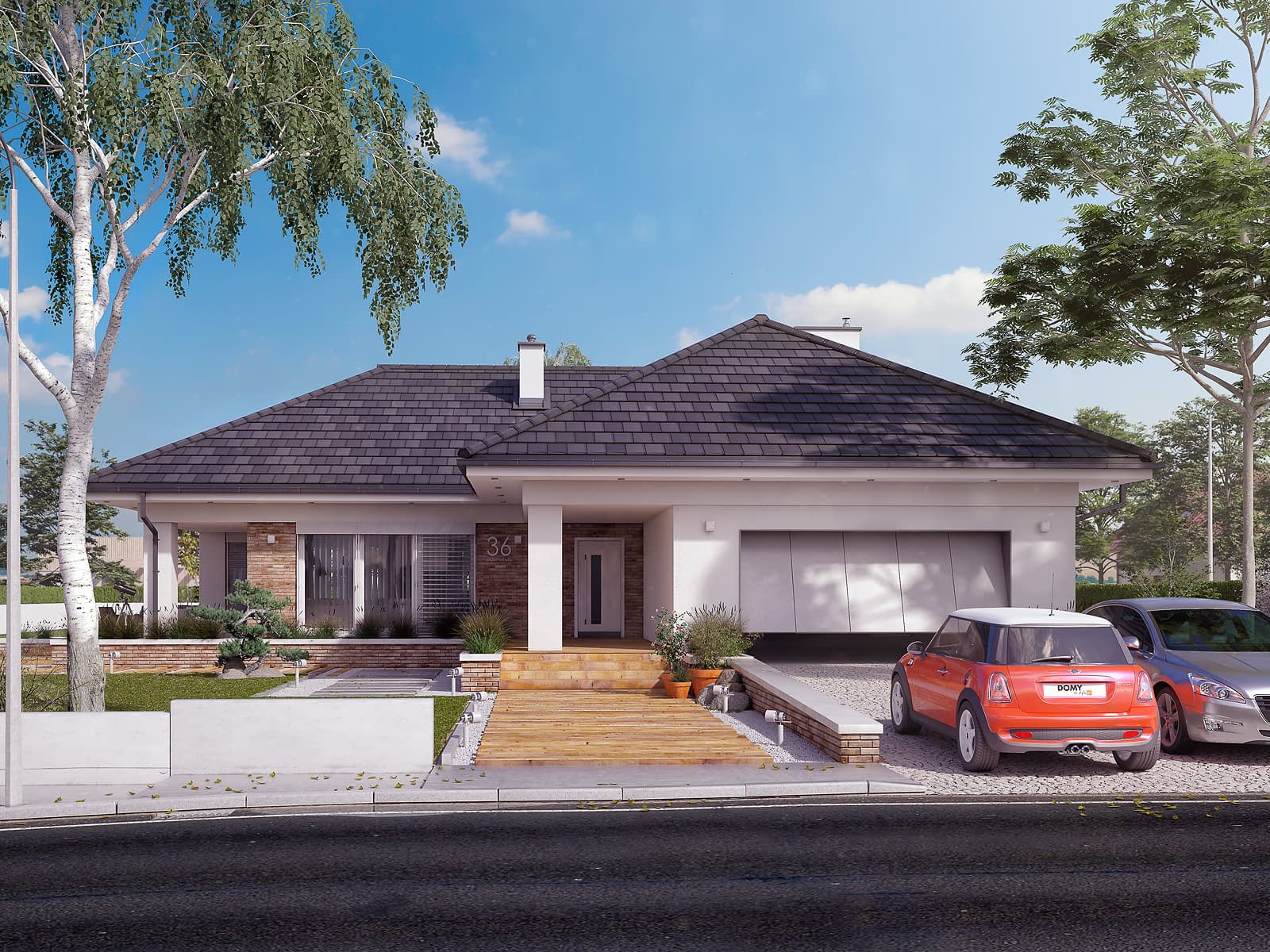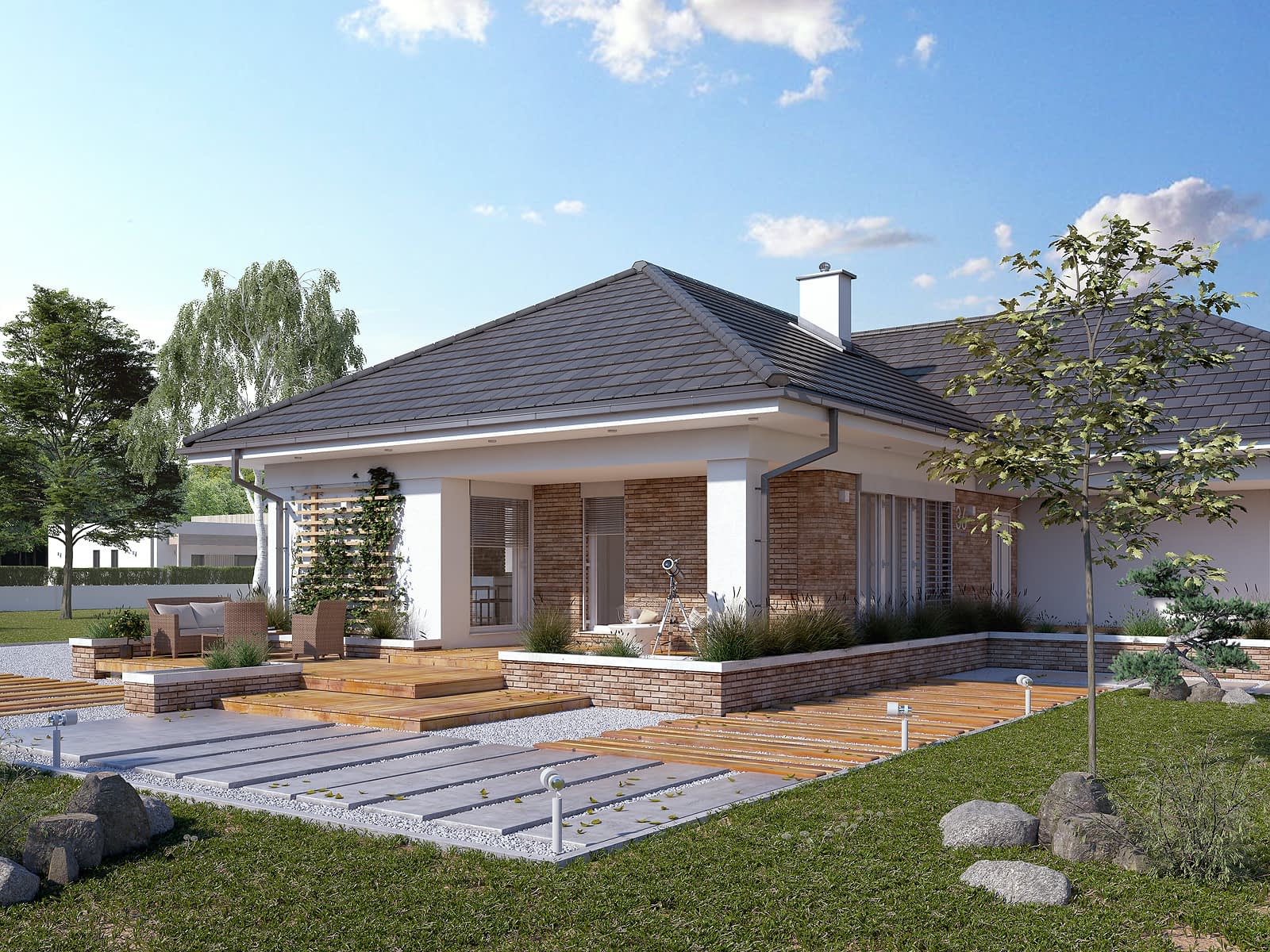 Aksamit 8 to projekt nowoczesnego domu parterowego. Układ funkcjonalny został dostosowany do potrzeb 5-osobowej rodziny. Bryła budynku przykryta wielospadowym dachem. Część dzienną tworzą przestronny salon z kominkiem, otwarta kuchnia oraz jadalnia z bezpośrednim wyjściem na zadaszony taras. Część nocna to cztery wygodne sypialnie oraz wspólna łazienka. Jedna z sypialni posiada własną łazienkę i garderobę tzw. apartament gospodarzy. W części gospodarczej przewidziano dużą kotłownię z niezależnym wyjściem na zewnątrz oraz dwustanowiskowy garaż.Konstrukcja
