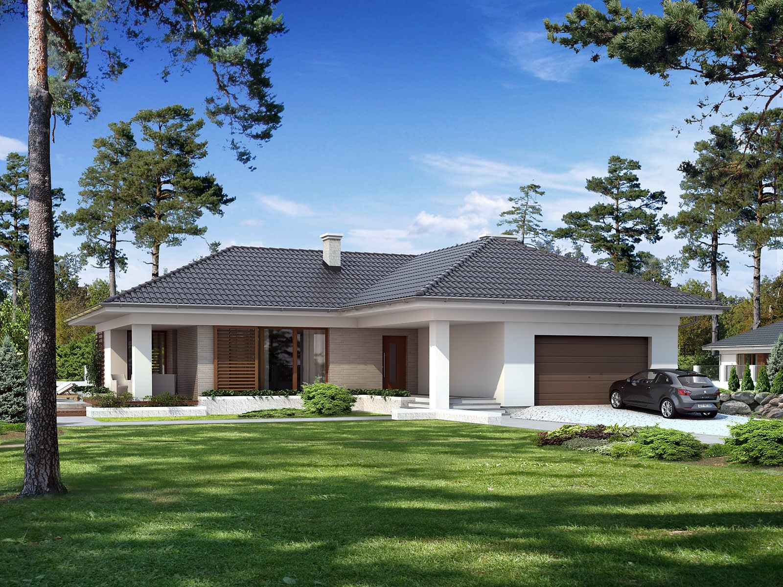 Jednorodzinny budynek mieszkalny, parterowy, niepodpiwniczony, przeznaczony dla 4-osobowej rodziny. W części dziennej przewidziano salon oraz kuchnię z jadalnią, w nocnej trzy sypialnie z łazienką, w gospodarczej garaż, kotłownię, wc oraz garderobę. Budynek został utrzymany w nowoczesnej stylistyce.Konstrukcja