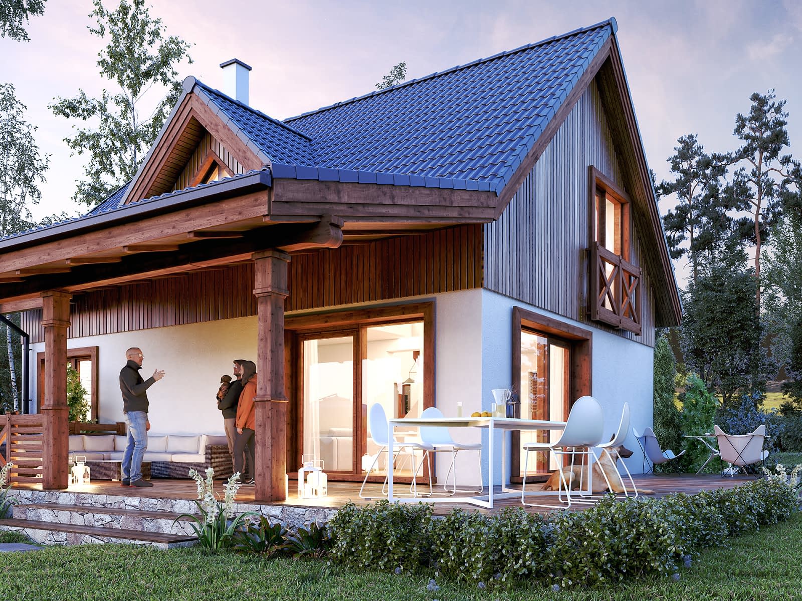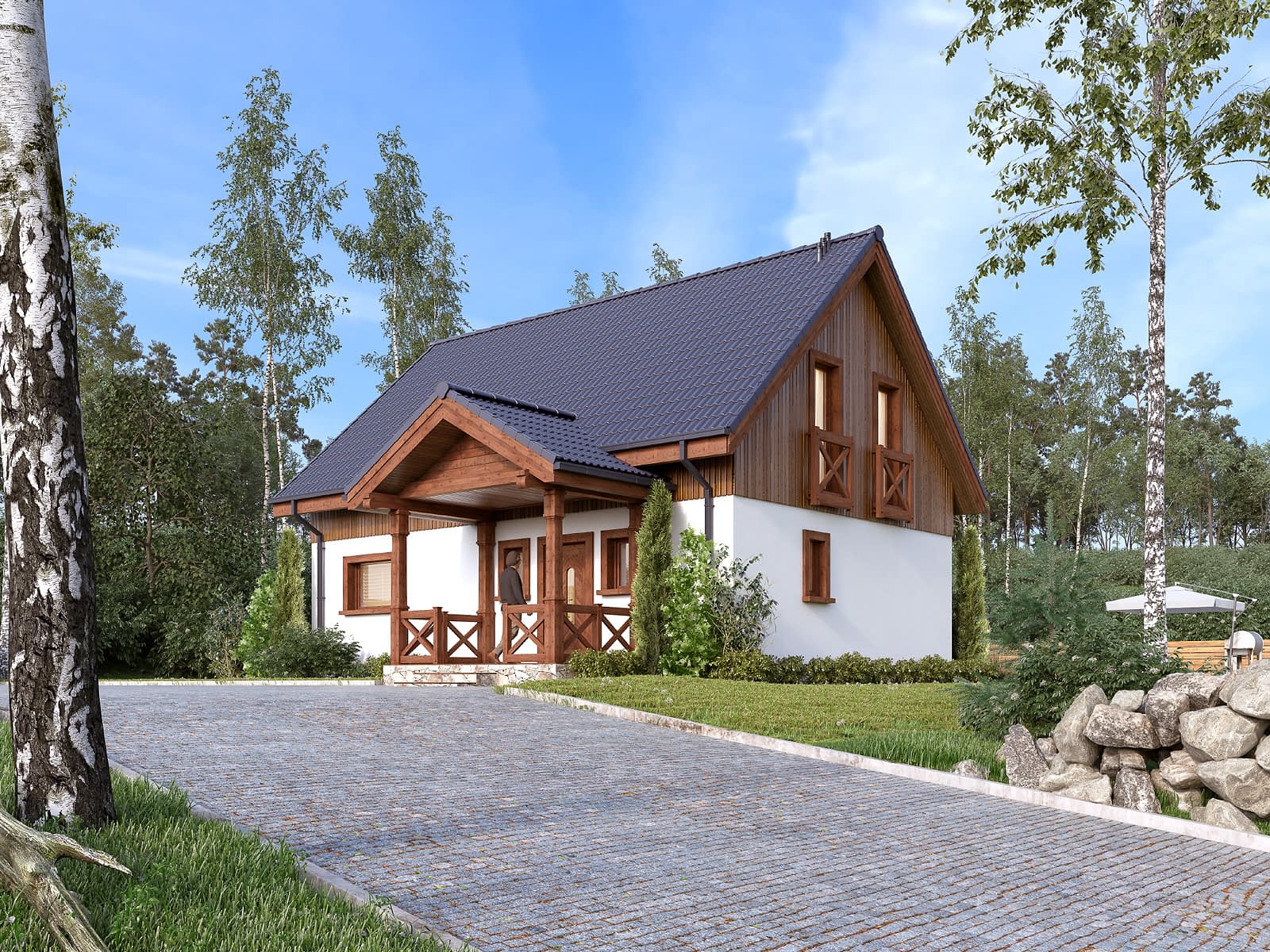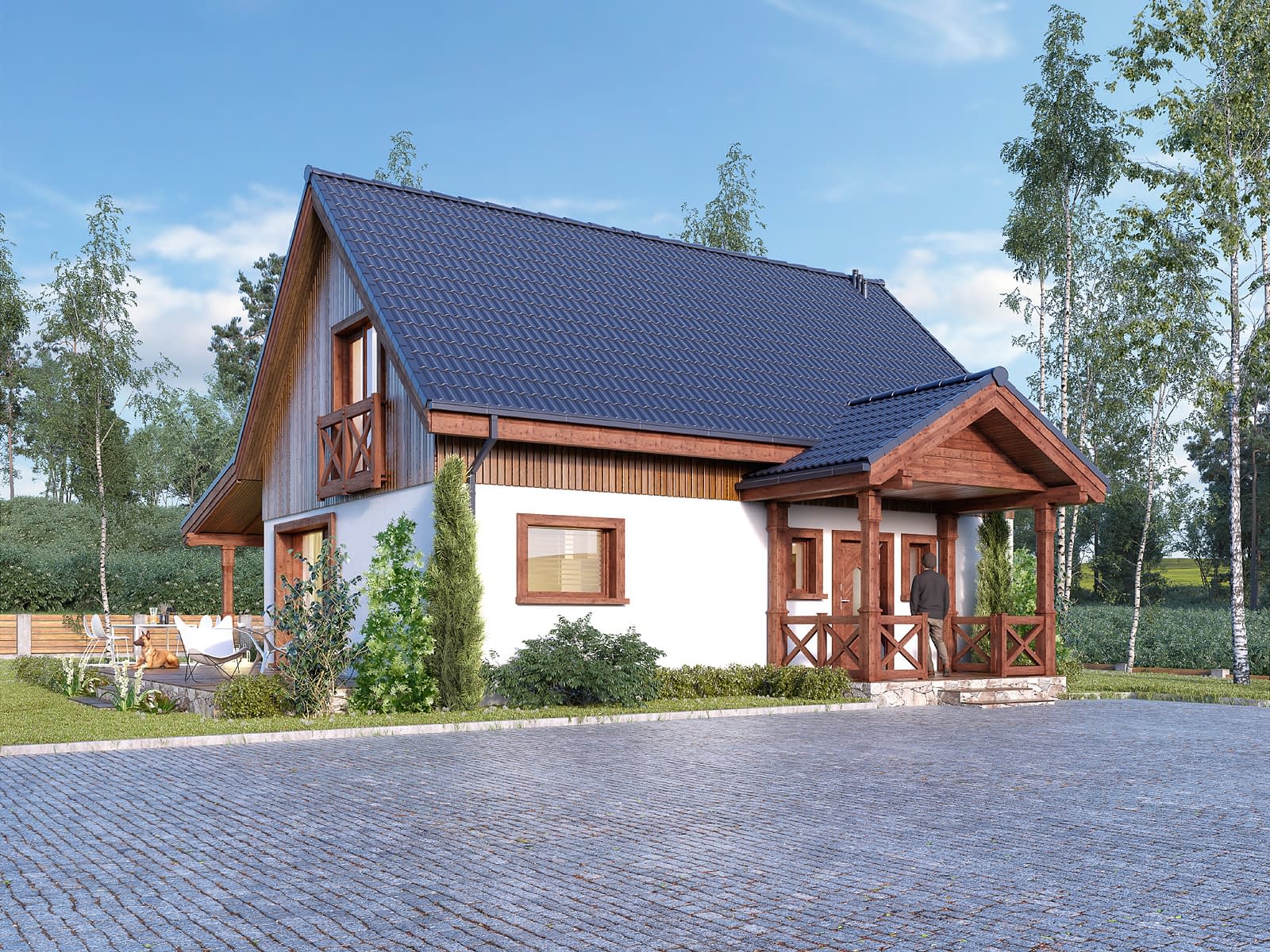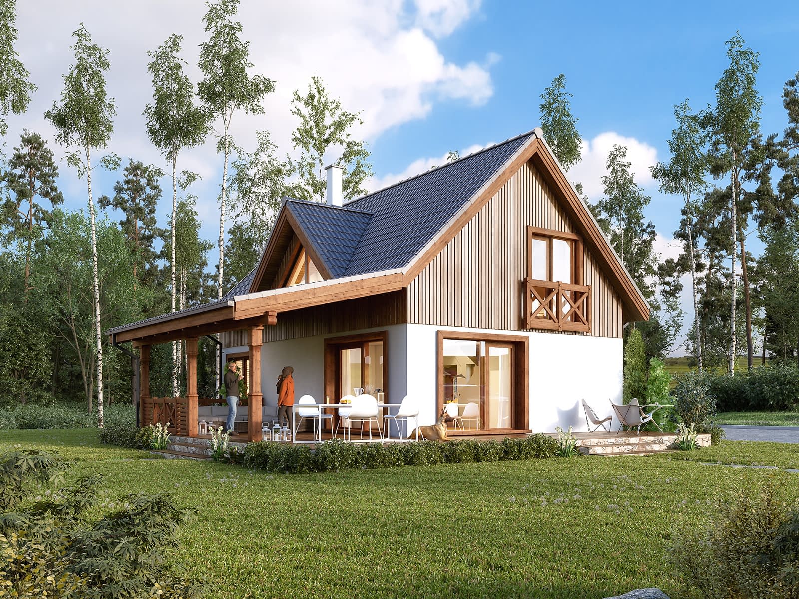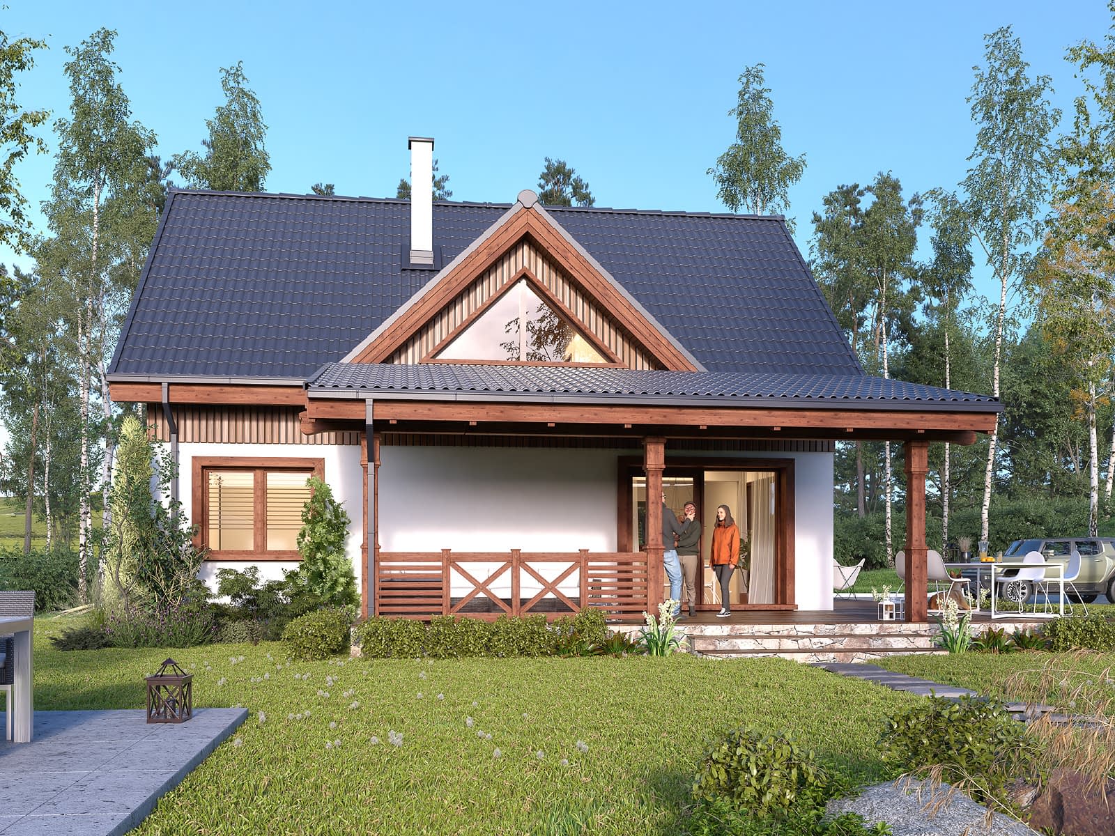 Aksamitka 2 to projekt domu z użytkowym poddaszem o powierzchni 102 m2. Prosta bryła zaprojektowana została na rzucie prostokąta i przykryta dwuspadowym dachem. Mieszkańcy do dyspozycji mają otwartą strefę dzienną oraz trzy sypialnie. Projekt posiada antresolę, pomieszczenie rekreacyjne na poddaszu oraz zadaszony taras.Konstrukcja