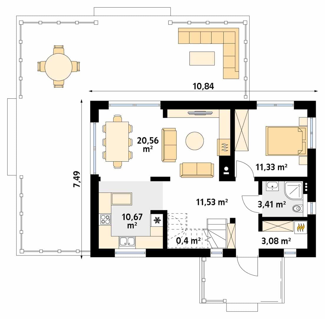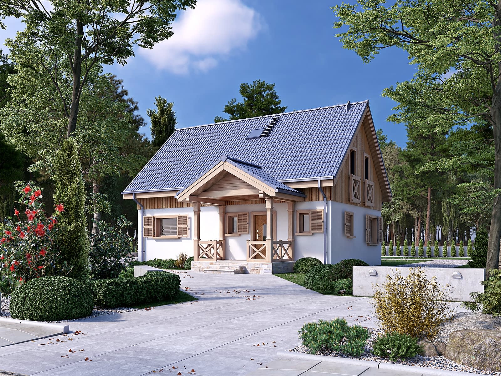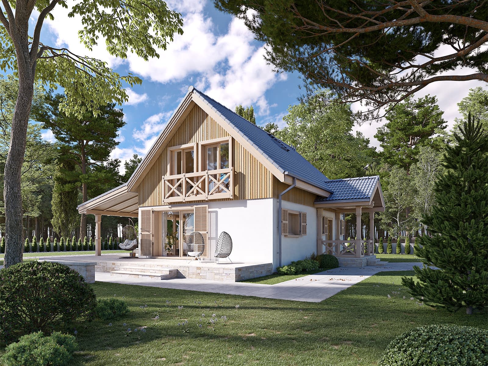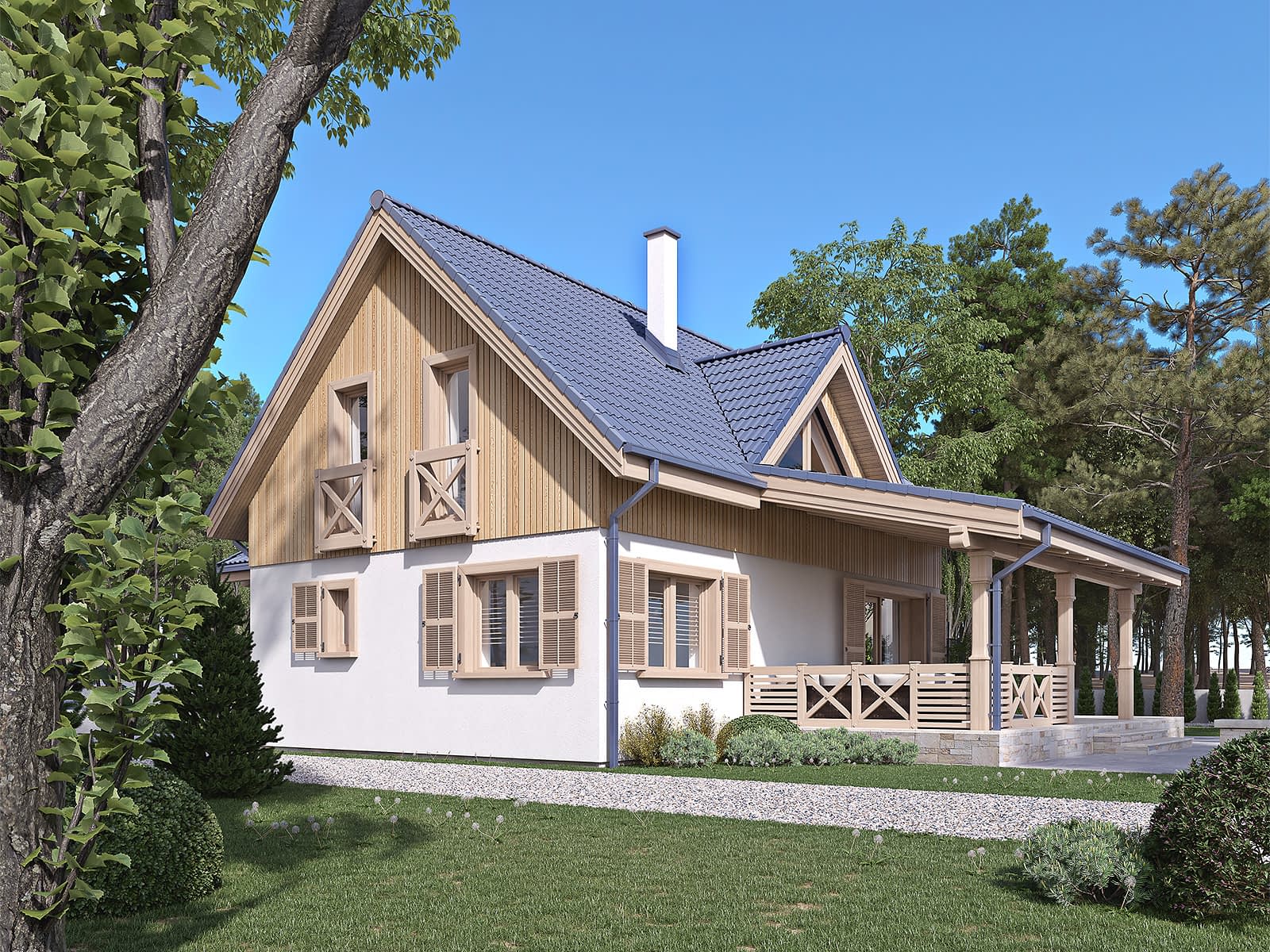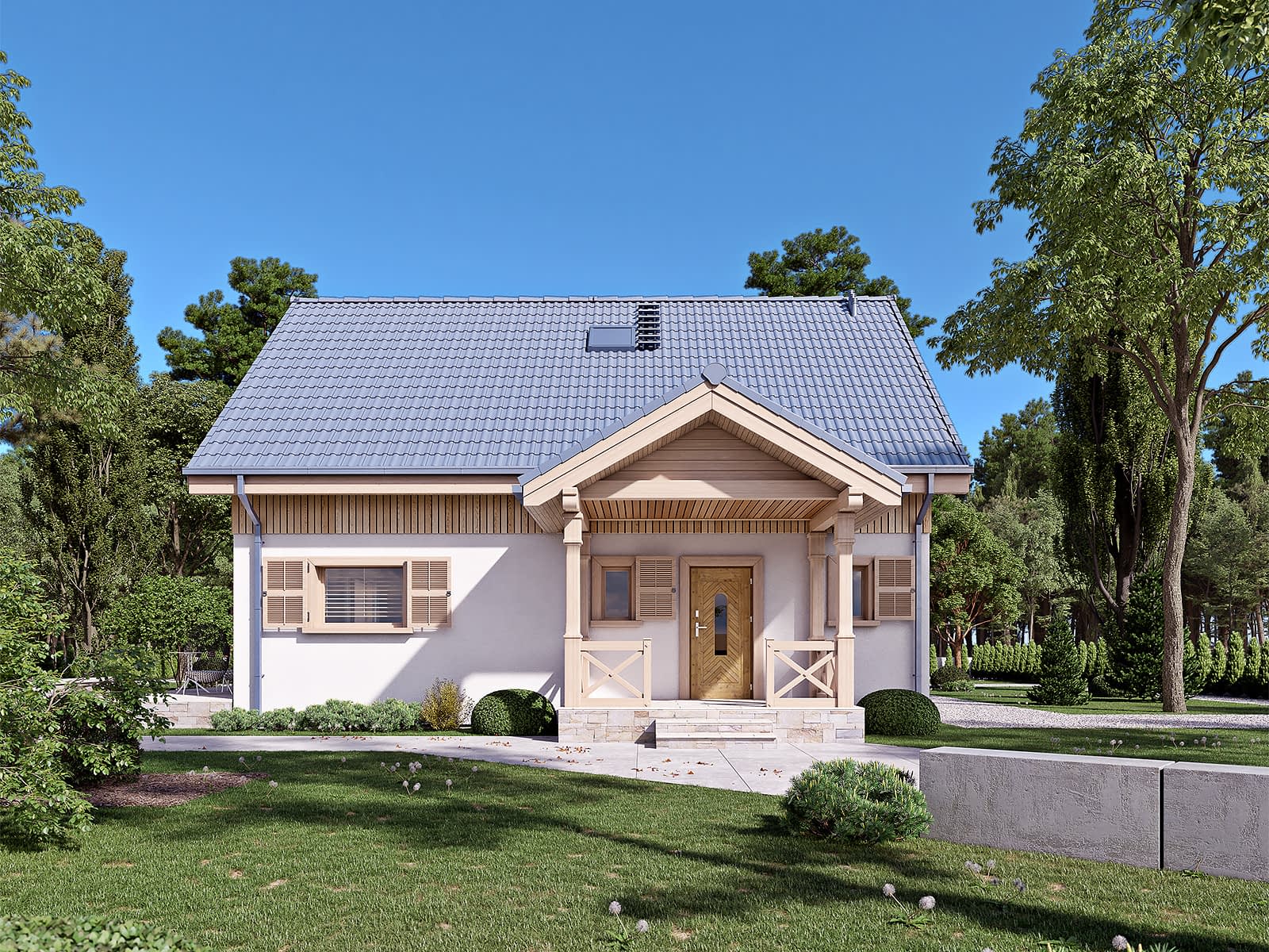 Aksamitka dr-S to projekt domu z użytkowym poddaszem w konstrukcji drewnianej. Mieszkańcy do dyspozycji mają otwartą strefę dzienną oraz cztery sypialnie. Jedna z sypialni znajduje się na parterze, dzięki czemu można ją dodatkowo wykorzystać jako pokój dla gości lub gabinet do pracy i nauki. Projekt posiada piękną werandę, która stanowi naturalne przedłużenie salonu.Konstrukcja