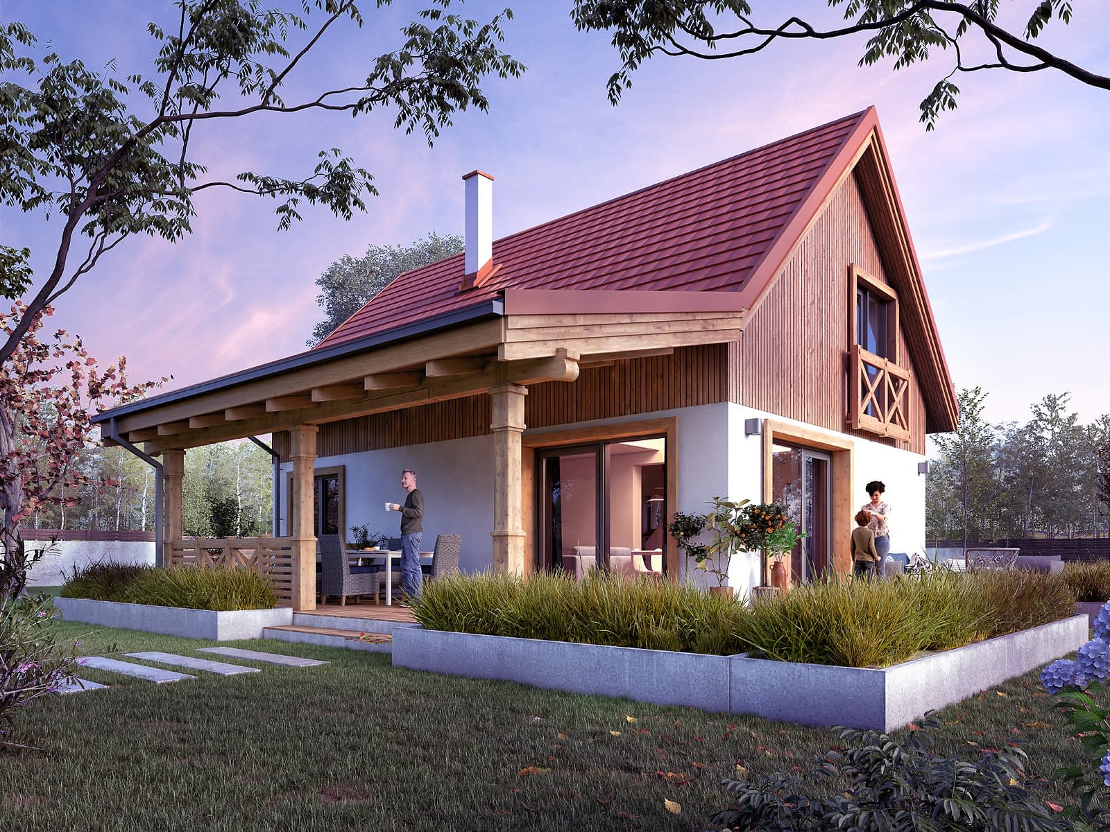 Aksamitka to projekt domu z użytkowym poddaszem o powierzchni 95 m2. Prosta bryła zaprojektowana została na rzucie prostokąta i przykryta dwuspadowym dachem. Mieszkańcy do dyspozycji mają otwartą strefę dzienną oraz trzy sypialnie. Projekt posiada antresolę oraz zadaszony taras.Konstrukcja