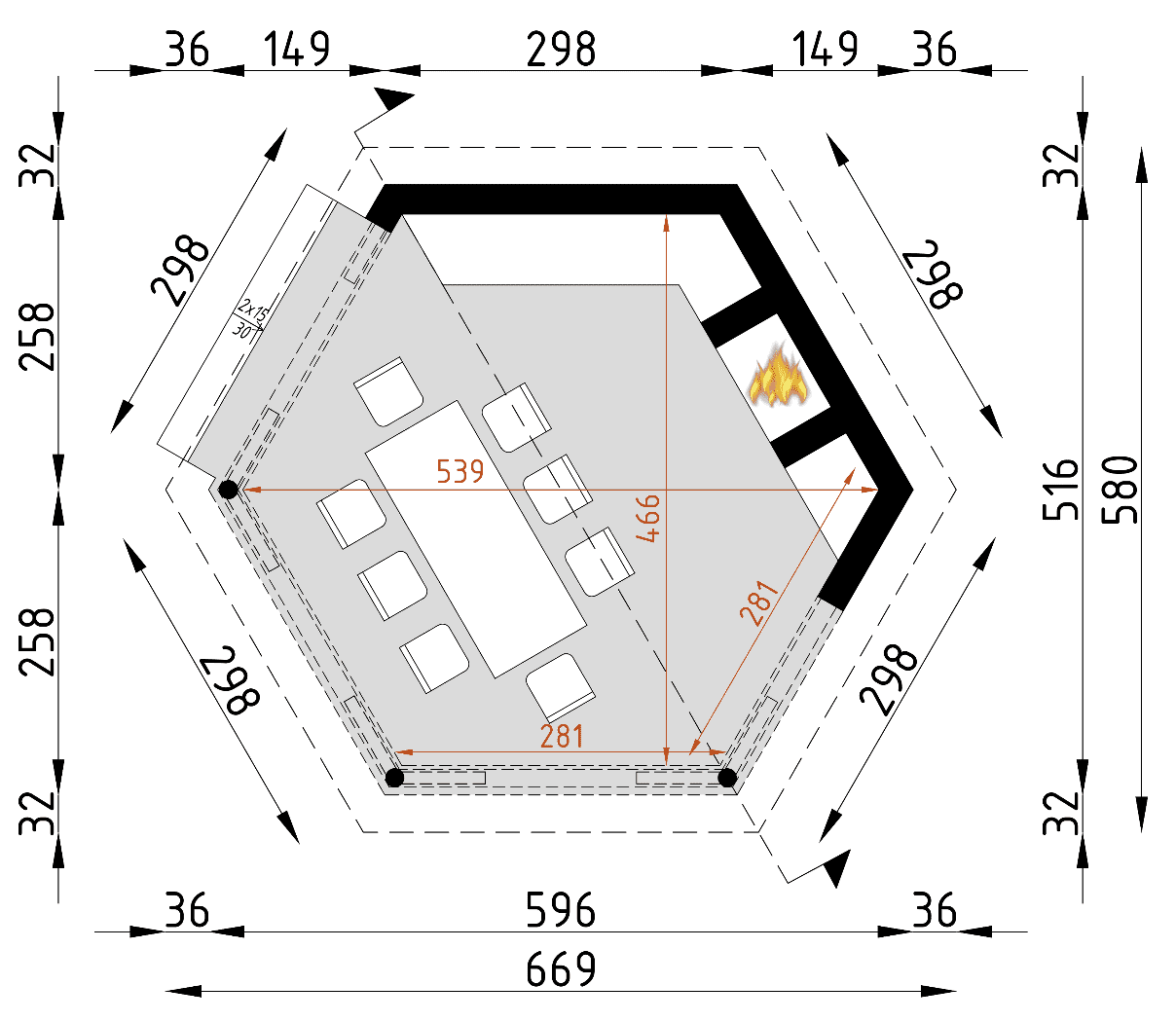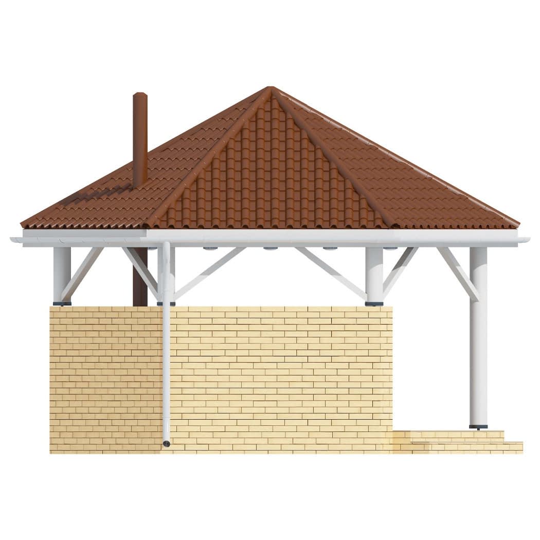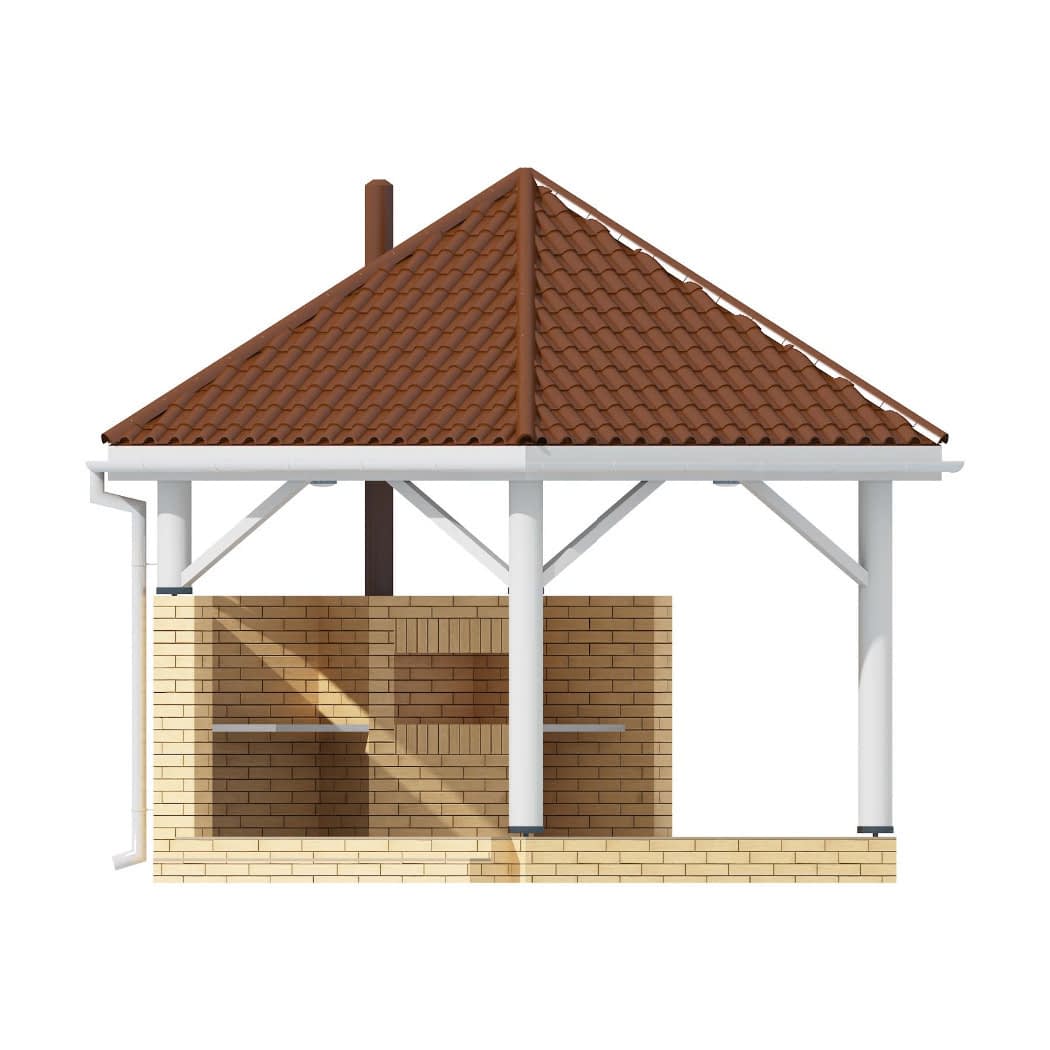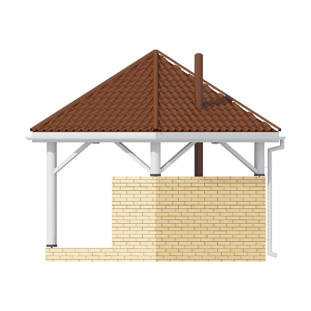 Altanka ogrodowa o nowoczesnej stylistyce z grillem, miejscem do przygotowania posiłków i składzikiem na drewno. Prosta bryła na planie szeciokąt. Idealne miejsce odpoczynku, kulinarnych i towarzyskich spotkań.Konstrukcja