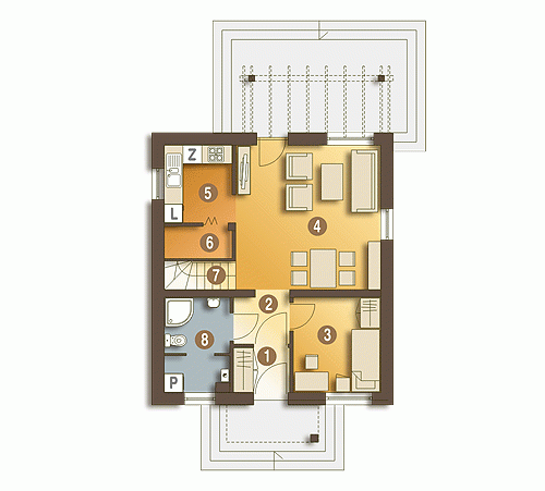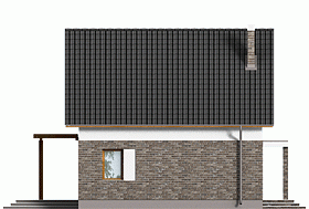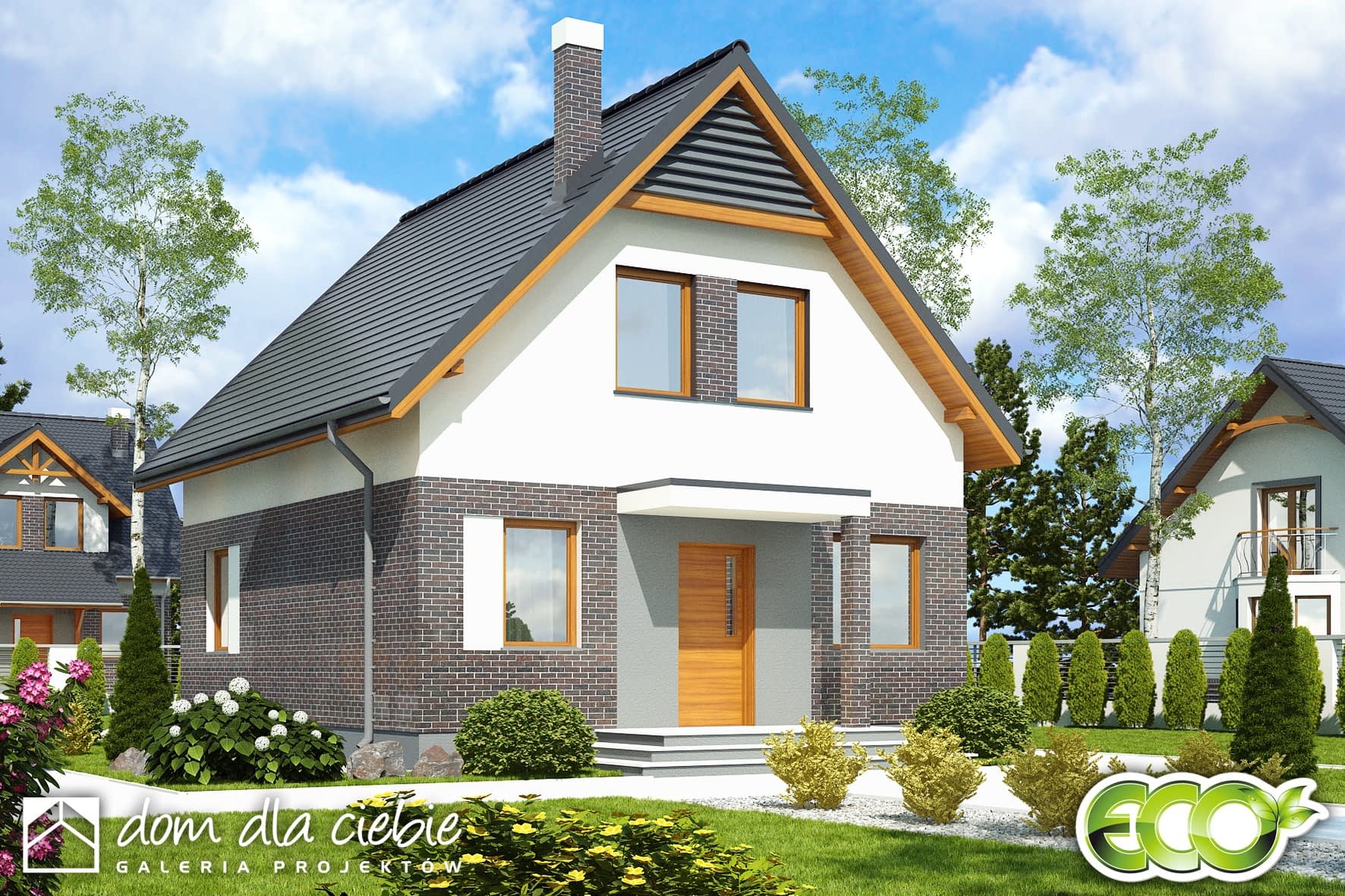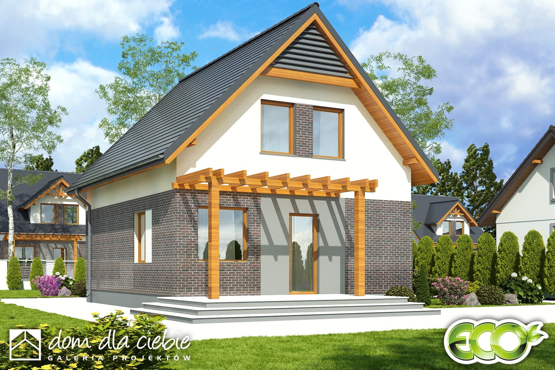 Mały dom jednorodzinny o nowoczesnym charakterze, z prostym dwuspadowym dachem, wykończony okładziną klinkierową. Ze względu na niewielkie wymiary nadaje się na małe, wąskie działki (przenosząc okno w kuchni na tylną ścianę domu zyskujemy dodatkowy metr). Na parterze znajduje się salon z wydzieloną częścią wypoczynkową i jadalną, połączony z niewielką kuchnią. Do kuchni przylega spiżarnia. Taras zacieniony jest drewnianą pergolą, a wejście do domu praktycznym, nowoczesnym zadaszeniem. Na parterze przewidziano również pokój/gabinet oraz niewielką łazienkę, z wydzielonym miejscem na piec c.o. Na poddaszu znajdują się 3 przytulne sypialnie oraz łazienka.Projekt należy do serii Eco – małych, prostych konstrukcyjnie domów, ekonomicznych w budowie i użytkowaniu. Dostępny również w wersji z garażem....Sprawdź inne nasze projekty domów. Zapraszamy!