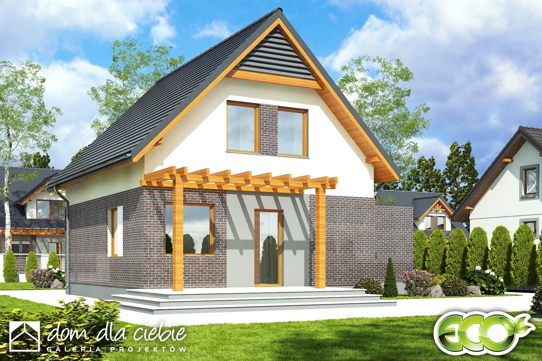 Mały dom jednorodzinny o nowoczesnym charakterze, z prostym dwuspadowym dachem, wykończony okładziną klinkierową. Ze względu na niewielkie wymiary nadaje się na małe, wąskie działki (przenosząc okno w kuchni na tylną ścianę domu zyskujemy dodatkowy metr). Na parterze znajduje się salon z wydzieloną częścią wypoczynkową i jadalną, połączony z niewielką kuchnią. Do kuchni przylega spiżarnia. Taras zacieniony jest drewnianą pergolą, a wejście do domu praktycznym, nowoczesnym zadaszeniem. Na parterze przewidziano również pokój/gabinet oraz niewielką łazienkę, z wydzielonym miejscem na piec c.o. Na poddaszu znajdują się 3 przytulne sypialnie oraz łazienka. Garaż z płaskim dachem dobudowany z boku budynku. Projekt należy do serii Eco – małych, prostych konstrukcyjnie domów, ekonomicznych w budowie i użytkowaniu. ...Sprawdź inne nasze projekty domów. Zapraszamy!