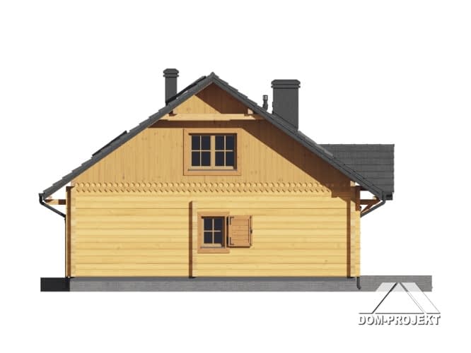 Dom z bali drewnianych. Na parterze duży salon z aneksem kuchennym, kominkiem oraz wyjściami na taras. Dwa pokoje, łazienka, pomieszczenie gospodarcze, komunikacja, wiatrołap, spiżarka. Na poddaszu łazienka, komunikacja oraz strych. Zwarta bryła budynku i dach dwuspadowy sprzyjają szybkiej i taniej budowie oraz niskim kosztom eksploatacji.Rzuty