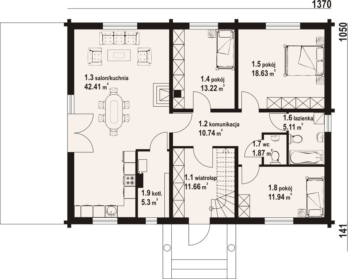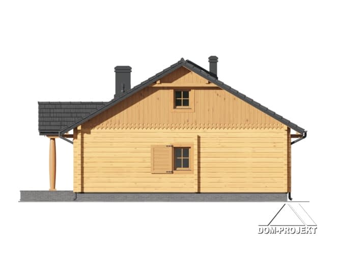 Dom z bali. Parterowy. Duży salon z aneksem kuchennym, kominkiem i wyjściem na taras. Trzy pokoje, łazienka, wc, spiżarka i wiatrołap. Z wiatrołapu schody na poddasze. Na poddaszu strych z możliwością adaptacji cele mieszkalne. Zwarta bryła budynku i dach dwuspadowy sprzyjają szybkiej i taniej budowie i niskim kosztom eksploatacji.Rzuty