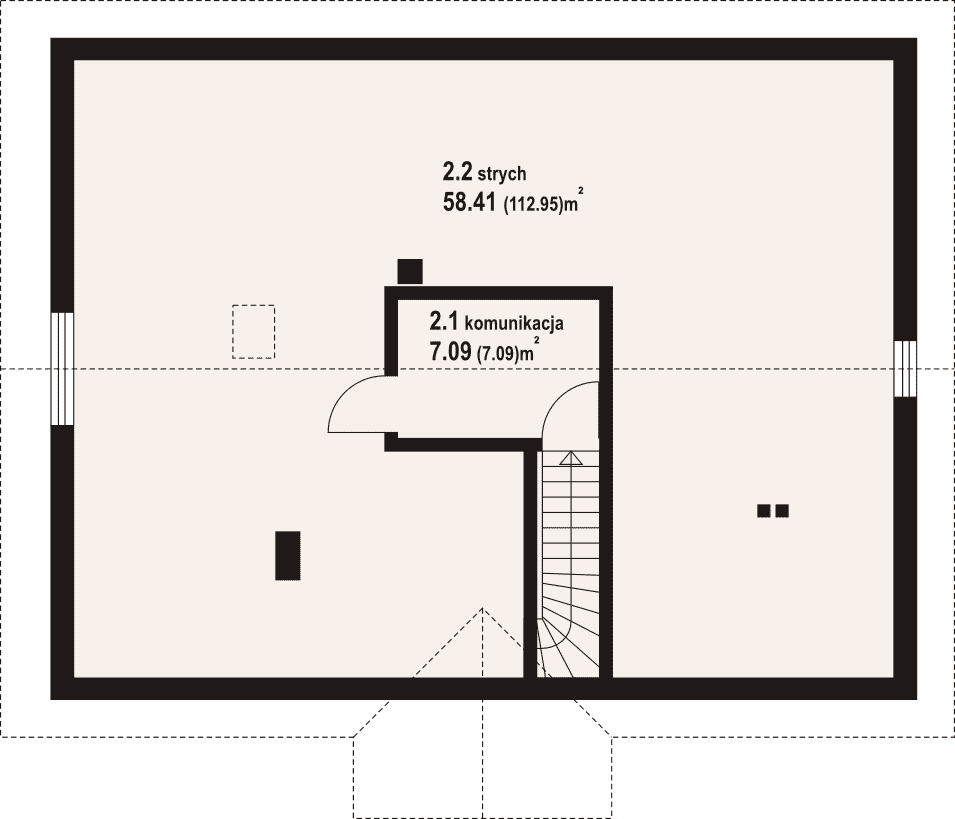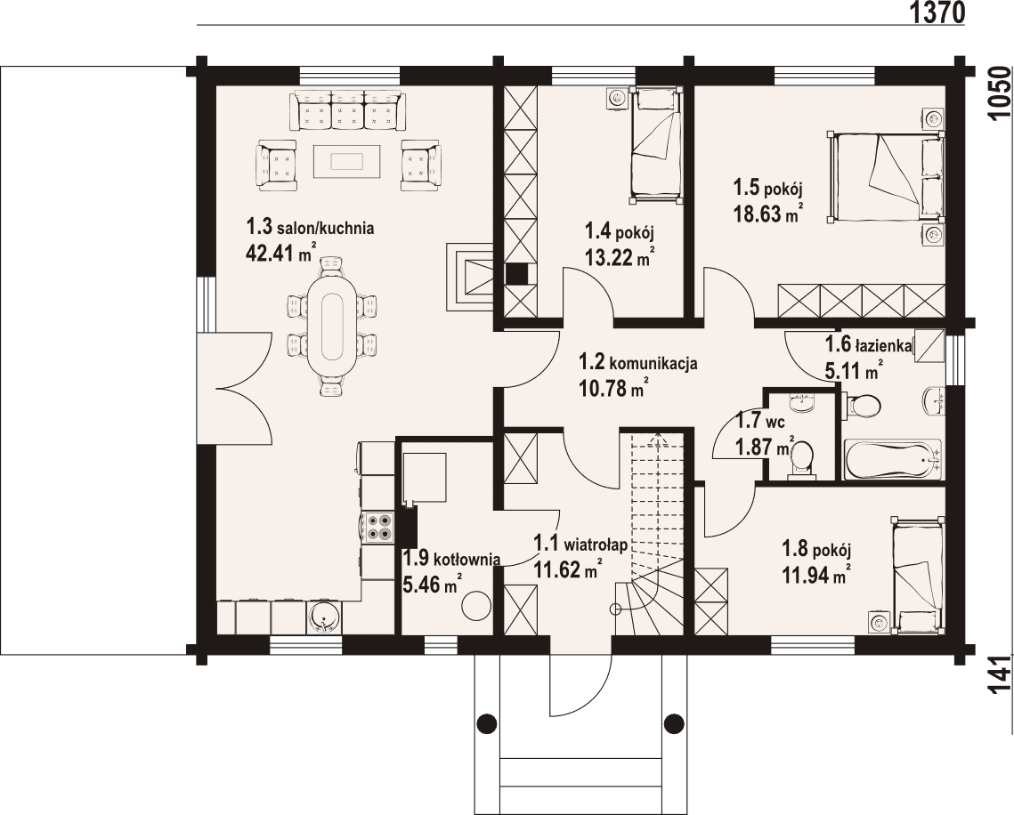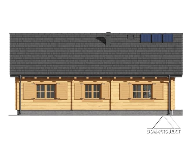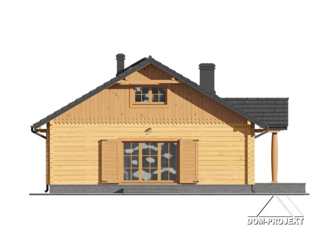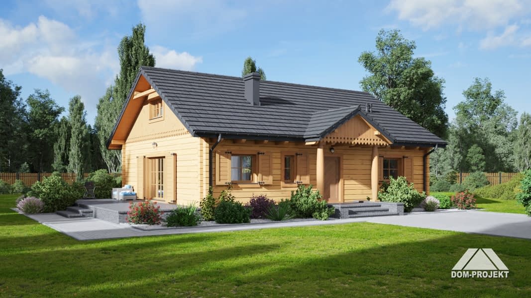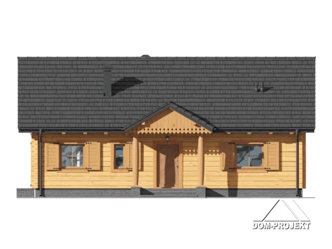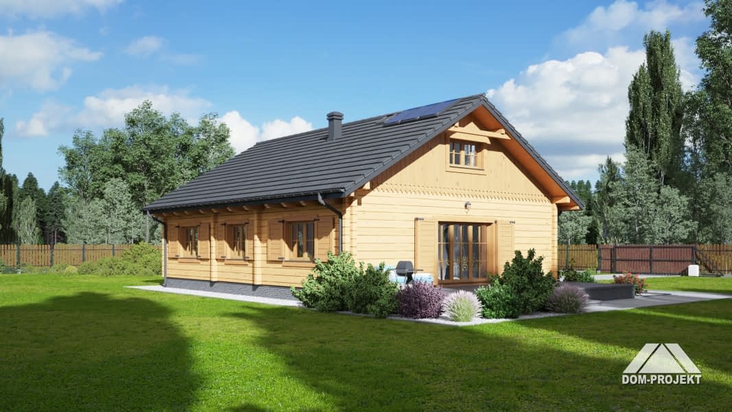 Dom z bali drewnianych. Duży salon z aneksem kuchennym, kominkiem i wyjściem na taras. Trzy pokoje, łazienka, wc, spiżarka i wiatrołap. Z wiatrołapu schody na poddasze. Na poddaszu strych. Zwarta bryła budynku i dach dwuspadowy sprzyjają szybkiej i taniej budowie i niskim kosztom eksploatacji.Rzuty