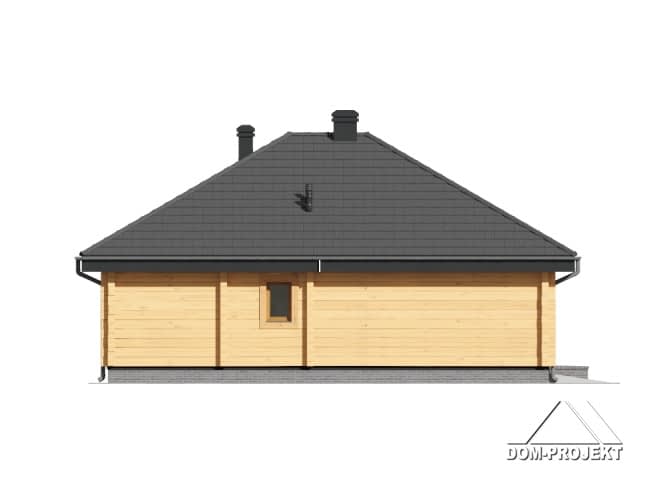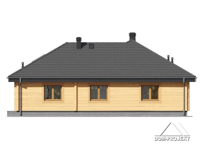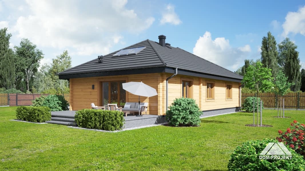 Parterowy dom z bali drewnianych. Duży salon z aneksem kuchennym, kominkiem i wyjściem na taras. Dwa pokoje, łazienka, wc, wiatrołap, komunikacja, spiżarka, kotłownia i garaż. W garażu schody rozkładane na strych. Strych nieużytkowy.Rzuty