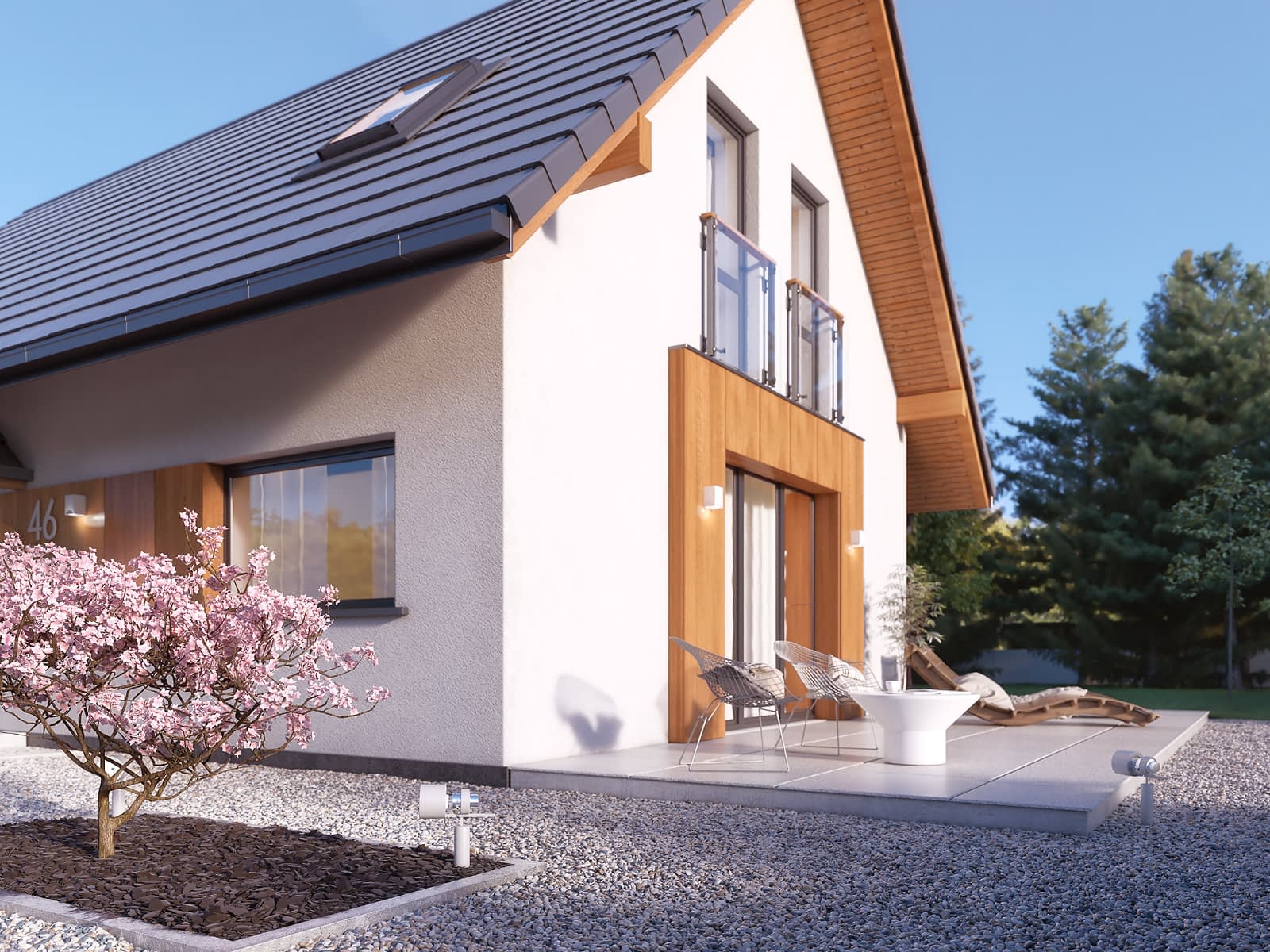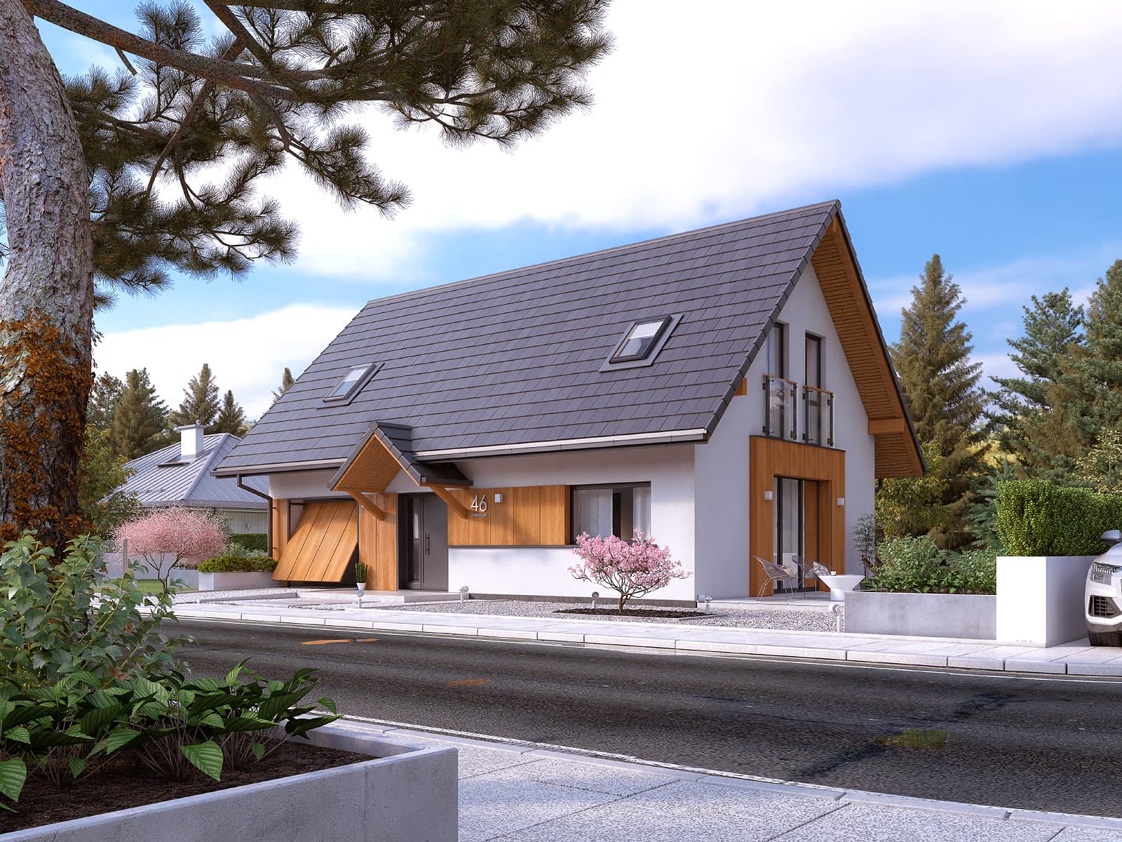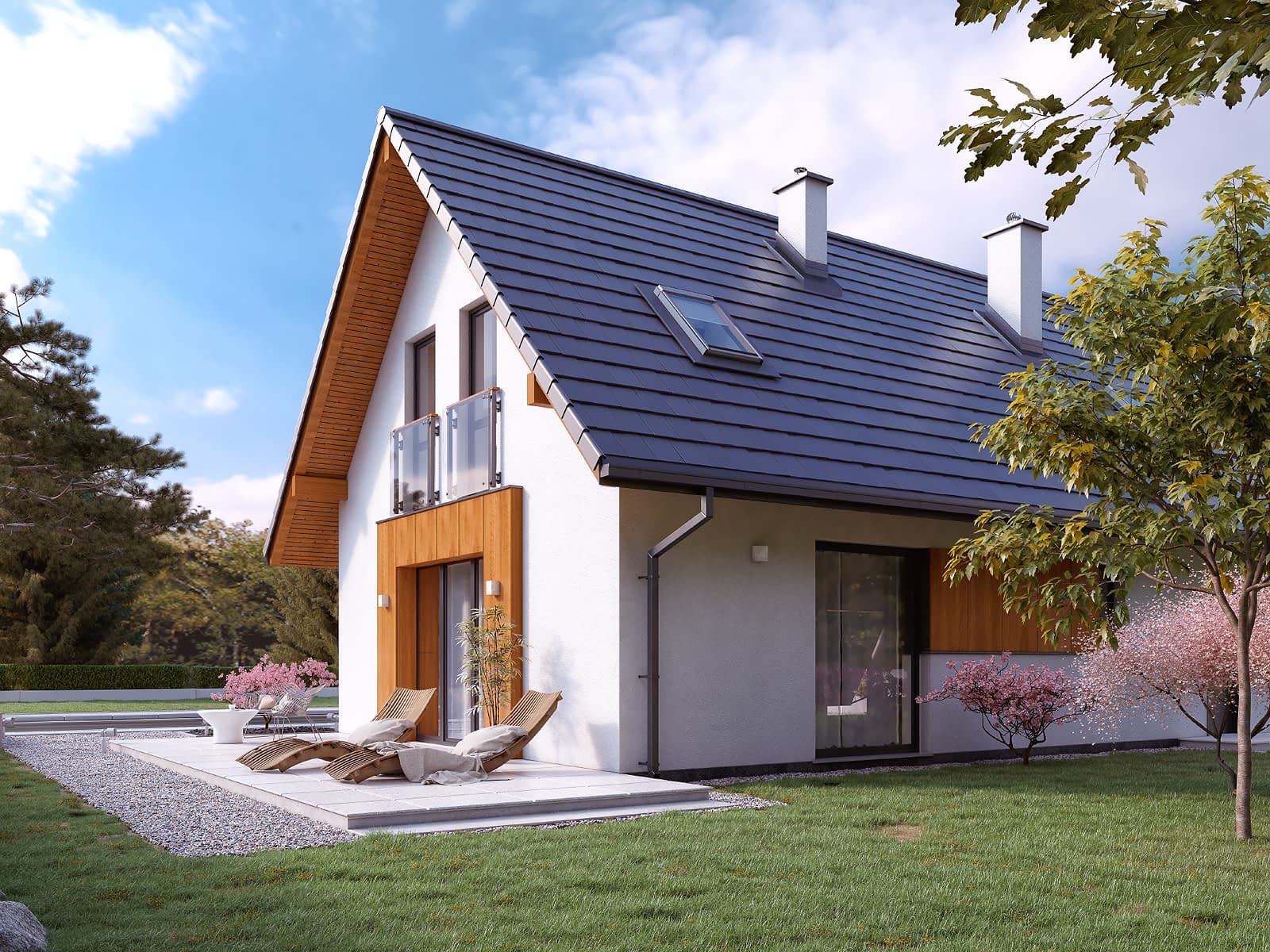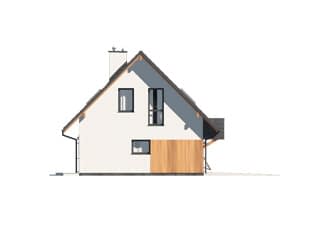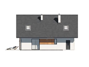 Zwarty energooszczędny dom o prostej bryle. Na poddaszu zaprojektowano przestronne trzy sypialnie z dużą łazienką i pomieszczeniem gospodarczym. Na parterze funkcjonalnie rozplanowano pomieszczenia dzienne i pomieszczenia pomocnicze. Dobrym rozwiązaniem jest połączenie domu z garażem poprzez śluzę, jaką jest wiatrołap. W kuchni znajduje się spiżarnia.Konstrukcja