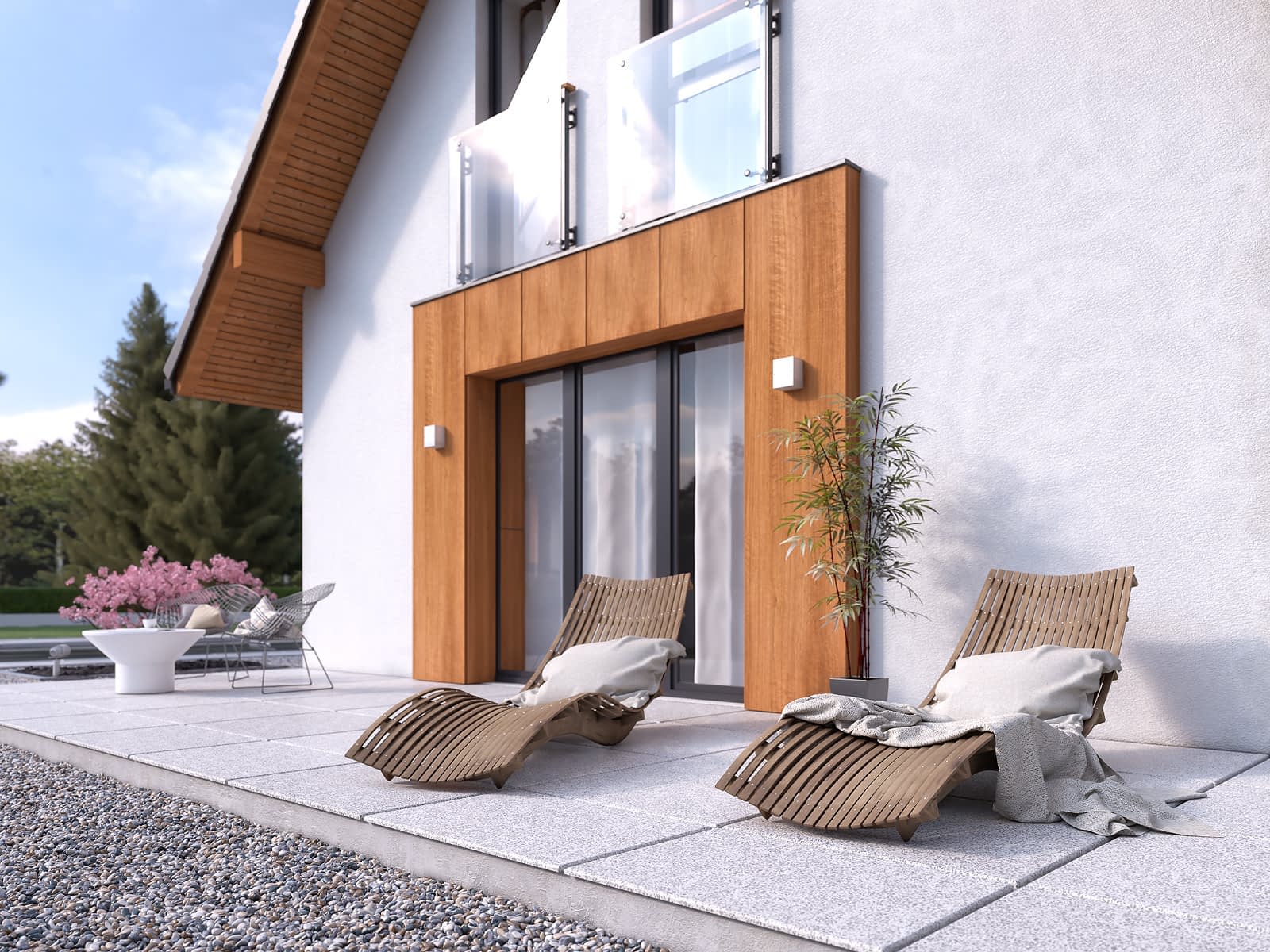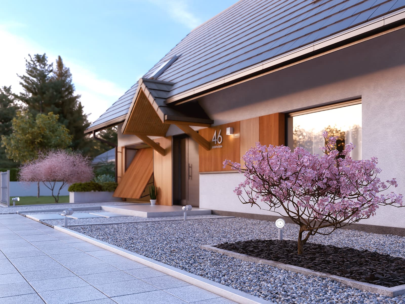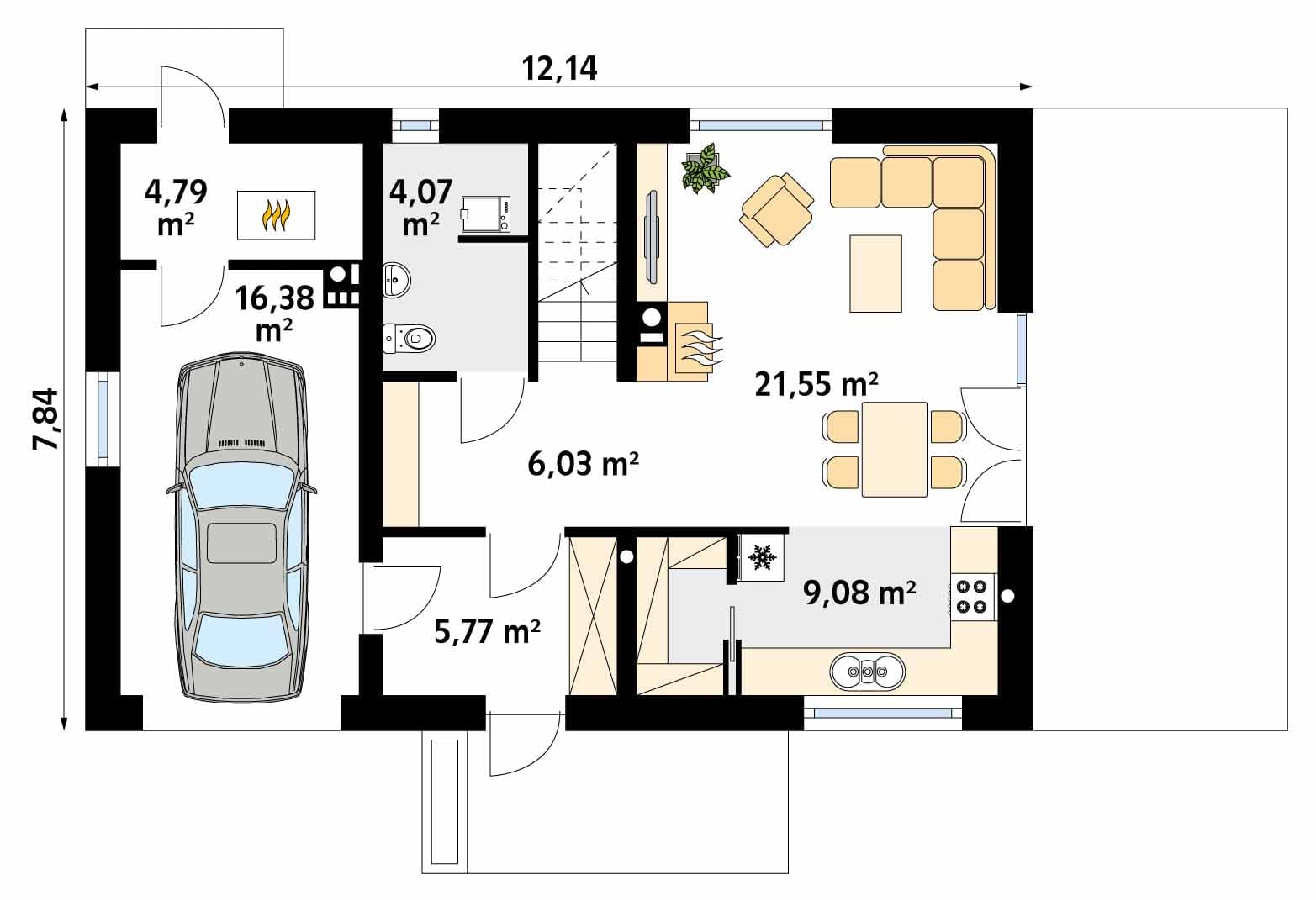 Zwarty energooszczędny dom o prostej bryle. Na poddaszu zaprojektowano przestronne trzy sypialnie z dużą łazienką i pomieszczeniem gospodarczym. Na parterze funkcjonalnie rozplanowano pomieszczenia dzienne i pomieszczenia pomocnicze. Dobrym rozwiązaniem jest połączenie domu z garażem poprzez śluzę, jaką jest wiatrołap. W kuchni znajduje się spiżarnia.Konstrukcja