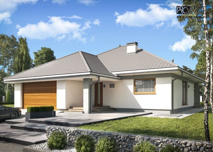 wiatrołap, komunikacja, kuchnia, spiżarnia, salon, 2x pokój, sypialnia, 2x łazienka, garaż, kotłownia/pralnia, taras.