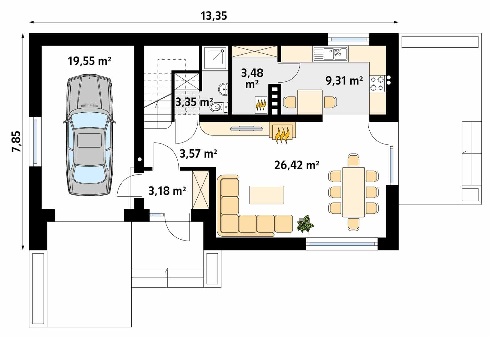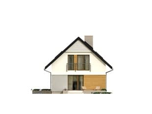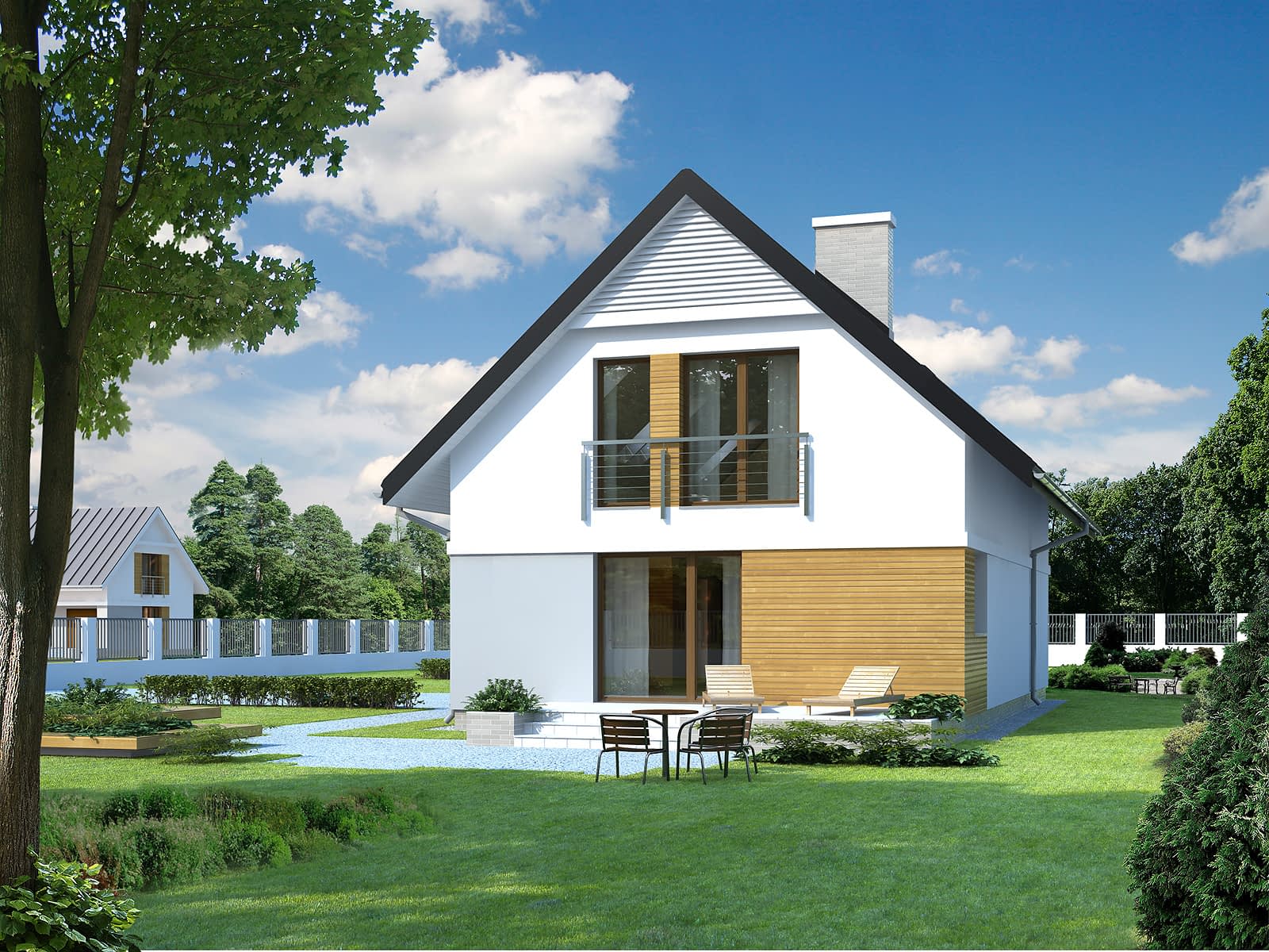 Niewielki, ale wygodny dom na wąską działkę. Prosta, nowoczesna bryła przekryta dwuspadowym dachem oraz tradycyjna technologia budowy czynią dom tanim i dostępnym. Zlokalizowana na parterze część dzienna mieści w sobie pokój dzienny z jadalnią i kuchnię, dodatkowo znajdują się tu: łazienka, kotłownia i jednostanowiskowy garaż. Na poddaszu znajdują się: cztery, dobrze doświetlone sypialnie, jedna z garderobą i łazienka. Do bryły domu przylega letni salon – rozległy taras. Dom ma niewielkie wymiary i z powodzeniem zmieści się na wąskiej działce, także z wjazdem od południa.Konstrukcja