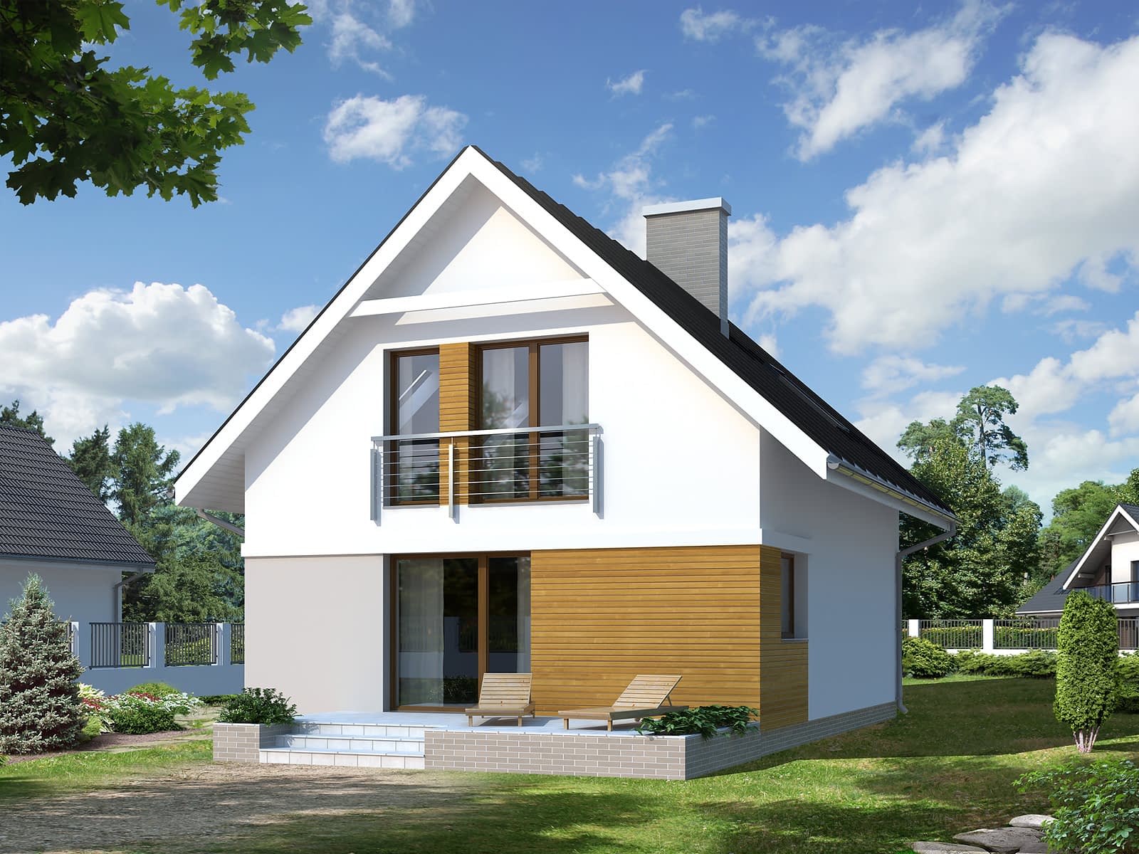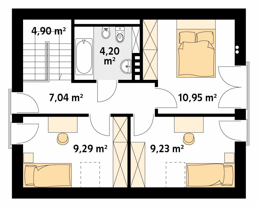 Niewielki, ale wygodny dom dla 4-osobowej rodziny. Prosta bryła przykryta dwuspadowym dachem oraz tradycyjna technologia budowy czynią dom tanim i dostępnym. Zlokalizowana na parterze część dzienna mieści w sobie przestronny pokój dzienny z jadalnią, kuchnię i dodatkowo kotłownię i łazienkę. Na poddaszu znajdują się dobrze doświetlone trzy sypialnie i łazienka. Dom ma niewielkie wymiary i z powodzeniem zmieści się na wąskiej działce, także z wjazdem od południa.Konstrukcja