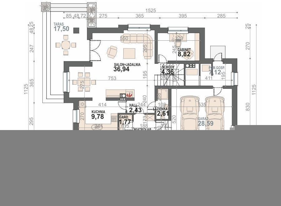 - na parterze zaprojektowano wiatrołap, hol, reprezentacyjny salon z kominkiem i wyjściem na zadaszony taras, kuchnię, otwarty aneks jadalny, dodatkowy pokój / gabinet, ogólnodostępny WC i garderobę, pomieszczenie gospodarcze / kotłownię z osobnym wyjściem na ogród oraz garaż