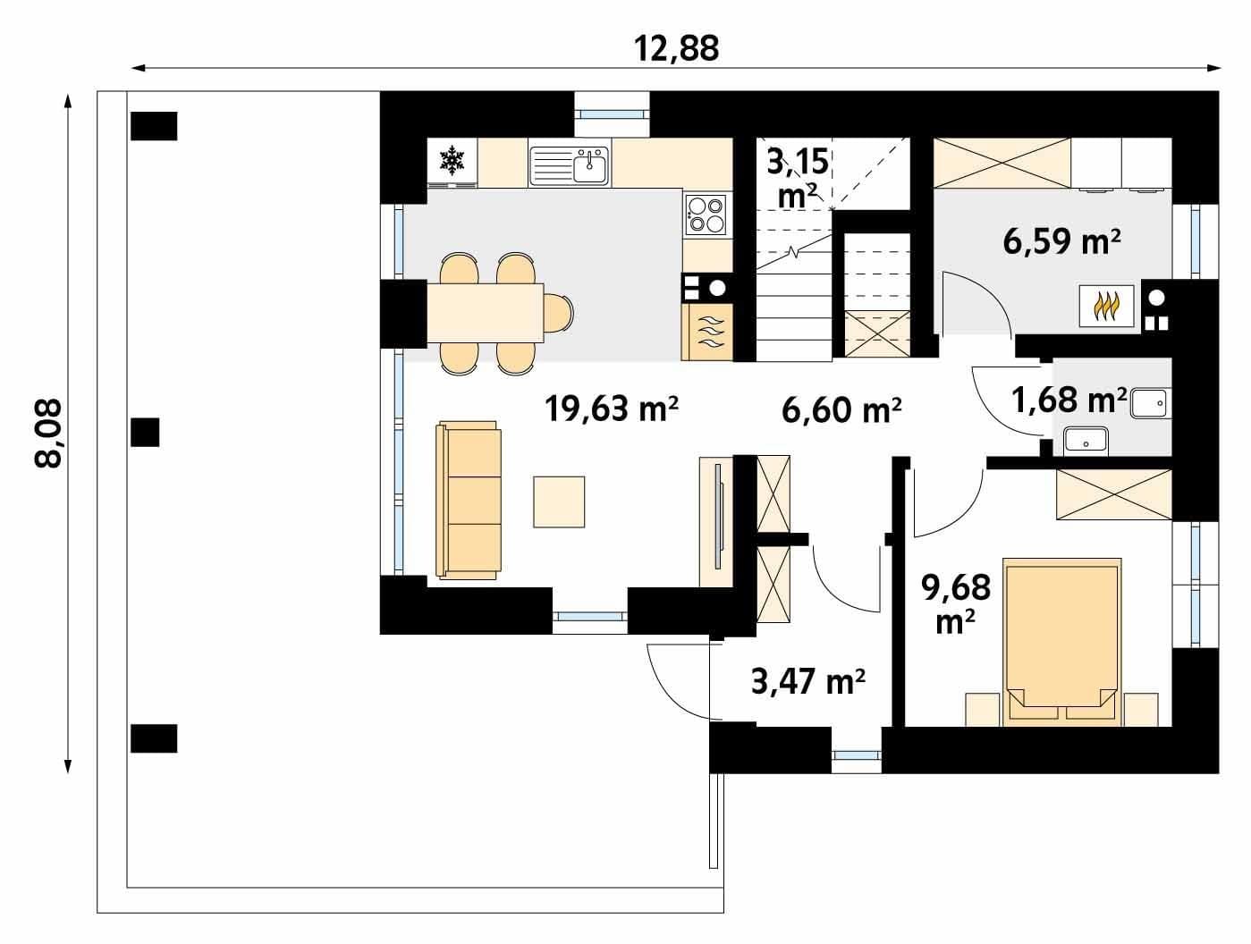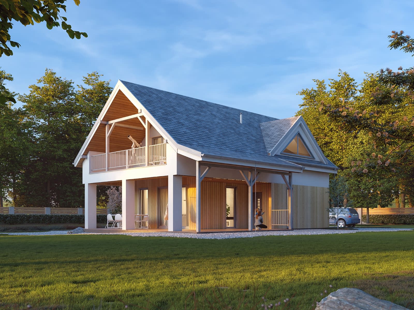 Alikante 2 to projekt domu z użytkowym poddaszem o powierzchni 88 m2. Projekt cechuje zwarta bryła przykryta dwuspadowym dachem. W projekcie zaprojektowano otwartą część dzienną. Tworzą ją salon z kominkiem, niewielka jadalnia oraz kuchnia. Niewątpliwa zaletą części dziennej są duże przeszklenia, które otwierają wnętrze na ogród i wprowadzają naturalne światło. Na poddaszu zaprojektowano trzy sypialnie oraz rodzinną łazienkę. W łazience wygospodarowano miejsce zarówno na wannę, jak i prysznic. Na parterze pojawił się dodatkowy pokój, który idealnie sprawdzi się jako sypialnia dla gości lub gabinet do pracy i nauki.