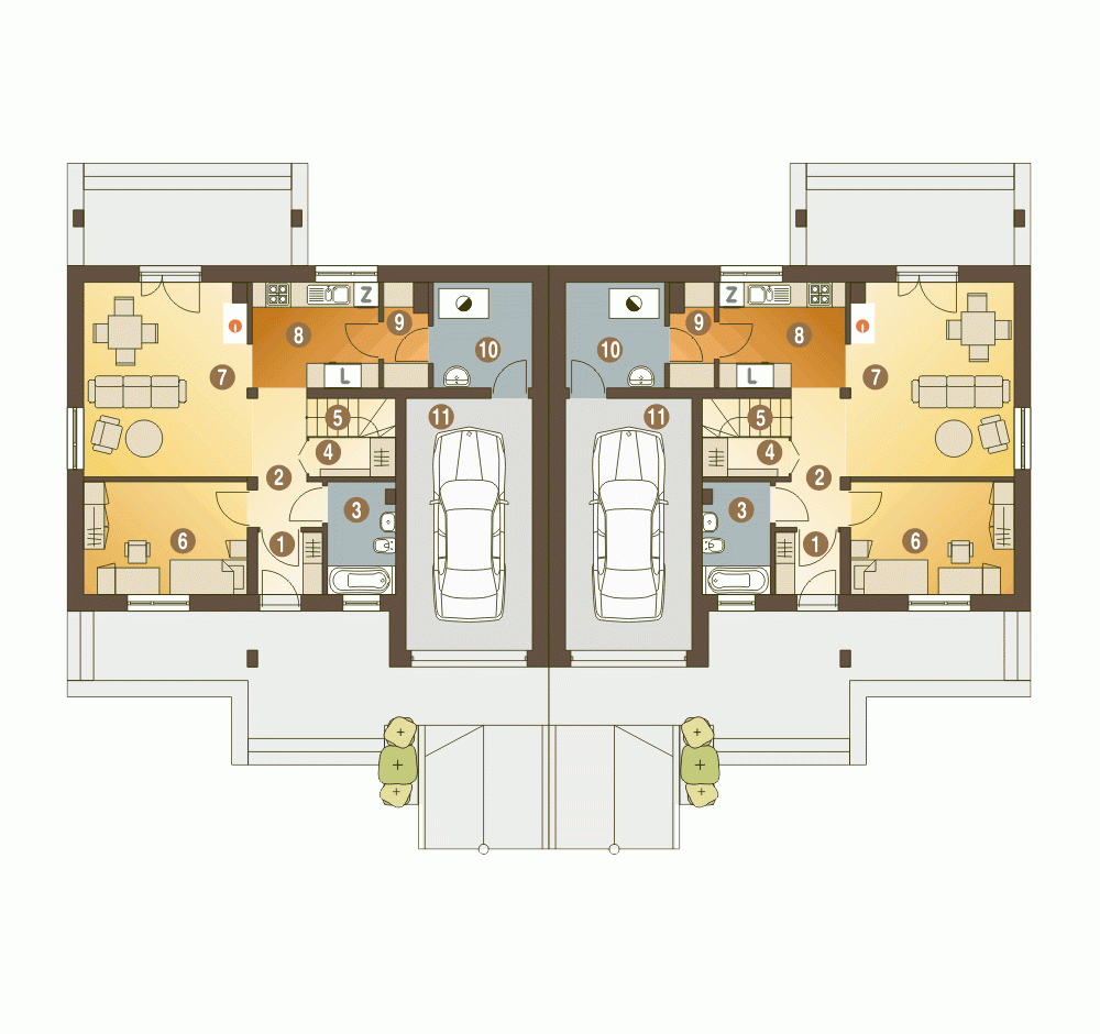 (Uwaga: projekty typu bliźniak oferujemy jako domy dwulokalowe, projekt można zamówić również w zabudowie bliźniaczej)Alka II A-BL1 został utworzony poprzez połączenie dwóch segmentów ścianami od strony garażu. Poniższy opis odnosi się do jednego segmentu .Gotowy projekt Alka II to propozycja niewielkiego domu dla 4 osobowej rodziny. Główną wspólną przestrzeń domu stanowi sąsiadujący z kuchnią salon z kominkiem. Przestrzeń nad salonem jest otwarta do dachu, zaprojektowano tam antresolę z dostępem do pomieszczeń na piętrze. Obok kuchni przewidziano przejściową spiżarnię do pomieszczenia kotłowni z piecem CO na paliwo stałe. Na parterze zaplanowano również dostępny z holu pokój gościnny mogący również pełnić rolę gabinetu. Pod schodami zaprojektowano małą garderobę - szafę, a obok schodów łazienkę. Na piętrze zaproponowano duży salon kąpielowy, garderobę oraz dwie sypialnie dostępne z holu i antresoli. Budynek wyposażony został we wbudowany garaż jednostanowiskowy.