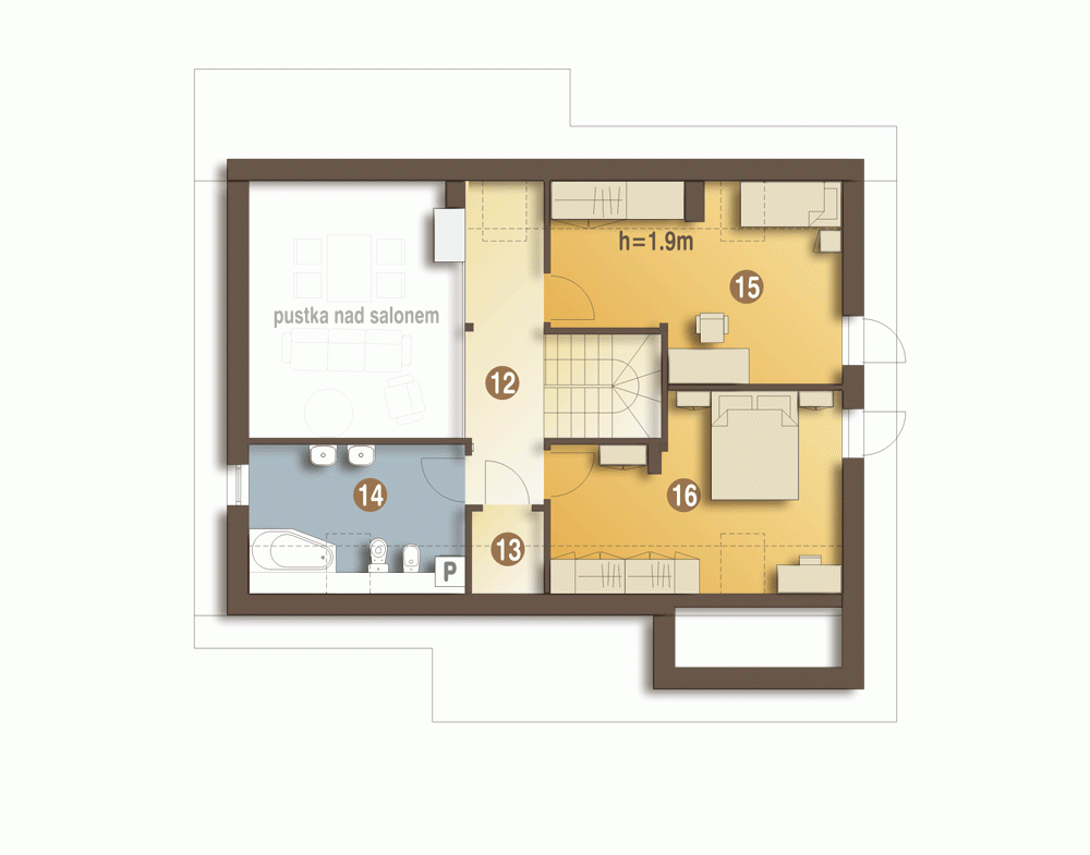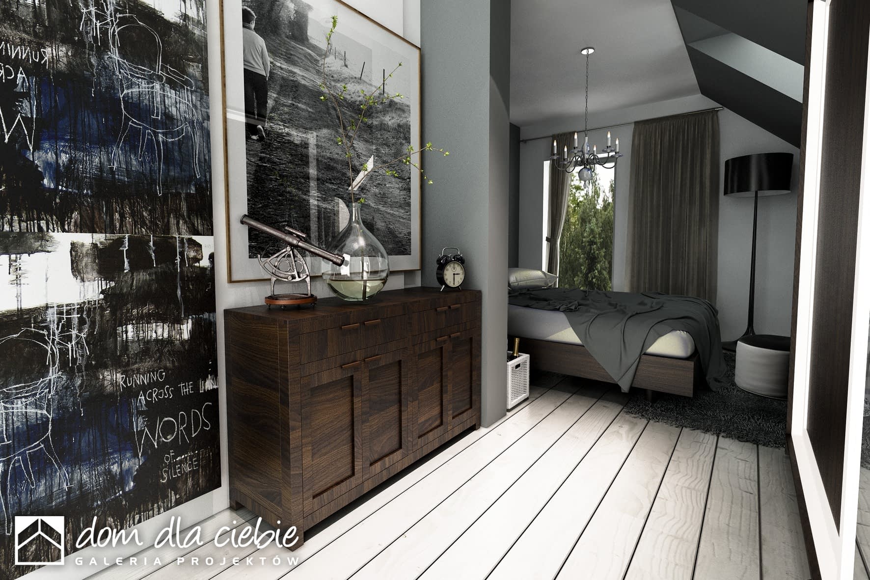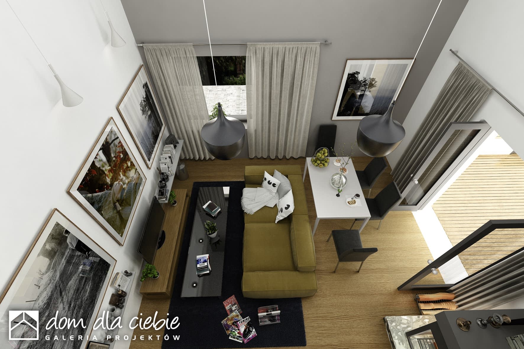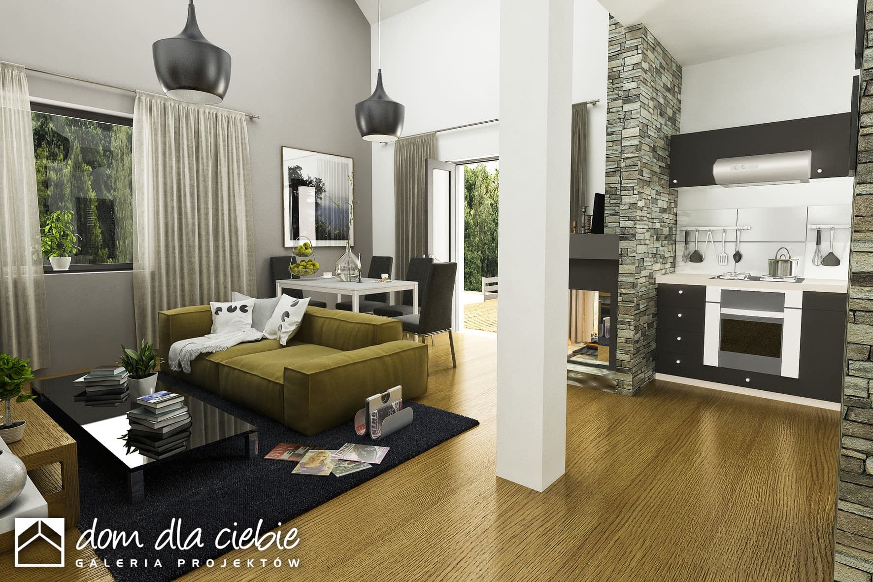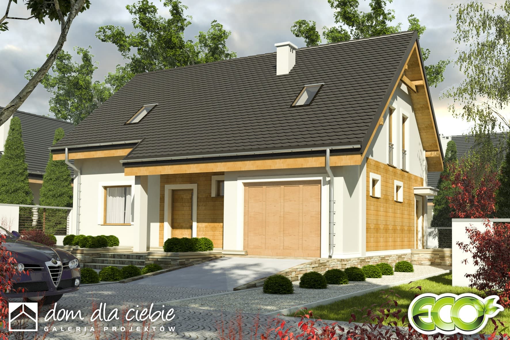 Gotowy projekt Alka II to propozycja niewielkiego domu dla 4 osobowej rodziny. Główną wspólną przestrzeń domu stanowi sąsiadujący z kuchnią salon z kominkiem. Przestrzeń nad salonem jest otwarta do dachu, zaprojektowano tam antresolę z dostępem do pomieszczeń na piętrze. Obok kuchni przewidziano przejściową spiżarnię do pomieszczenia kotłowni z piecem CO na paliwo stałe. Na parterze zaplanowano również dostępny z holu pokój gościnny mogący również pełnić rolę gabinetu. Pod schodami zaprojektowano małą garderobę - szafę, a obok schodów łazienkę. Na piętrze zaproponowano duży salon kąpielowy, garderobę oraz dwie sypialnie dostępne z holu i antresoli. Budynek wyposażony został we wbudowany garaż jednostanowiskowy.