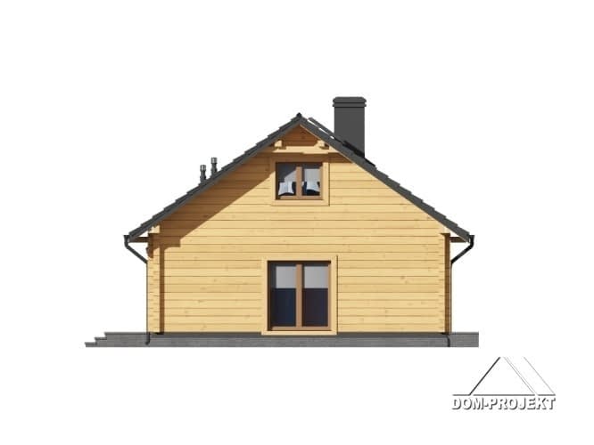 Dom z bali drewnianych. Parterowy. Duży salon z kuchnią, kominkiem oraz wyjściem na taras. Trzy pokoje, łazienka, kotłownia, korytarz, wiatrołap i spiżarka. Wyjście na poddasze nieużytkowe schodami strychowymi składanymi. Zwarta bryła budynku oraz dach dwuspadowy sprzyjają szybkiej i taniej budowie i niskim kosztom eksploatacji.Rzuty