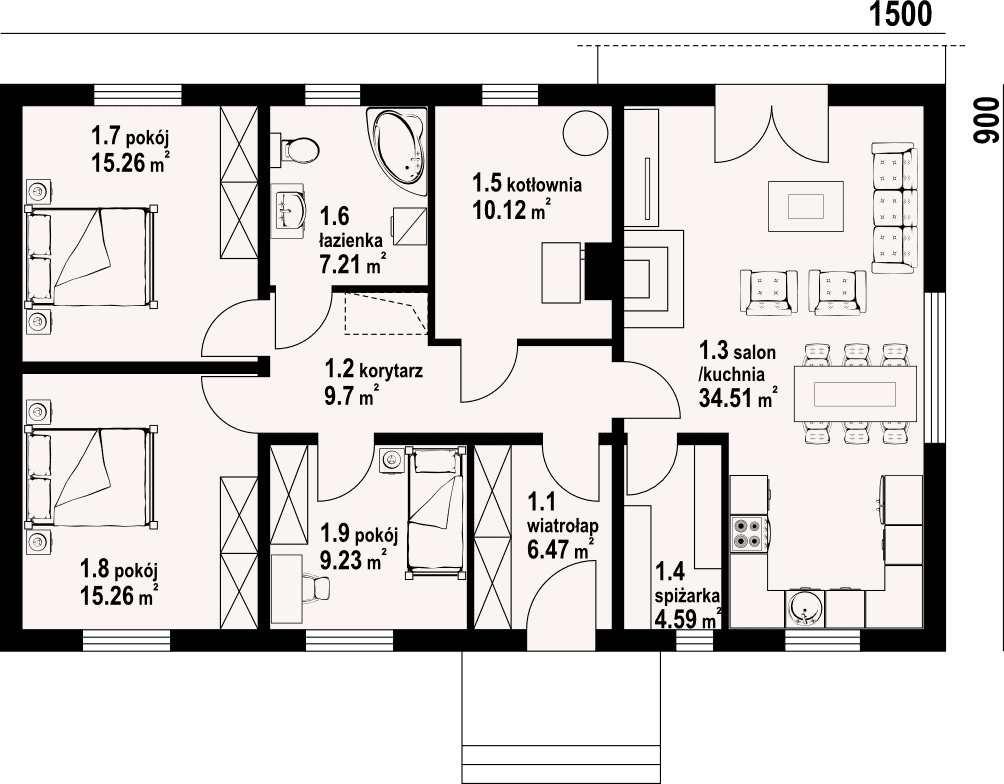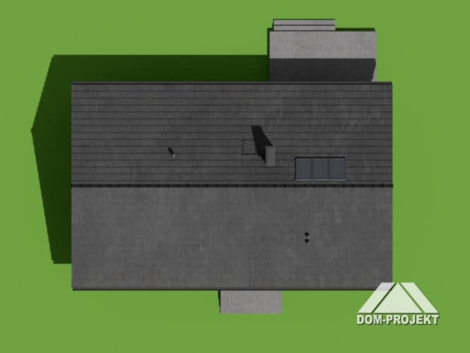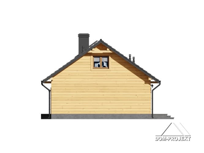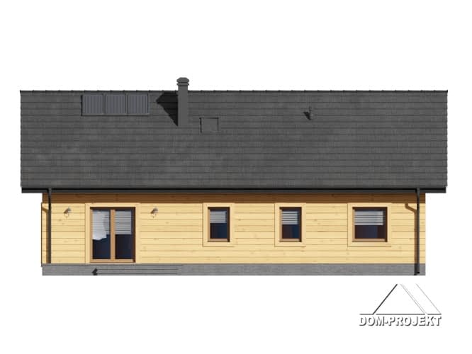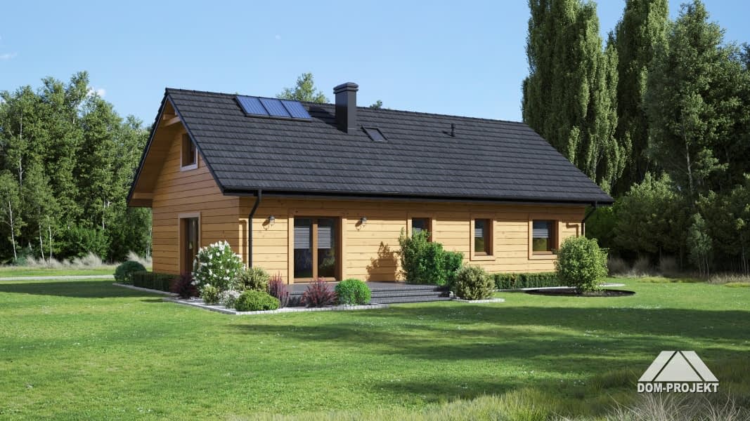 Dom w konstrukcji szkieletu drewnianego. Parterowy. Duży salon z kuchnią, kominkiem i wyjściem na taras. Trzy pokoje, łazienka, spiżarka, wiatrołap, korytarz i kotłownia. Wejście na strych nieużytkowy schodami strychowymi rozkładanymi z korytarza. Zwarta bryła budynku oraz dach dwuspadowy sprzyjają szybkiej i taniej budowie i niskim kosztom eksploatacji.Rzuty