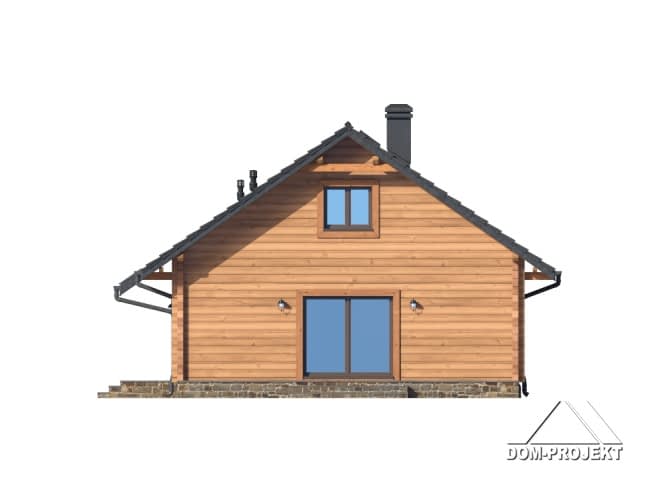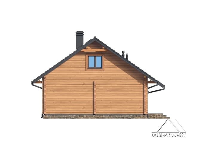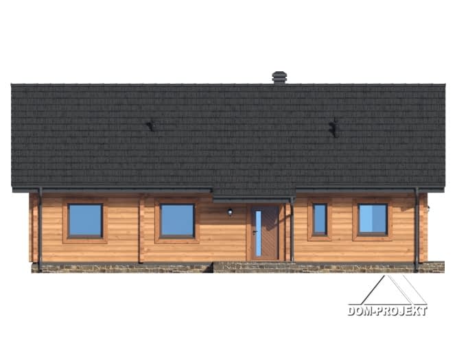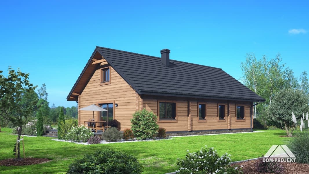Dom z bali drewnianych. Parterowy. Salon z kuchnią, kominkiem oraz wyjściem na taras, spiżarka, trzy pokoje, łazienka, pomieszczenie gospodarcze, korytarz, wiatrołap. Zwarta bryła budynku oraz dach dwuspadowy sprzyjają szybkiej i taniej budowie oraz niskim kosztom eksploatacji.Rzuty