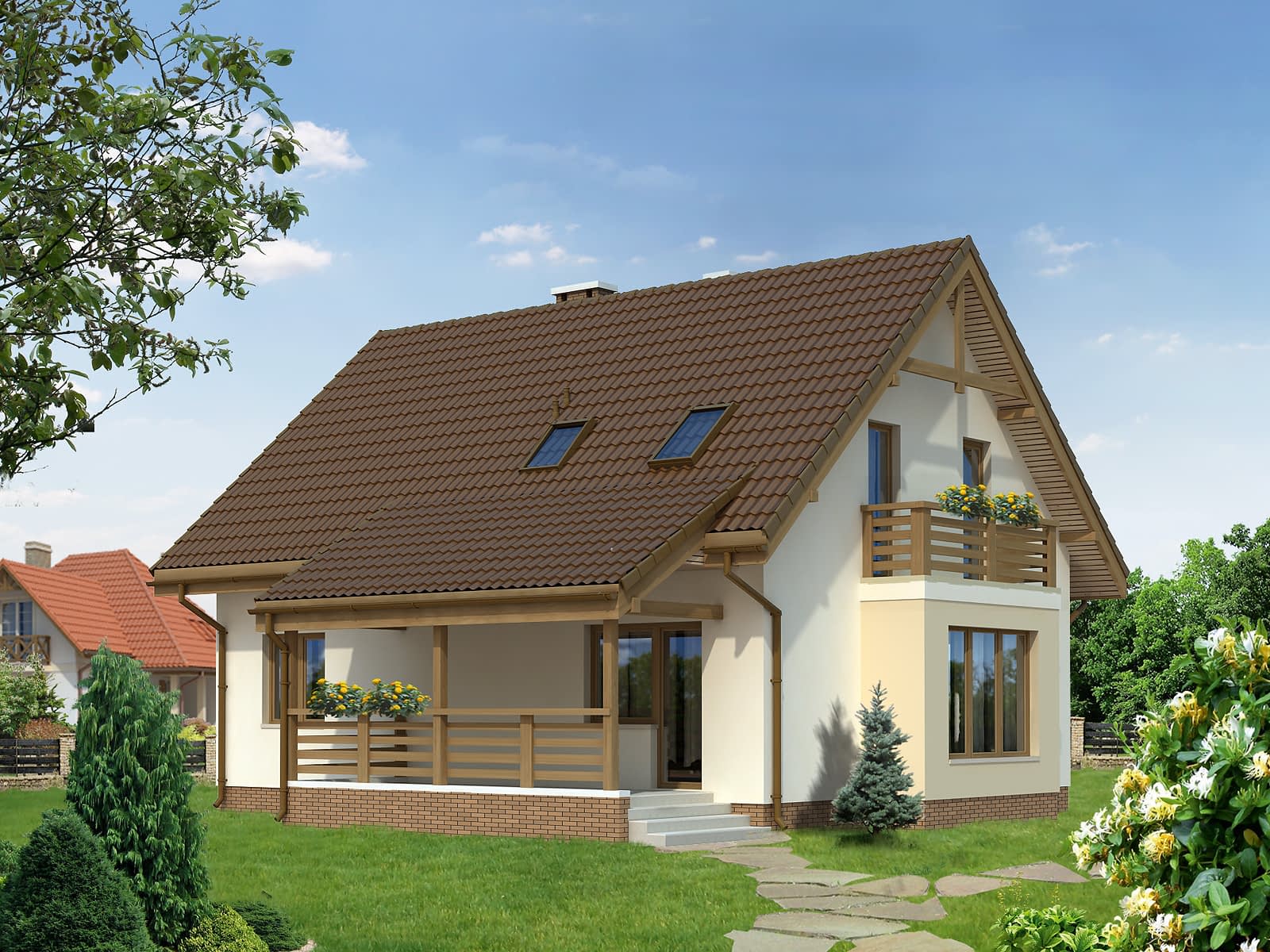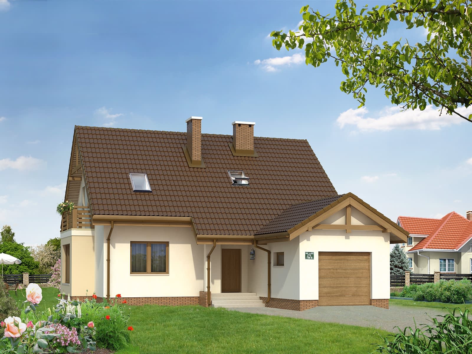 Dom jednorodzinny z poddaszem użytkowym, z garażem od frontu. Na parterze pokój dzienny z jadalnią i kuchnią oraz dodatkowy pokój dla gości lub użytkowany jako gabinet. Na poddaszu znajdują się trzy sypialnie, łazienka, pomieszczenie gospodarcze oraz garderoba. W budynku występują różne kąty nachylenia dachu: główne połacie mają 42°, nad garażem i tarasem zaś 30°.Konstrukcja