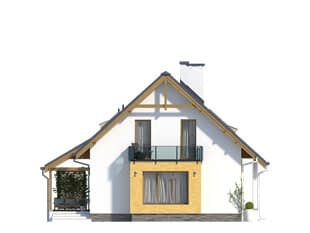 Budynek z wejściem od strony południowej, niepodpiwniczony. Projekt na parterze zawiera oprócz części dziennej dodatkowy pokój. Z kuchni mamy wygodne wyjście na zadaszony taras. Na poddaszu zaprojektowano trzy pokoje z wygodną łazienką i dwiema garderobami.Konstrukcja