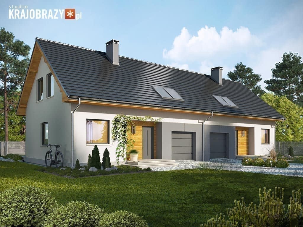 Projekt domu bliźniaczego Alvin 2 z garażem zwraca uwagę swoją prostotą, która przełoży się na pewno na niskie koszty budowy, ale także nowoczesnym wykończeniem fasad pasującym idealnie do nieskomplikowanej bryły z dachem dwuspadowym. Projekt małego bliźniaka Alvin 2 polecamy szczególnie inwestorom, którzy szukają jednocześnie taniego w budowie domu w zabudowie bliźniaczej, ale także bardzo funkcjonalnego, który z pewnością szybko znajdzie nabywców zaraz po wybudowaniu. W środku jest on rozplanowany można powiedzieć modelowo, z dużym salonem połączonym w jedno wnętrze z kuchnią oraz z trzema przestronnymi sypialniami na poddaszu. Jeżeli potrzebny jest projekt bliźniaka do 100m2 z garażem, to Alvin 2 będzie na pewno dobrym wyborem.Rzuty