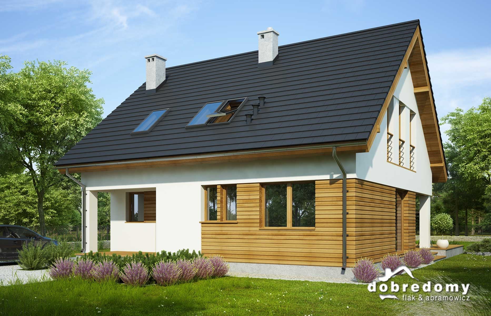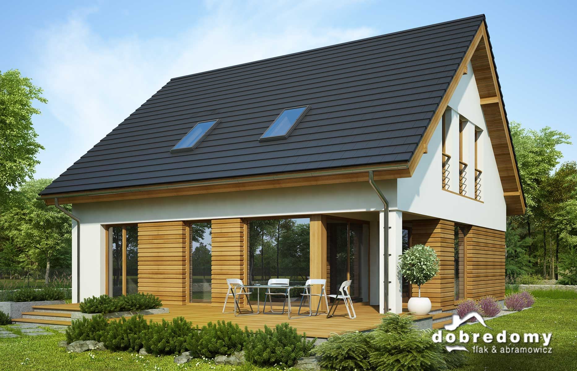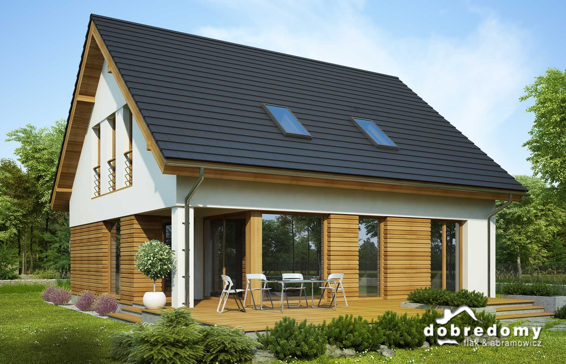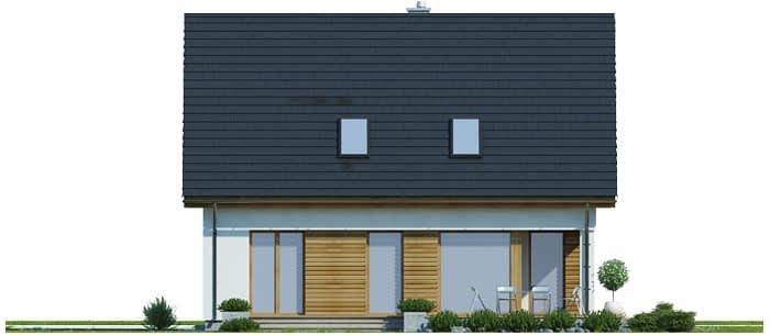 Elewacje pokryte tynkiem strukturalnym w systemie ociepleń Termo Organika oraz okładziną drewnianą. W projekcie zastosowano okna dachowe marki FAKRO. Pokrycie dachu - dachówka ceramiczna lub cementowa CREATON.