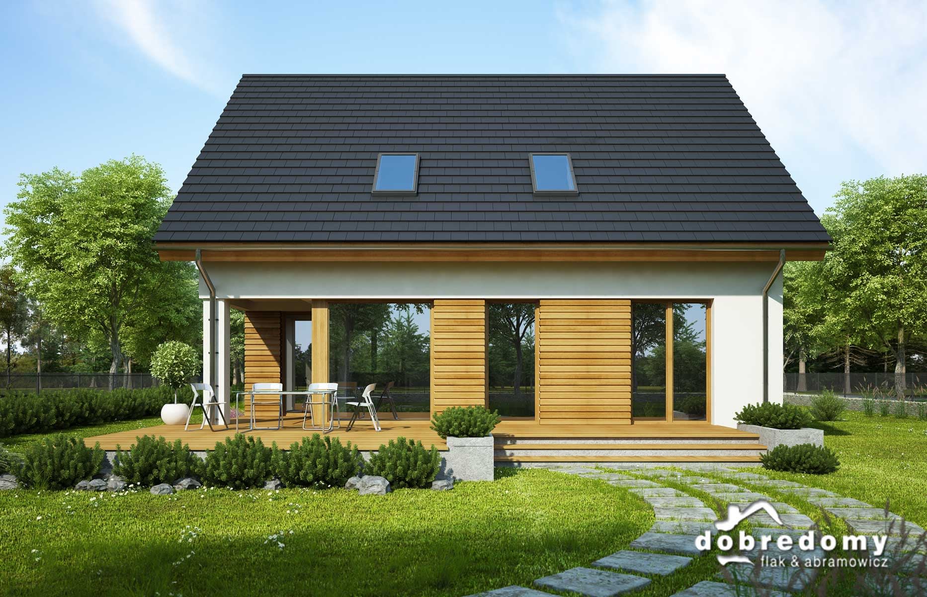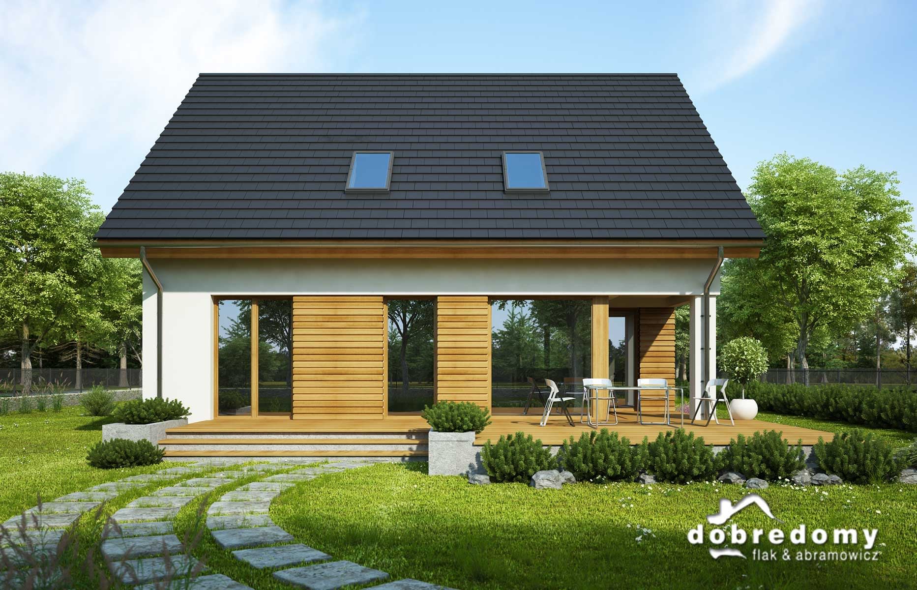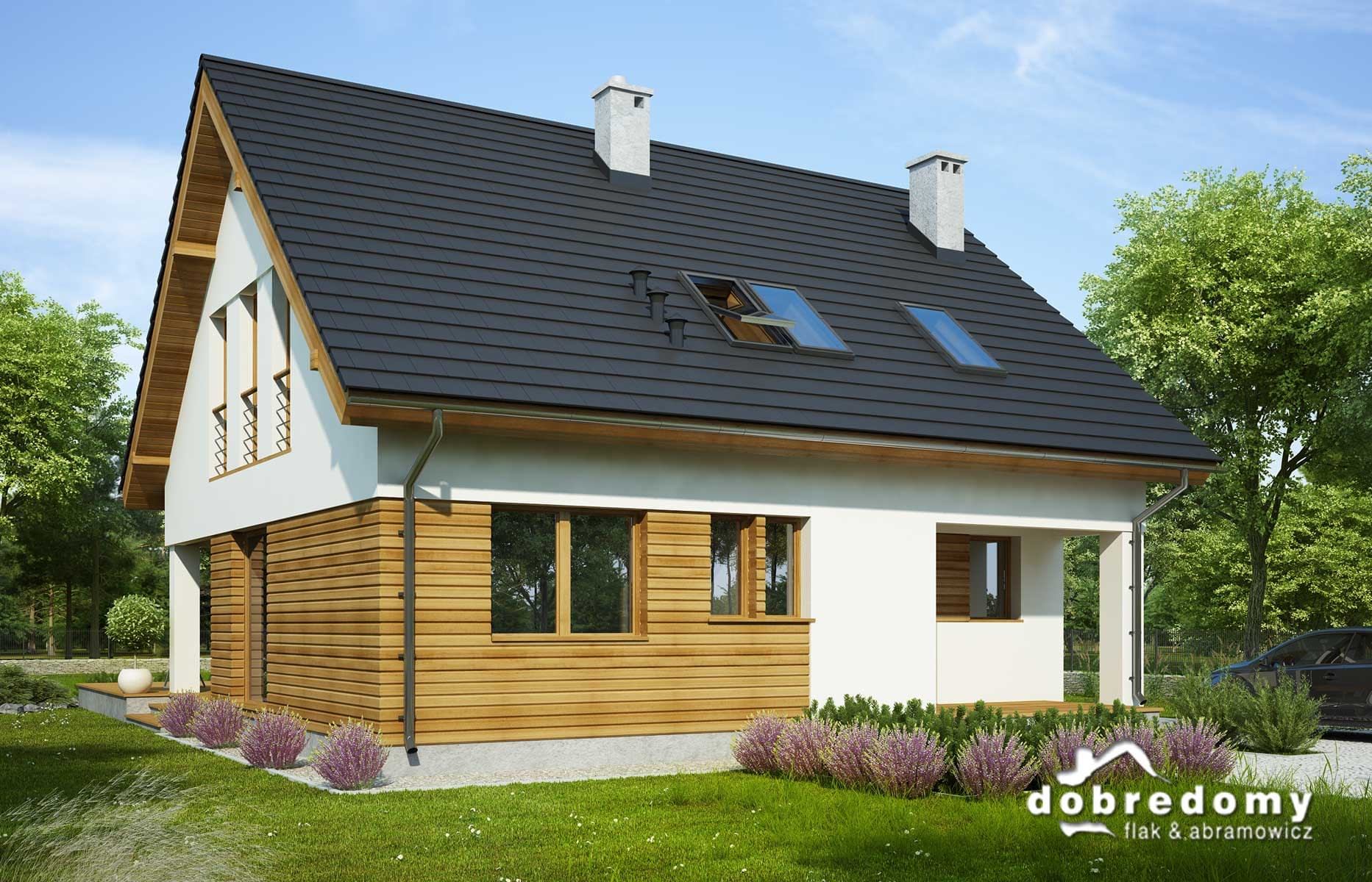 Elewacje pokryte tynkiem strukturalnym w systemie ociepleń Termo Organika oraz okładziną drewnianą. W projekcie zastosowano okna dachowe marki FAKRO. Pokrycie dachu - dachówka ceramiczna lub cementowa CREATON.