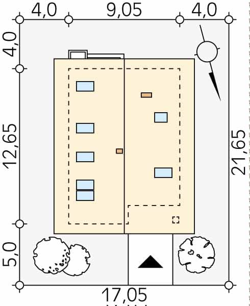 - Minimalne wymiary działki21.65 x 17.05m