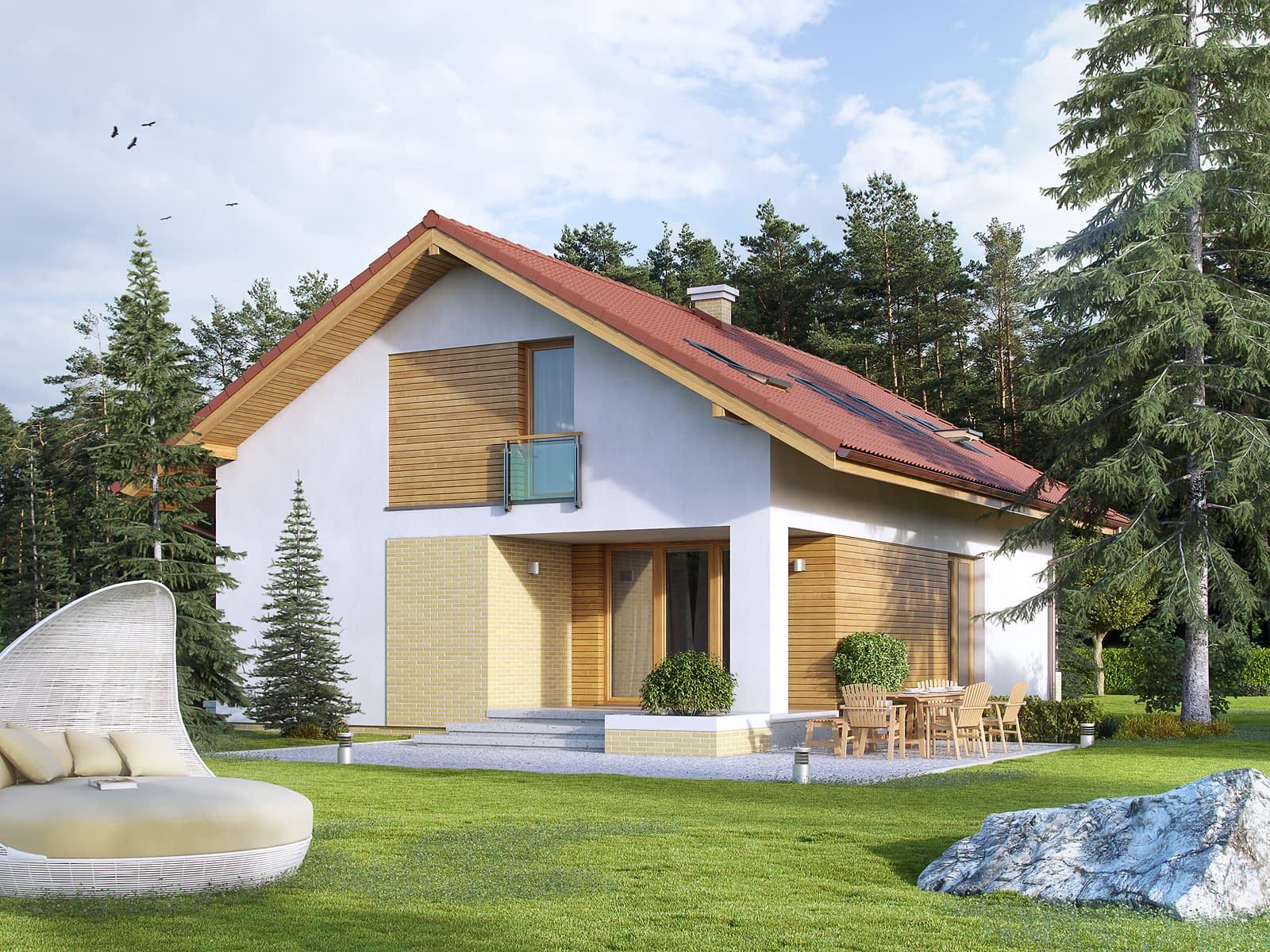 Jednorodzinny dom parterowy z użytkowym poddaszem. Bogaty układ funkcjonalny w nim zaprojektowany, został przystosowany dla potrzeb 4-osobowej rodziny. Na parterze w części dziennej przewidziano: salon z jadalnią, kuchnię ze spiżarnią oraz gabinet, w części gospodarczej kotłownię i łazienkę. Na poddaszu w części nocnej zaprojektowano 3 sypialnie, łazienkę oraz garderobę. W tym projekcie prosta, klasyczna bryła idealnie współgra z nowoczesnymi elewacjami.Konstrukcja