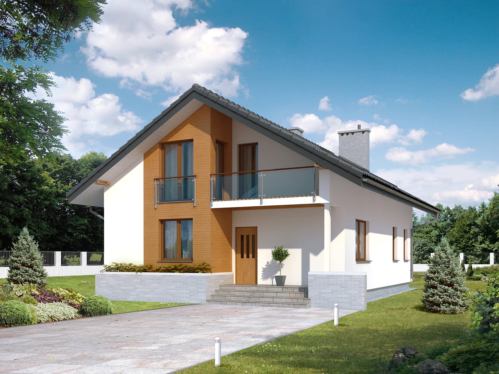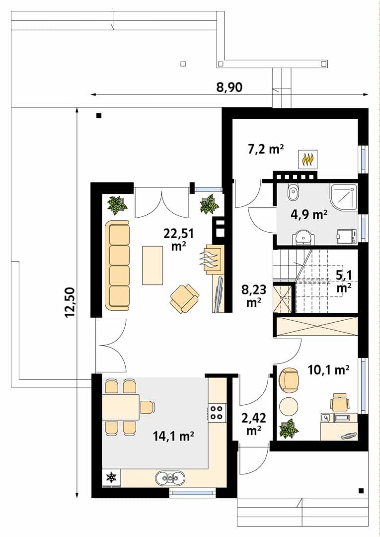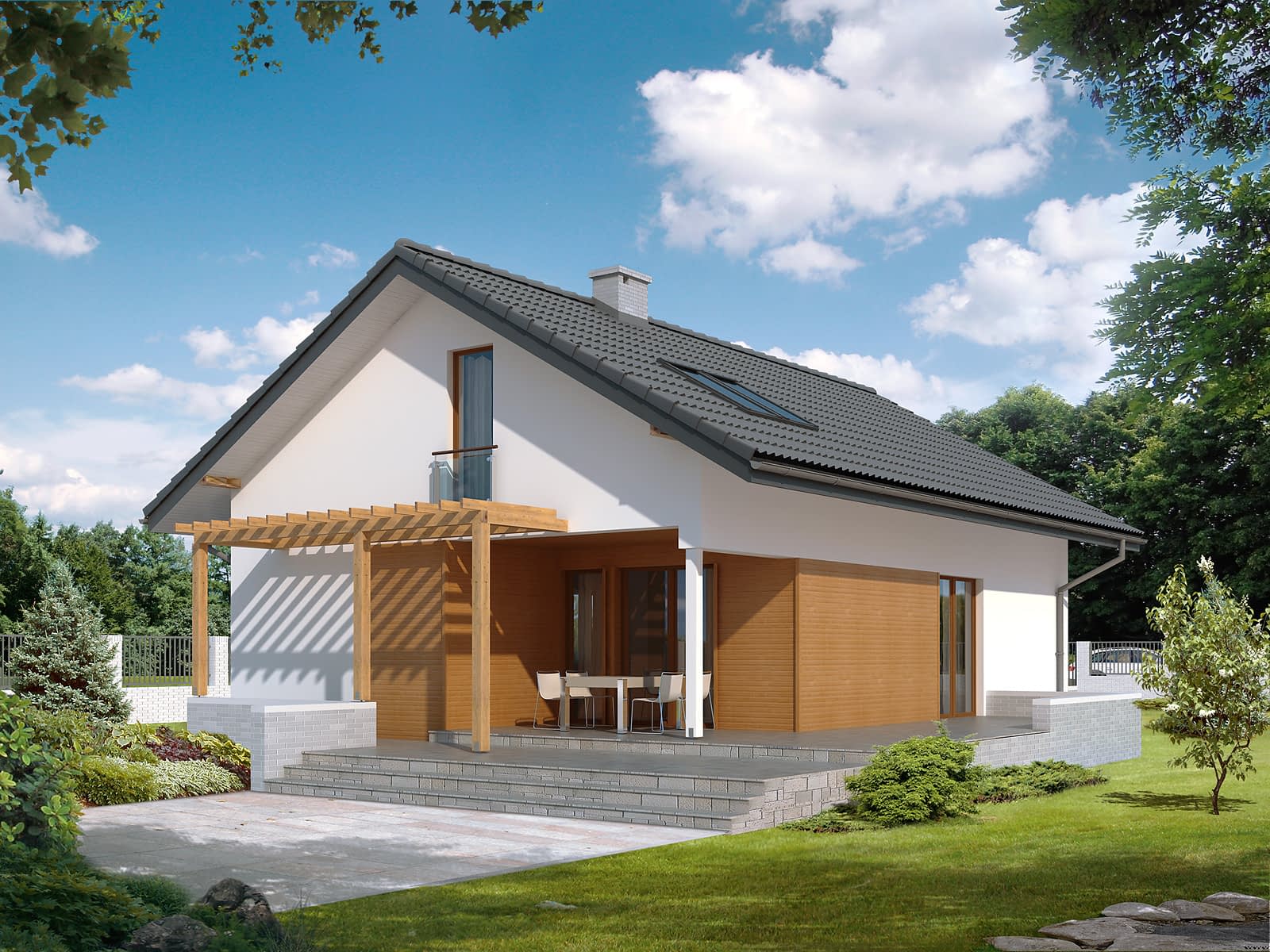 Prosty dom o klasycznej bryle i o nowoczesnych elewacjach. Zawiera w sobie pełny program funkcjonalny dla 4 – 5-osobowej rodziny. Na parterze zaprojektowano dodatkowy pokój. Atutem projektu jest duży zadaszony taras.Konstrukcja