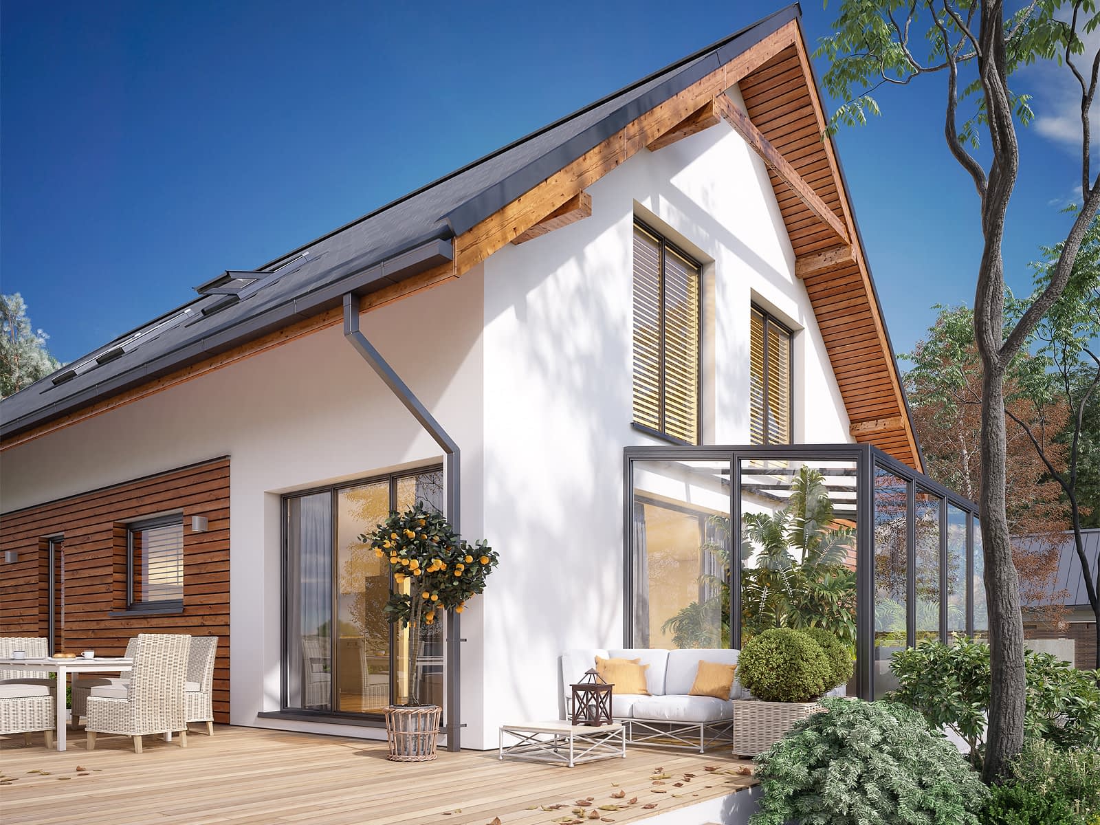Amarylis 8 to projekt domu z użytkowym poddaszem, który idealnie sprawdzi się na wąskiej działce. Projekt wyróżnia się nowoczesną stylistyką wykończenia elewacji, na której biały tynk współgra z naturalną drewnianą okładziną oraz szklaną oranżerią z dostępem z salonu. Parter budynku stanowi strefę dzienną, w której znajduje się salon, jadalnia oraz otwarta kuchnia. Układ funkcjonalny parteru uzupełnia dodatkowy pokój, łazienka oraz schowek pod schodami. Na poddaszu zaprojektowano zaciszną strefę nocną. Znajdują się w niej cztery ustawne sypialnie, dwie łazienki oraz garderoba. Dwa pokoje posiadają bezpośredni dostęp do rozległego tarasu nad garażem. W budynku znajduje się również dwustanowiskowy garaż z dostępem przez kotłownię. W projekcie przewidziano ekologiczne rozwiązania w postaci pompy ciepła oraz systemu rekuperacji z odzyskiem ciepła.Konstrukcja
