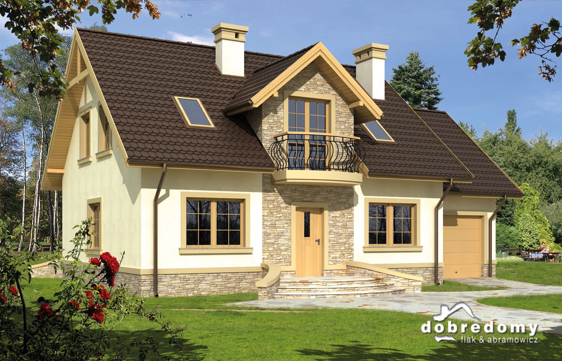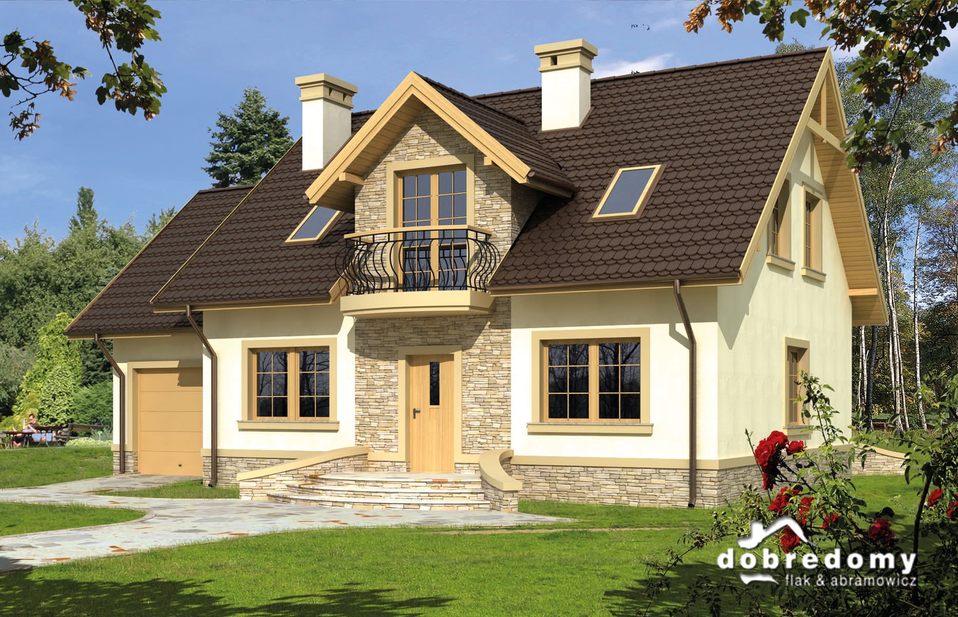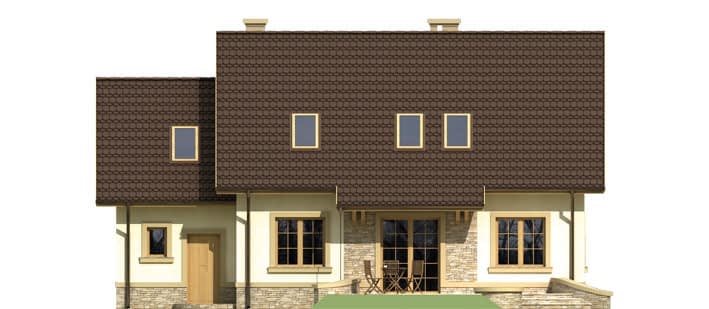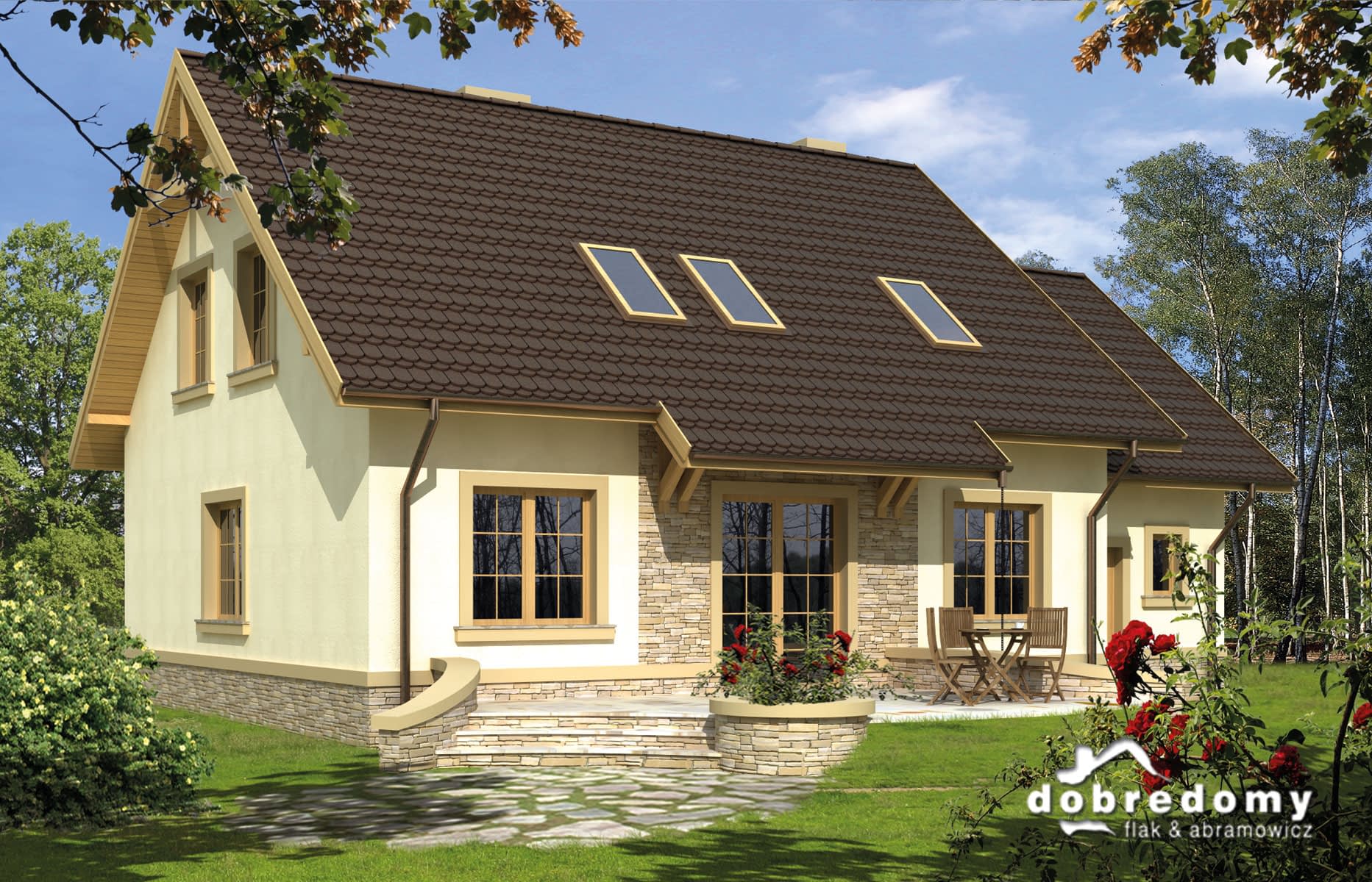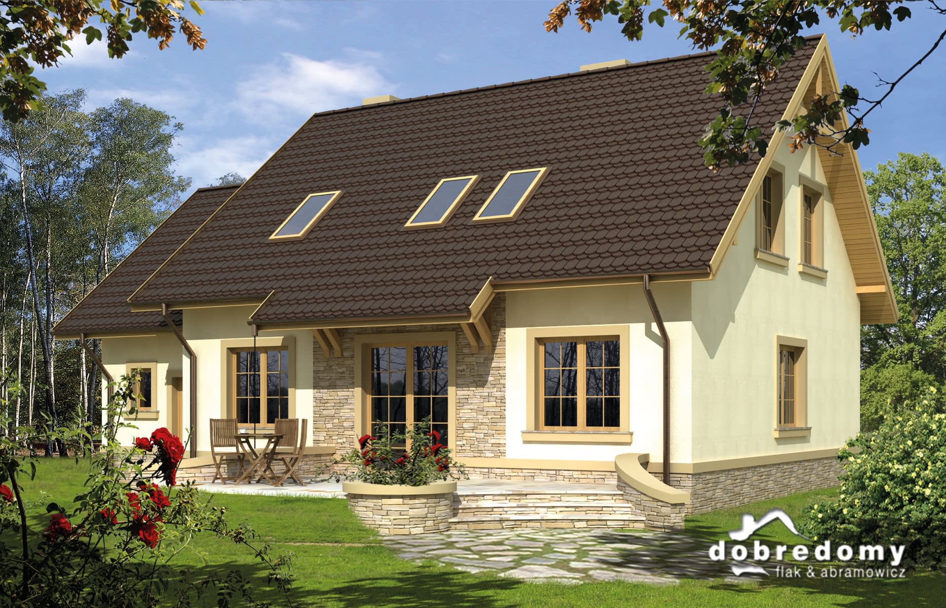 Elewacje pokryte tynkiem strukturalnym w systemie ociepleń Termo Organika oraz okładziną kamienną. W projekcie zastosowano okna dachowe marki FAKRO. Pokrycie dachu - dachówka ceramiczna lub cementowa CREATON.