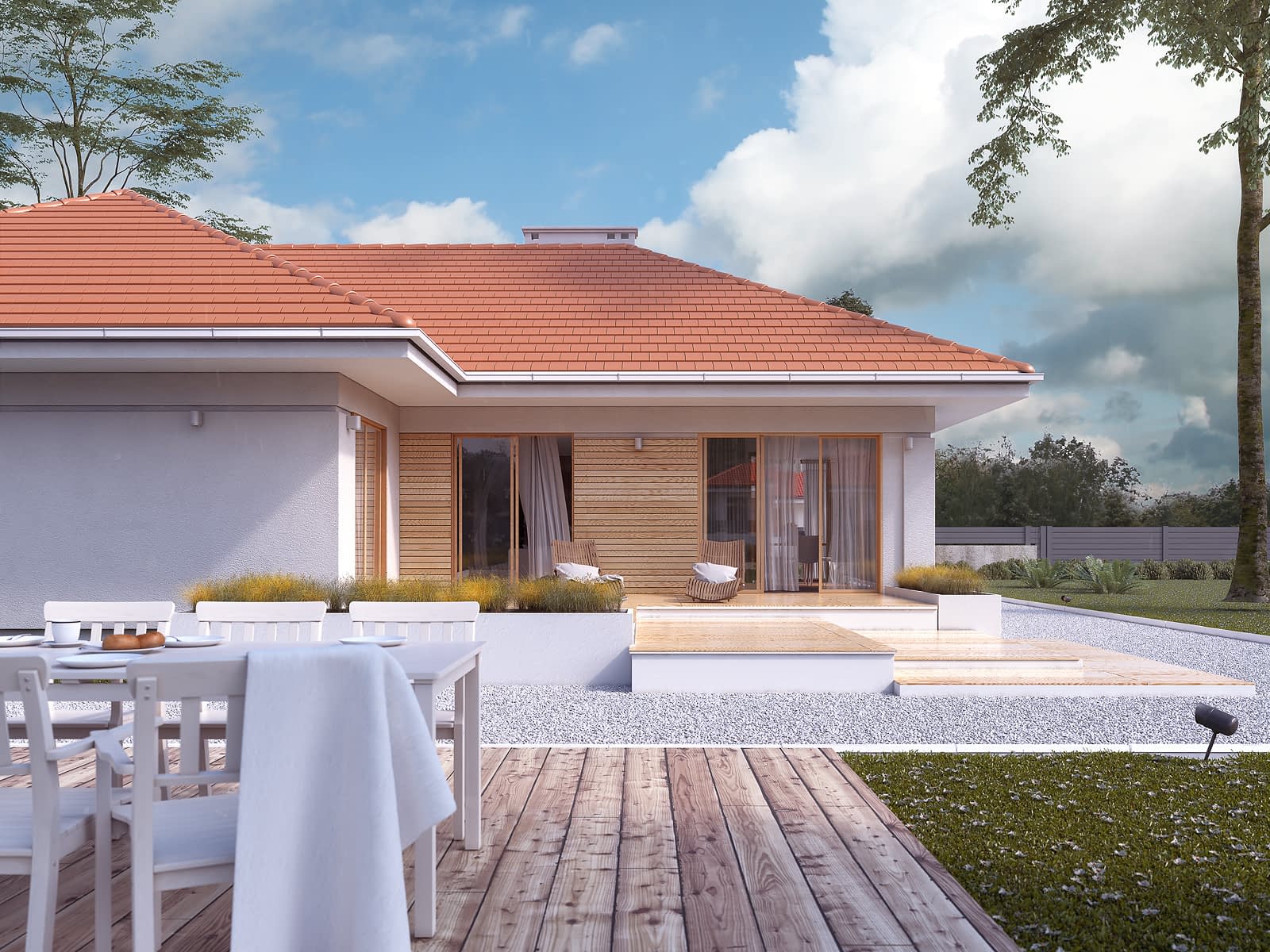 Ambrozja 13 to jednorodzinny dom mieszkalny, parterowy, przeznaczony dla 4-osobowej rodziny. W projekcie widoczny jest wyraźny podział na część dzienną oraz nocną. Na część dzienną składa się przestronny salon z jadalnią oraz kuchnia z przylegającą do niej spiżarnią. W części nocnej zaprojektowano trzy sypialnie, łazienkę oraz WC. W projekcie znajduje się także część gospodarcza z kotłownią i dwustanowiskowym garażem. Atutem projektu są dwa tarasy dostępne z salonu oraz z jadalni.Konstrukcja