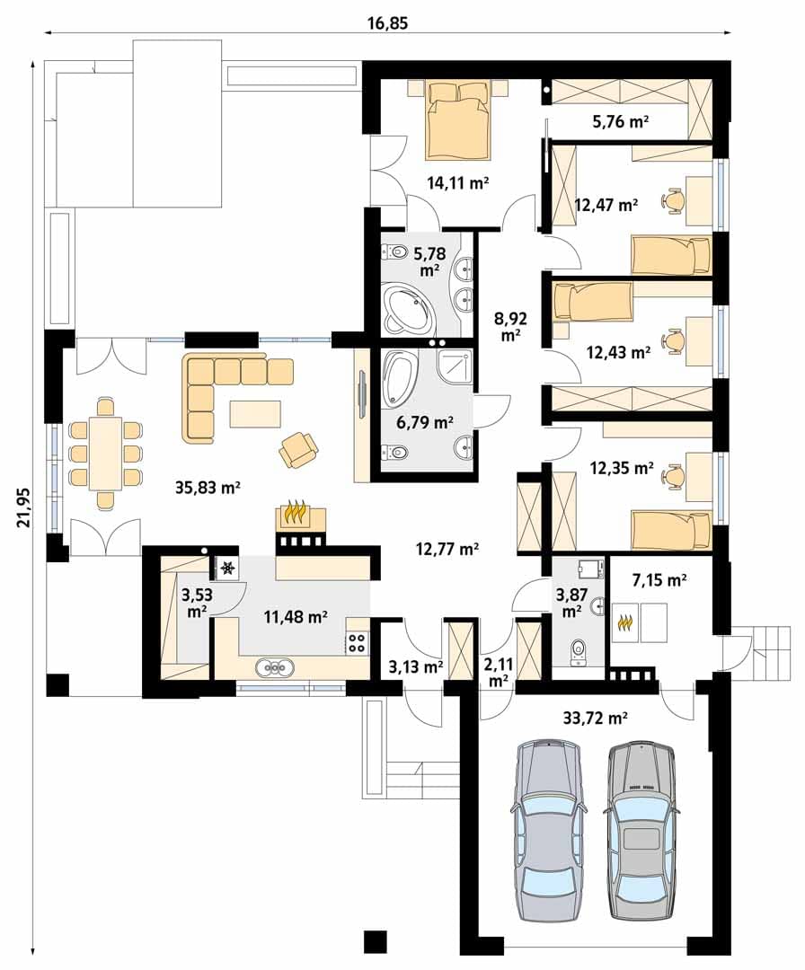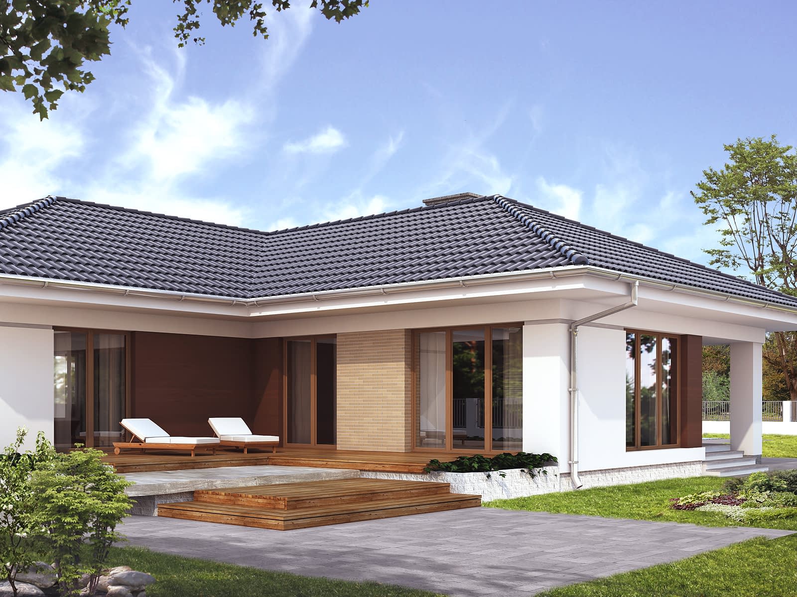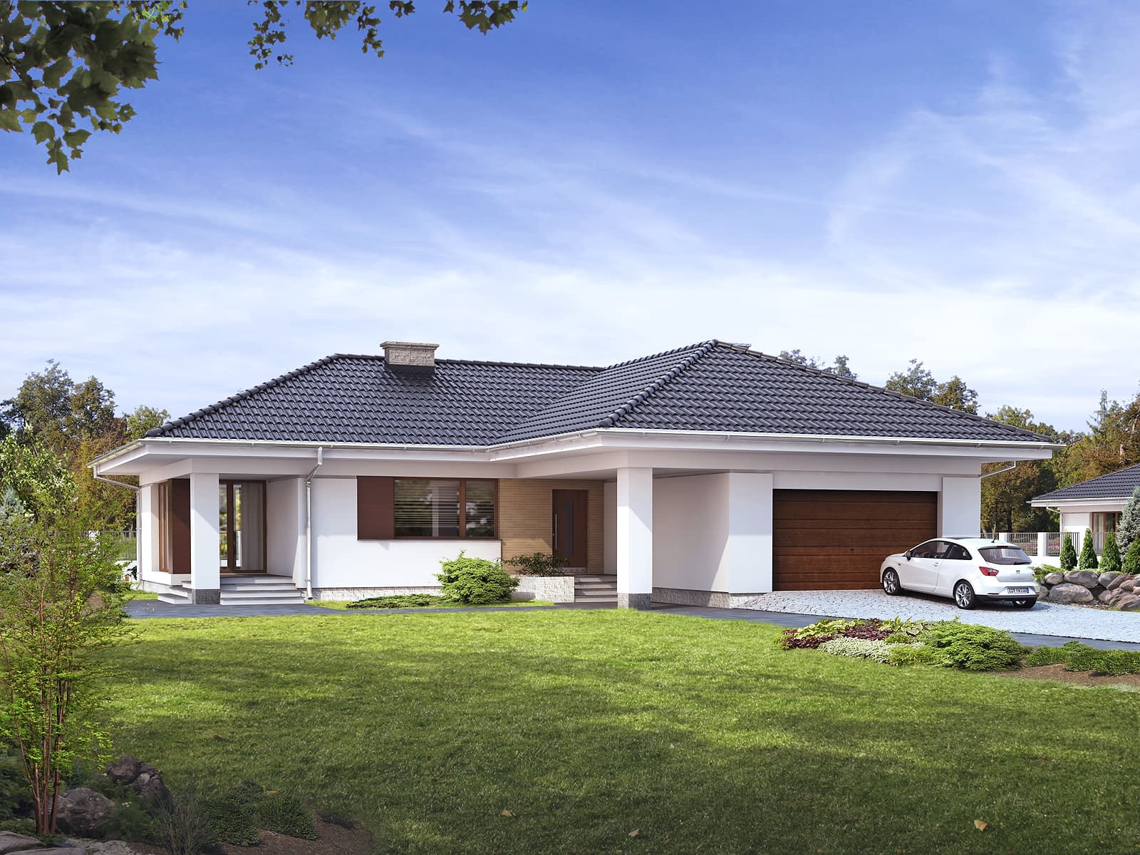 Jednorodzinny budynek mieszkalny, niepodpiwniczony. Wielkim atutem projektu są cztery sypialnie, co umożliwia wygodne funkcjonowanie 5-osobowej rodziny. W części dziennej zaprojektowano kuchnię ze spiżarnią oraz salon z jadalnią, z którego prowadzi wyjście na zadaszony taras. Część nocną stanowią cztery sypialnie, w tym jedna z własną łazienką i garderobą. W części gospodarczej przewidziano przestronną kotłownię oraz dwustanowiskowy garaż.Konstrukcja