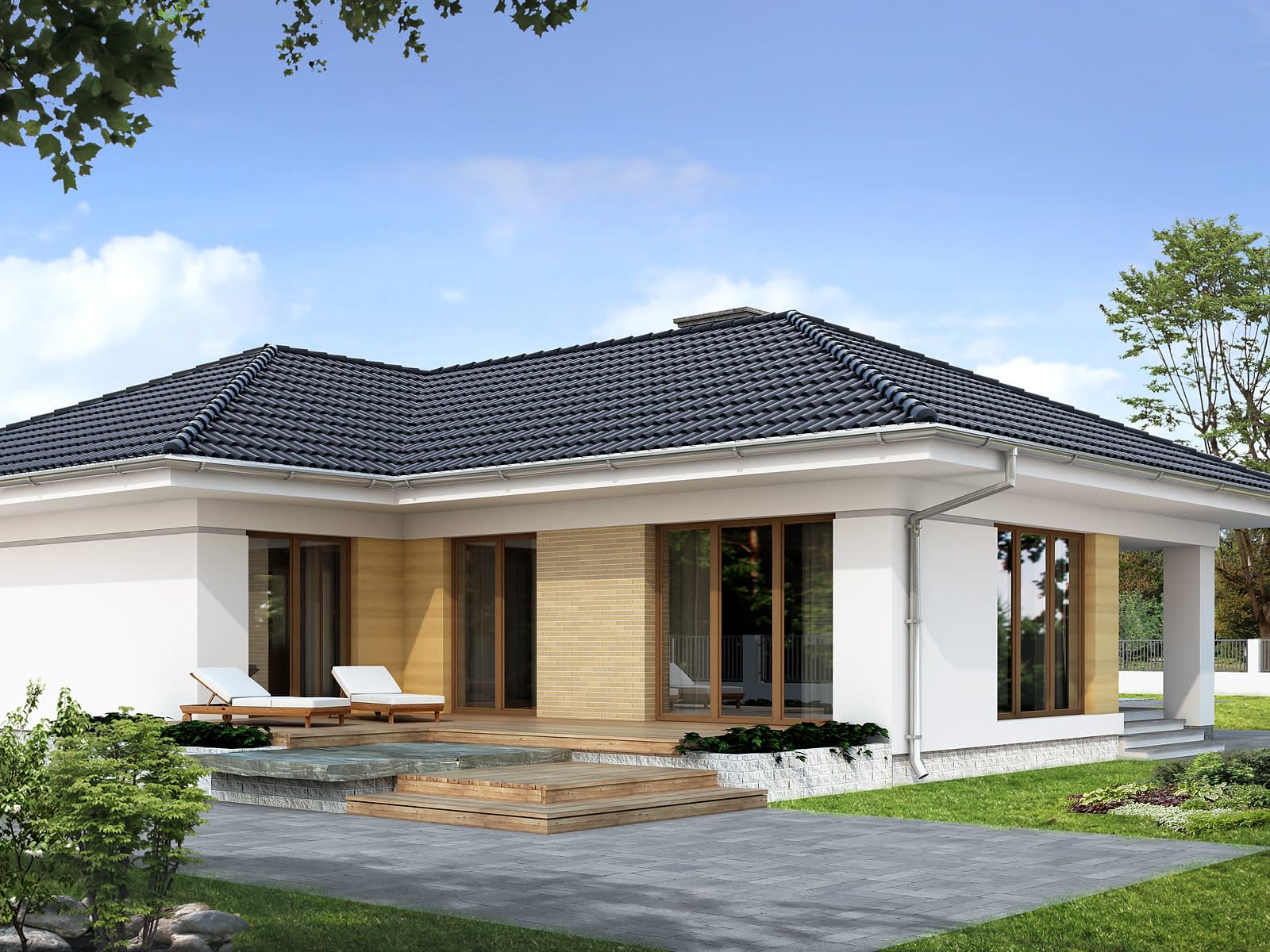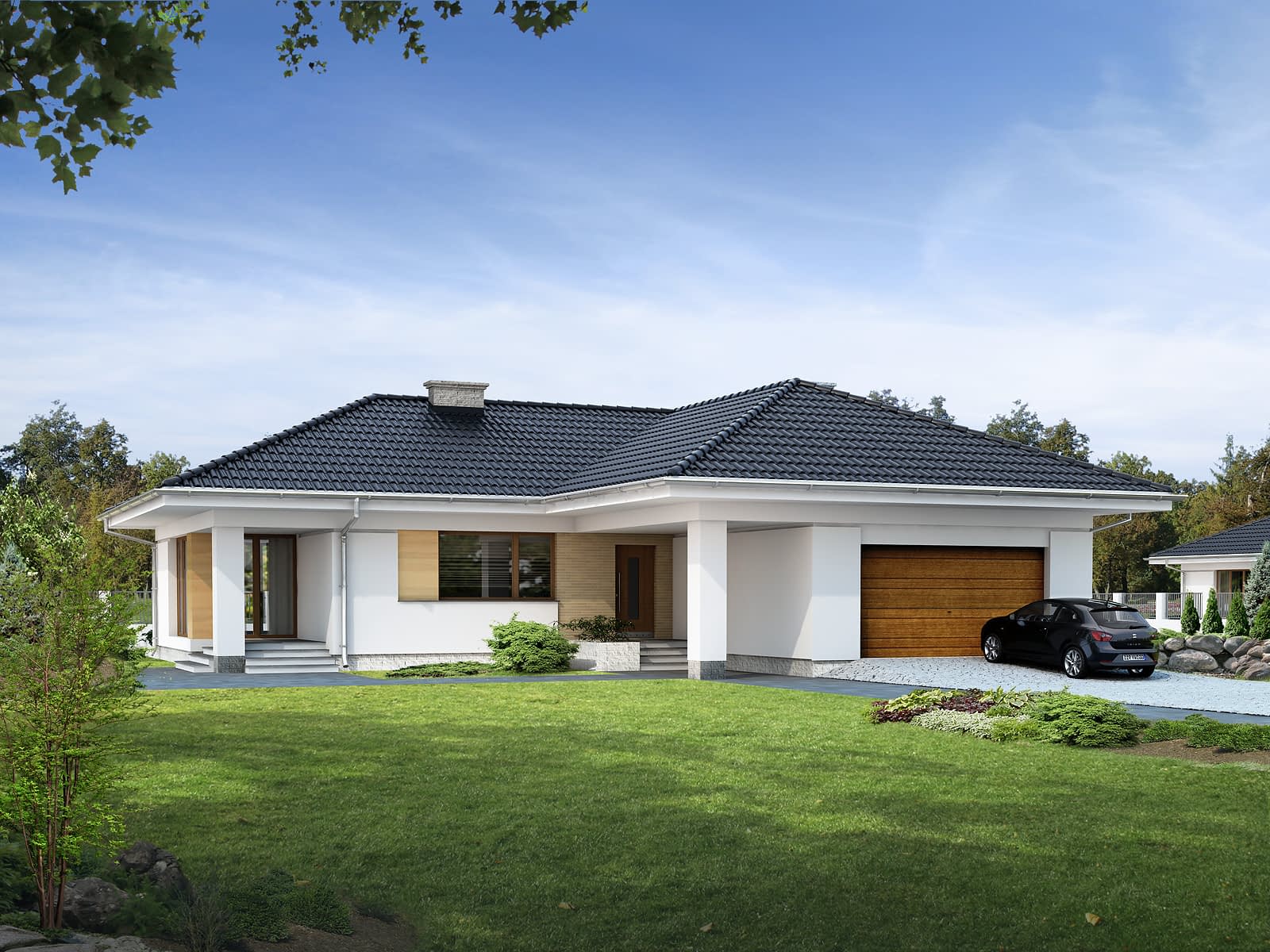 Jednorodzinny dom mieszkalny, parterowy, podpiwniczony, przeznaczony dla 4-osobowej rodziny. Wyraźny podział na część dzienną: kuchnia ze spiżarnią i salon z jadalnią; część nocną: trzy sypialnie z łazienką oraz część gospodarczą w piwnicy z kotłownią i pomieszczeniami gospodarczymi. Ciekawe, nowoczesne elewacje. Duży, przestronny taras.Konstrukcja