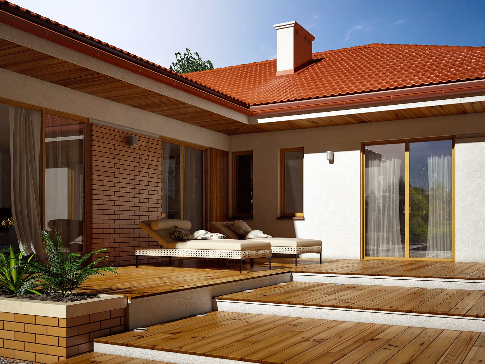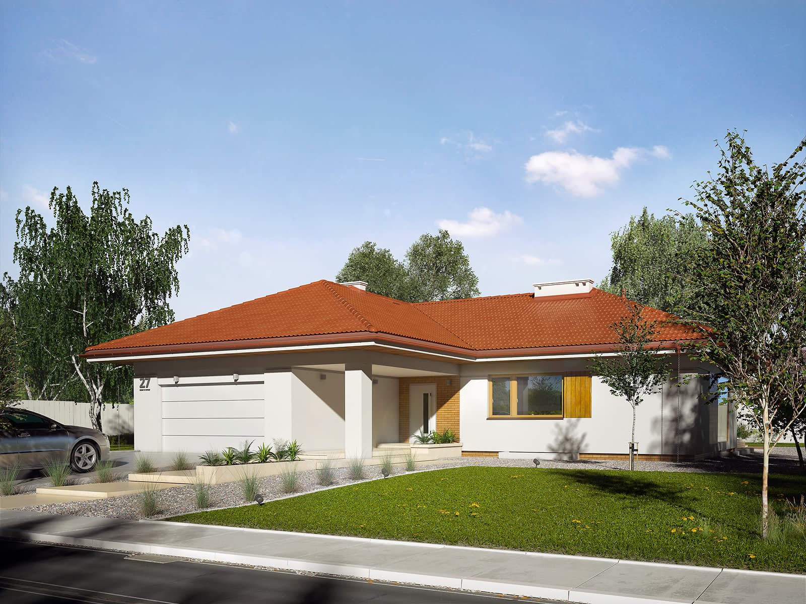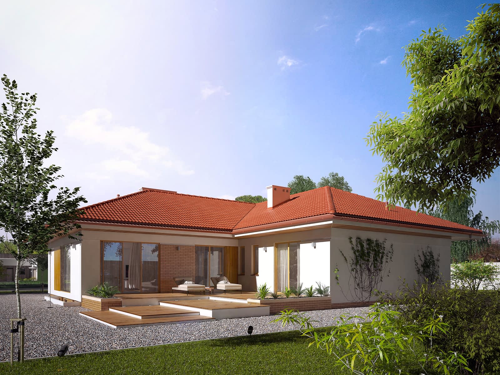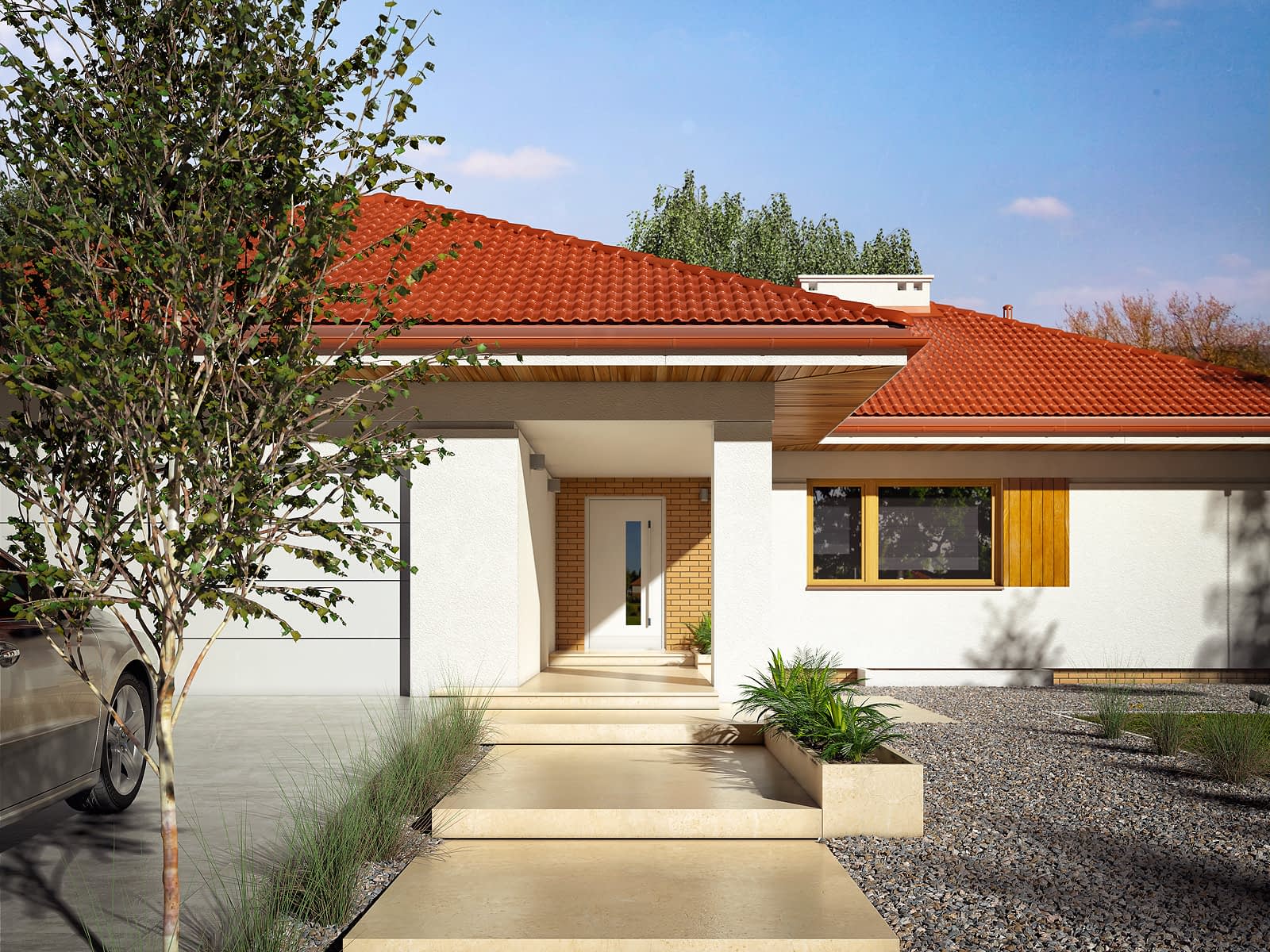 Dom parterowy, podpiwniczony stworzony z myślą o 5-sobowej rodzinie ceniącej własną przestrzeń oraz komfort użytkowania wnętrza. Centralnym punktem domu jest przestronny salon połączony z jadalnią, charakteryzujący się dużą ilością przeszkleń. W części dziennej domu znajduje się również dużych rozmiarów kuchnia z przylegającą do niej spiżarnią. W części nocnej znajdują się cztery sypialnie, z których główny apartament posiada własną garderobą oraz łazienkę. Do dyspozycji mieszkańców pozostaje również rodzinna łazienka, wc, dwustanowiskowy garaż oraz liczne pomieszczenia gospodarcze w piwnicy. Od strony elewacji ogrodowej znajduje się rozległy taras, idealny do odpoczynku w słoneczne dni, na który prowadzi wyjście z salonu oraz z sypialni gospodarzy.Konstrukcja