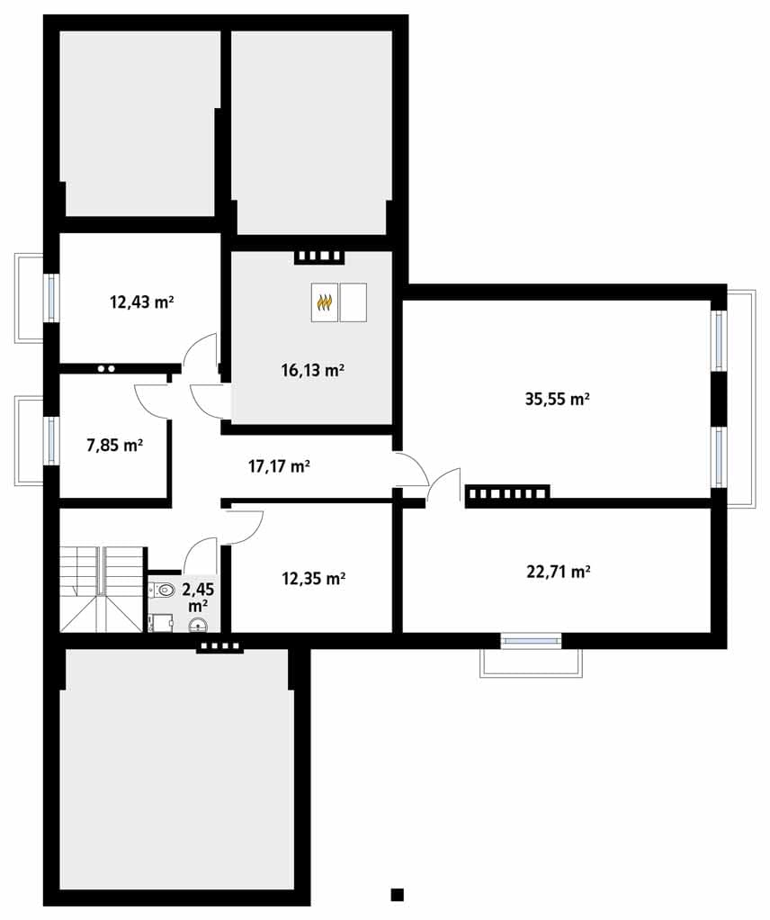 - rzuty poziome poszczególnych kondygnacji (parter, poddasze lub piętro),