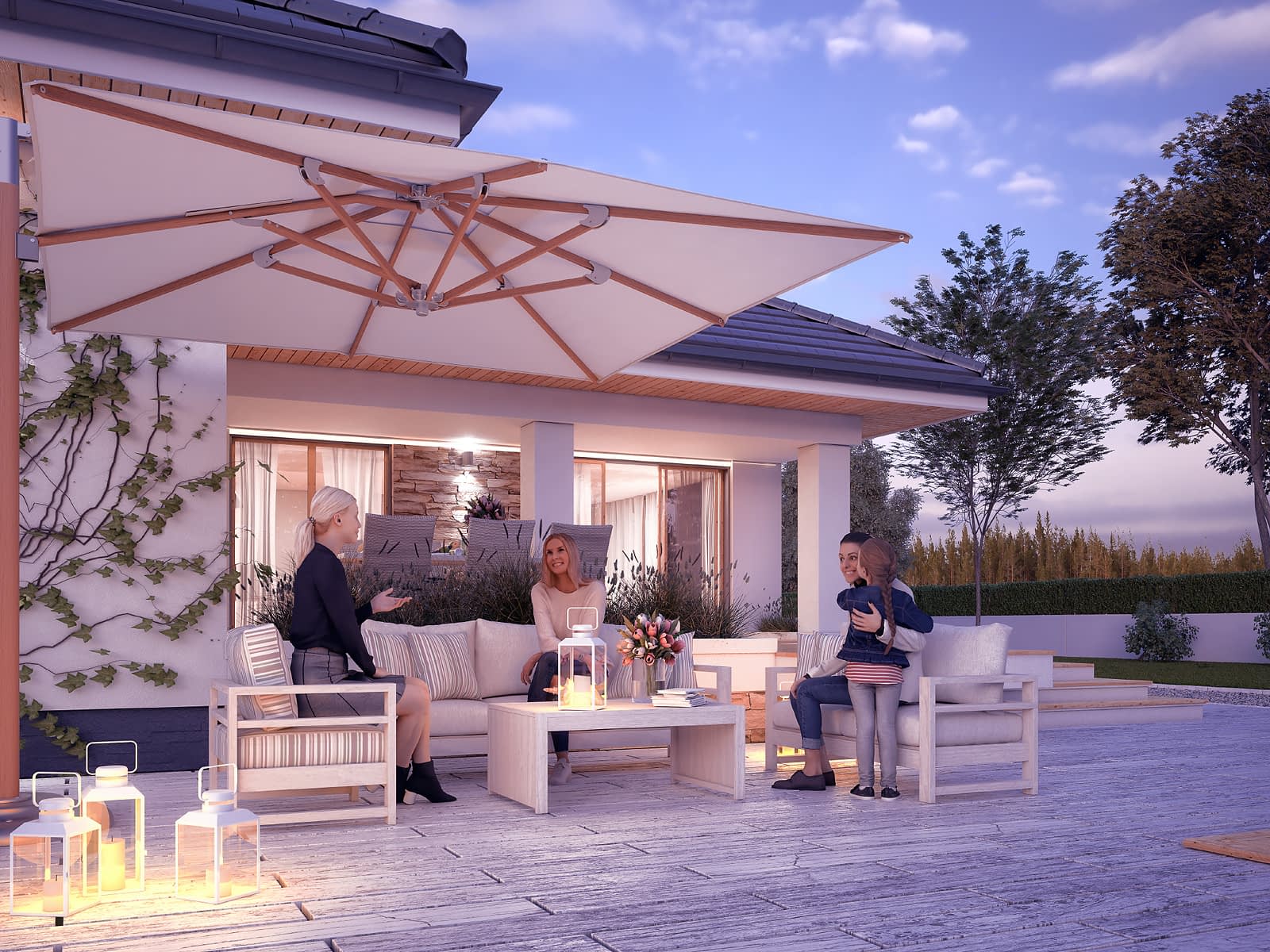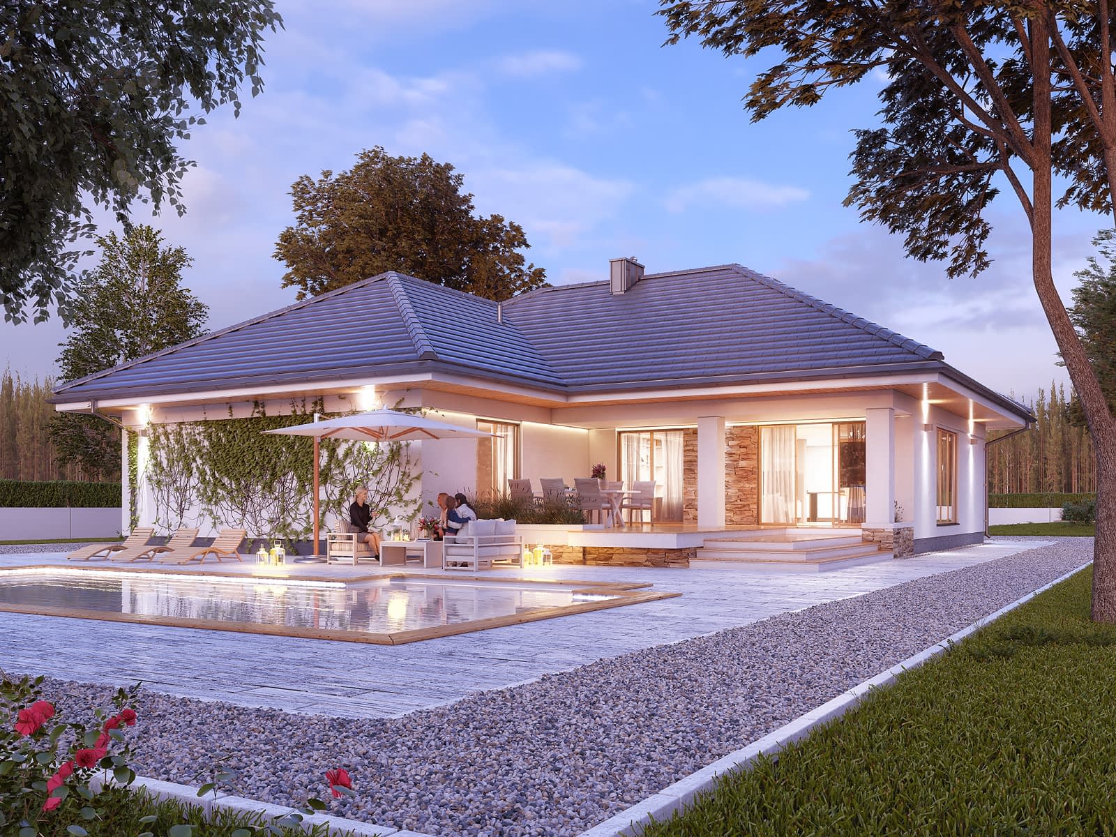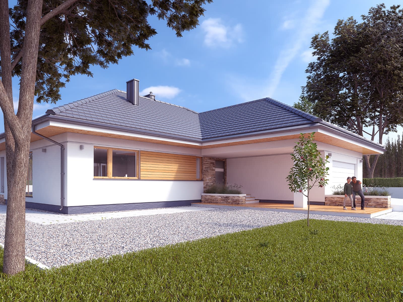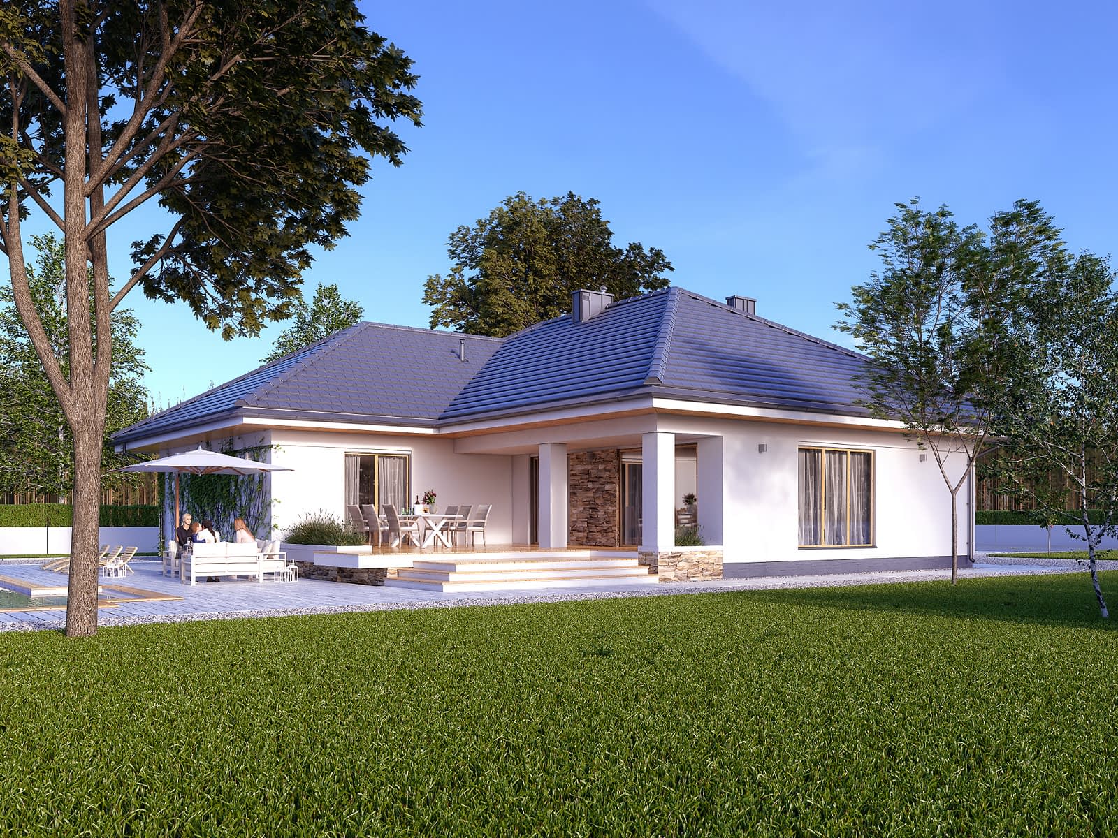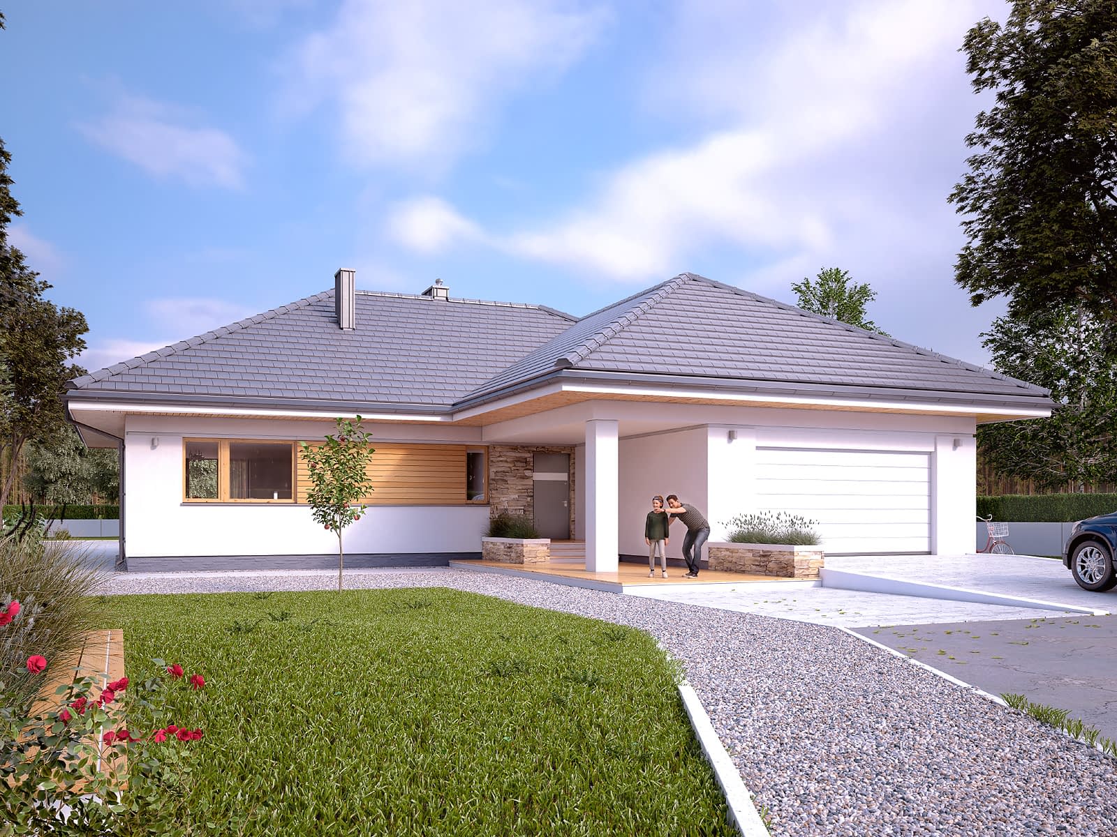 Ambrozja 6 to projekt parterowego domu spełniającego potrzeby 4 - 5-osobowej rodziny. Wyraźnie rysuje się podział na przestronną strefę dzienną i przytulną część prywatną. Otwarta, jasna kuchnia posiada dodatkowy atut w postaci spiżarni. Główna sypialnia zaprojektowana jako kompleks pomieszczeń z własną łazienką i garderobą, zagwarantuje pełną prywatność gospodarzom. Zadaszony taras umożliwia spędzanie czasu na świeżym powietrzu niezależnie od warunków pogodowych.Konstrukcja