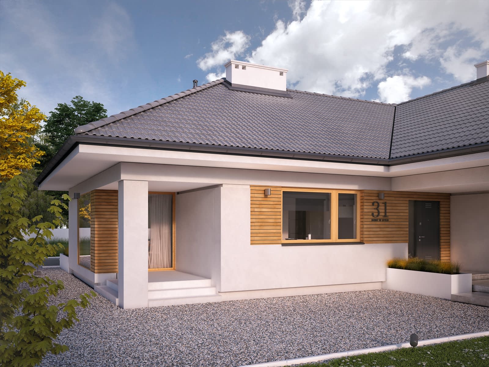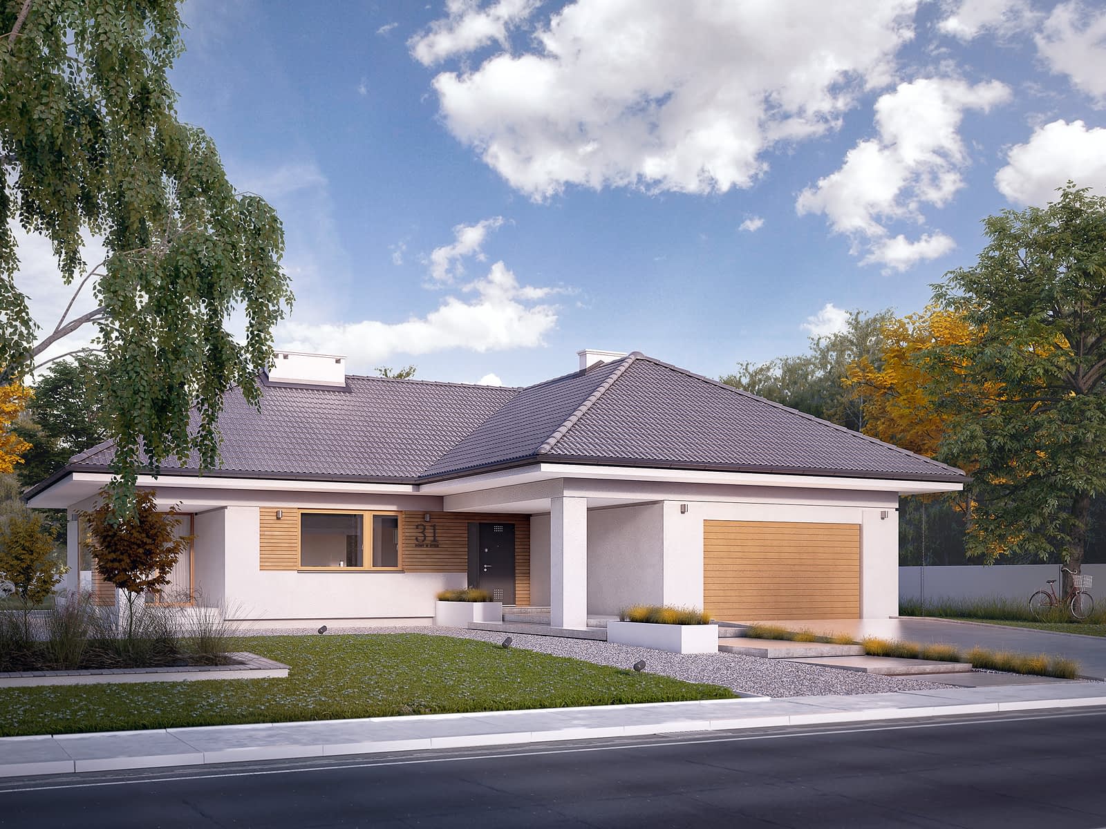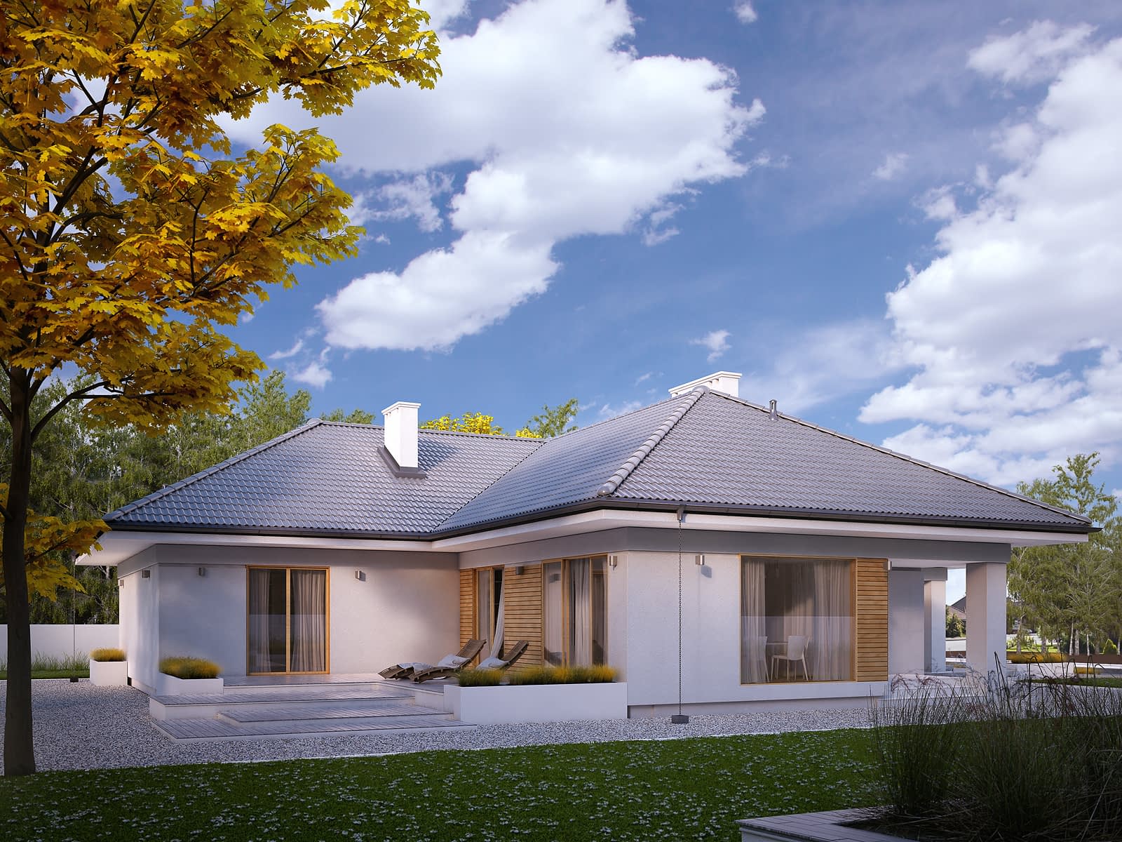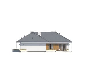 Jednorodzinny budynek mieszkalny, niepodpiwniczony. Wielkim atutem projektu są cztery sypialnie, co umożliwia wygodne funkcjonowanie 5-osobowej rodziny. W części dziennej zaprojektowano kuchnię ze spiżarnią oraz salon z jadalnią, z którego prowadzi wyjście na zadaszony taras. Część nocną stanowią cztery sypialnie, w tym jedna z własną łazienką i garderobą. W części gospodarczej przewidziano przestronną kotłownię oraz dwustanowiskowy garaż.Konstrukcja