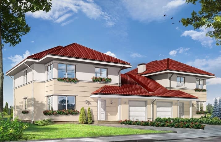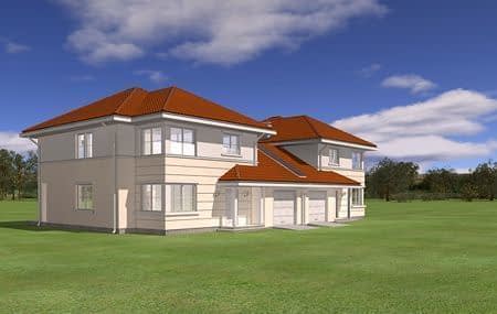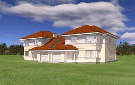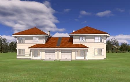 Projekt domu Ametyst 2 to budynek w zabudowie bliźniaczej dla dwóch cztero-sześcioosobowych rodzin. Piętrowy dom przykryty wielospadowym dachem. Zwarta, prosta w budowie bryła, złożona z dwóch piętrowych połówek i parterowego łącznika garaży, została urozmaicona fragmentami ścian z boniowaniem, oraz dwoma podcieniami. Subtelne elementy dekoracyjne dodają Ametystowi 2 dyskretnej elegancji. Wnętrze zaprojektowano z myślą o klarowności podziałów - bez zbędnych przestrzeni. Wszystkie pokoje mają funkcjonalny kształt. Na parterze zaplanowano salon połączony z jadalnią i holem, z częściowo otwartą kuchnią. W projekcie umieszczono też dodatkowy pokój - gabinet lub sypialnię gościnną. Część gospodarcza domu przewiduje dwustanowiskowy garaż i pomieszczenie gospodarcze - można również zrezygnować z drugiego garażu i zaprojektować w jego miejsce duże pomieszczenie gospodarcze. Na piętrze umieszczono trzy sypialnie z garderobami i szafami wbudowanymi, oraz dużą łazienkę. Istnieje możliwość wygospodarowania dodatkowego czwartego pokoju na piętrze - likwidując garderobę. Pracownia posiada wersję odbicia lustrzanego projektu Ametyst 2. Zapraszamy do zapoznania się z pełną ofertą pracowni MG Projekt: projekt domu Ametyst.UWAGA! Koszty realizacji oraz dane techniczne dotyczą połowy bliźniaka.