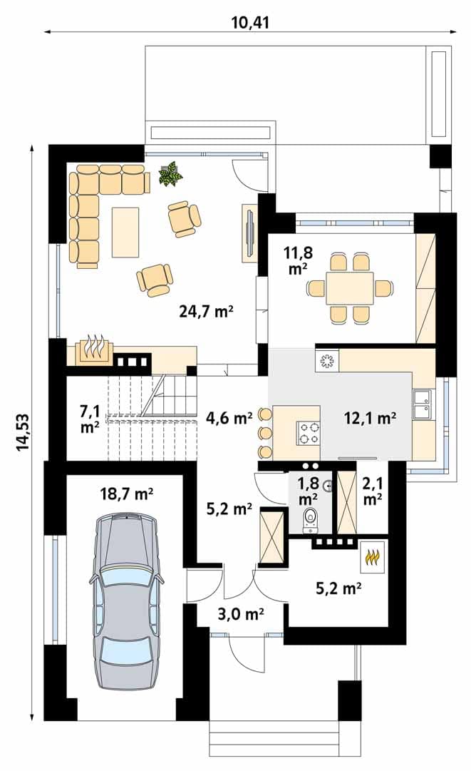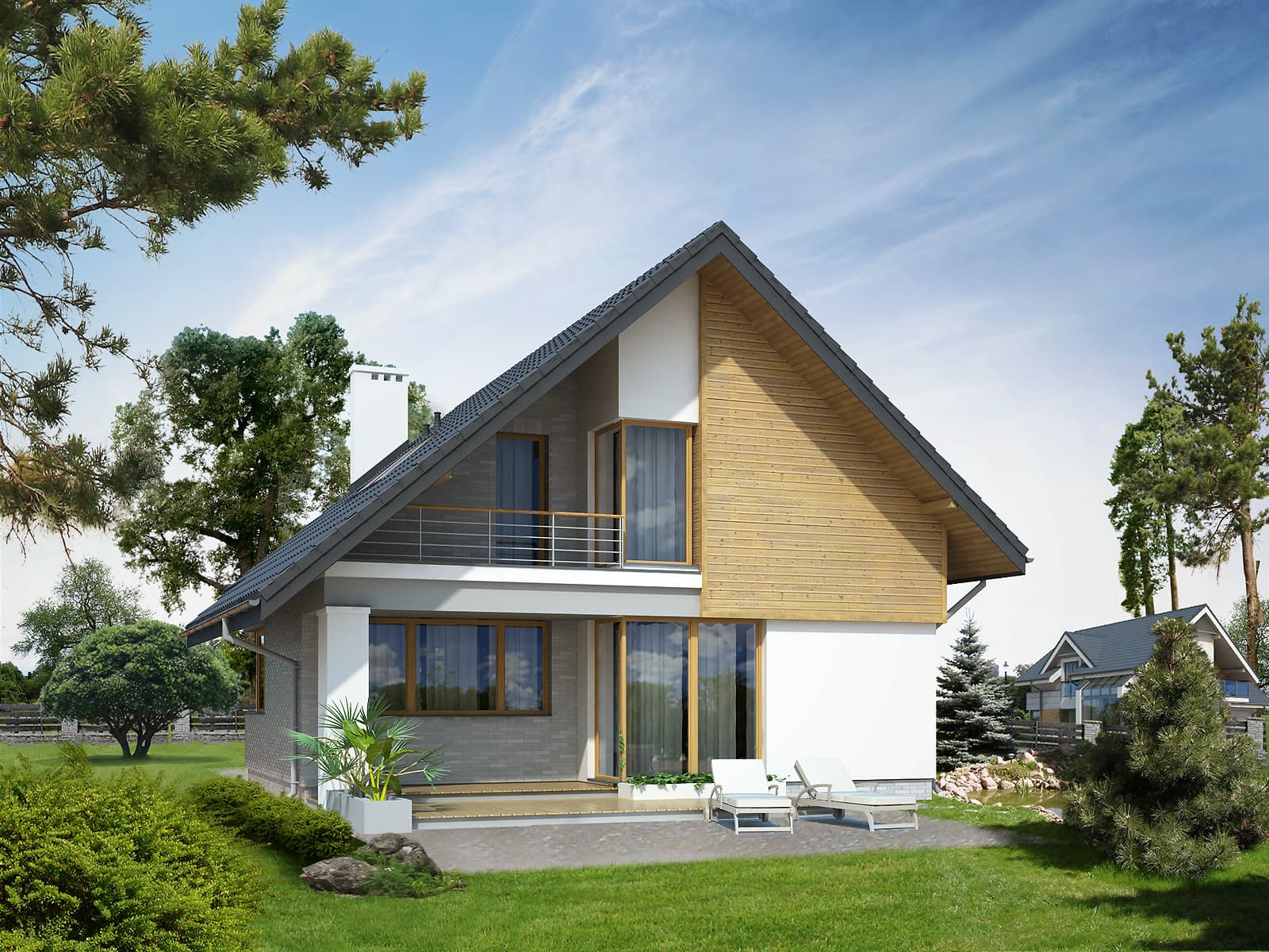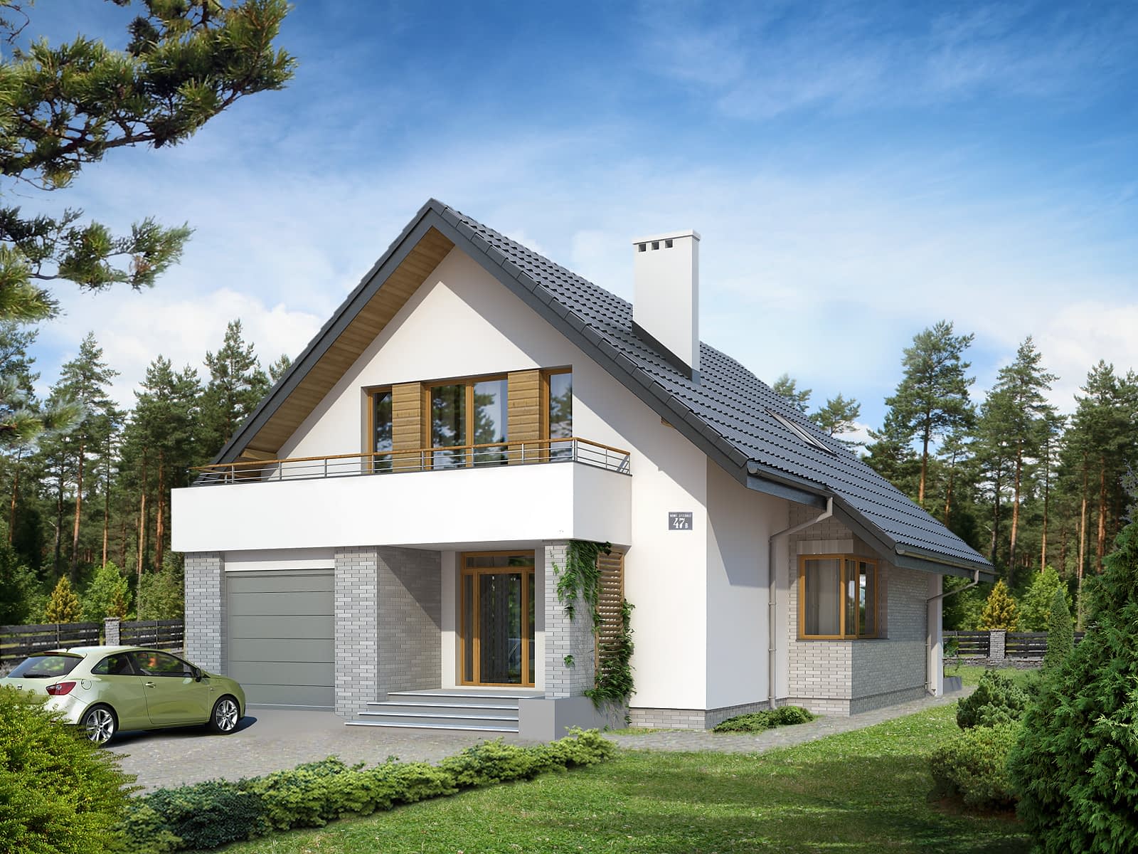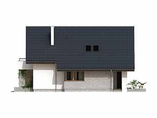Jednorodzinny dom parterowy z użytkowym poddaszem, niepodpiwniczony. Na parterze zaprojektowano przestronną część dzienną: salon, jadalnię, kuchnię ze spiżarnią oraz strefę gospodarczą. Na poddaszu przewidziano trzy sypialnie, w tym jedną z łazienką i garderobą. Bogaty, przejrzysty program funkcjonalny dla 4-osobowej rodziny.Konstrukcja