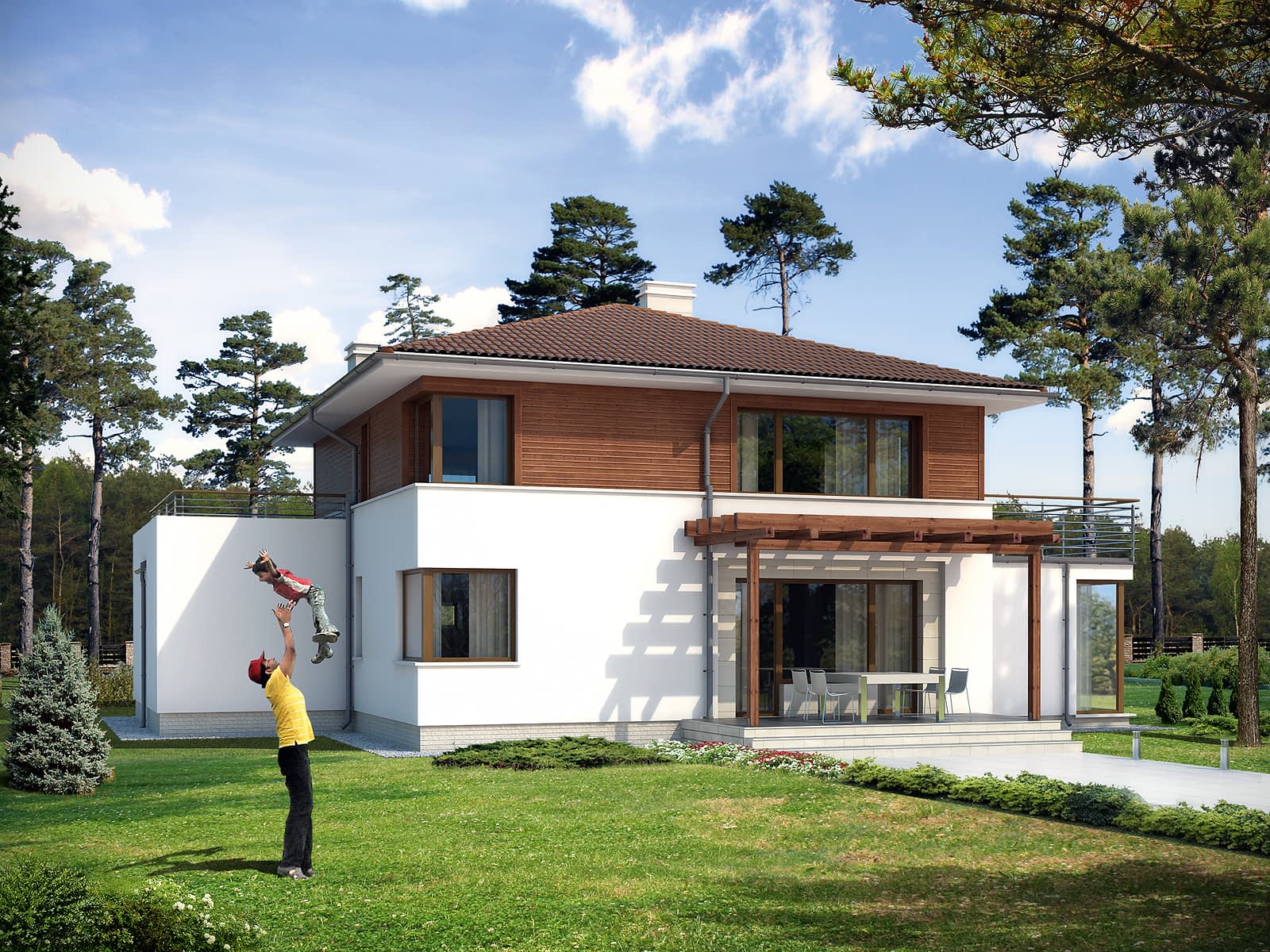 Dwukondygnacyjny dom jednorodzinny z jednostanowiskowym garażem, niepodpiwniczony. Współczesna stylistyka odróżnia go od typowych projektów z użytkowym poddaszem. Dzięki dwóm pełnym kondygnacjom istnieje możliwość łatwej aranżacji pomieszczeń. Na parterze, oprócz pokoju dziennego, kuchni i jadalni, zaprojektowano dodatkowy pokój z łazienką. Wygodę użytkowania gwarantują liczne pomieszczenia dodatkowe: na parterze dwa pomieszczenia gospodarcze i spiżarnia, na poddaszu odrębna pralnia i garderoba.Konstrukcja
