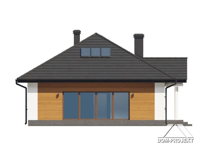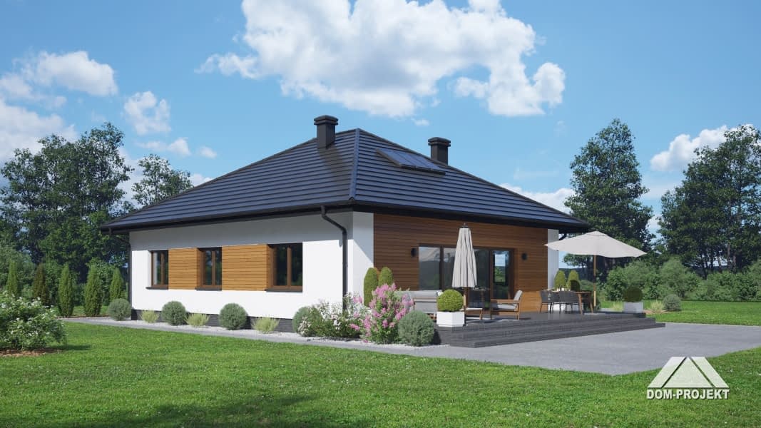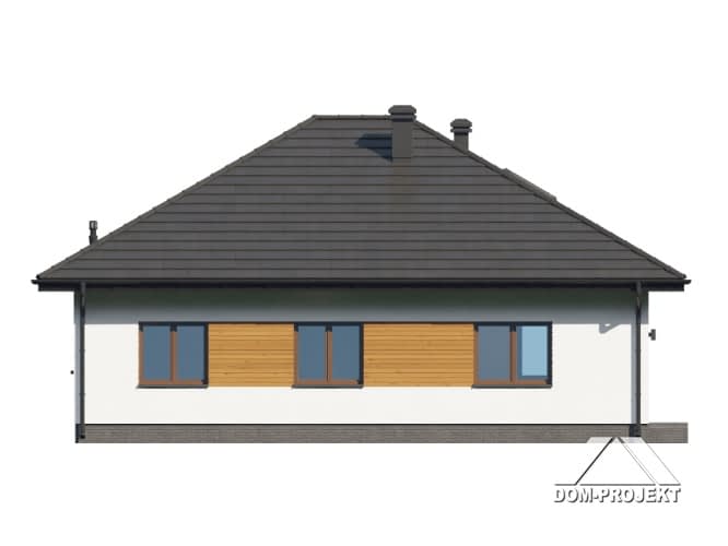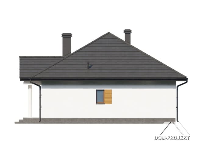 Wygodny dom parterowy. Duży salon z aneksem kuchennym, kominkiem oraz wyjściem na taras. Trzy pokoje, łazienka, komunikacja, wiatrołap, kotłownia. Z wiatrołapu schody na poddasze. Na poddaszu strych. Zwarta bryła budynku sprzyja szybkiej i taniej budowie oraz niskim kosztom eksploatacji.Rzuty