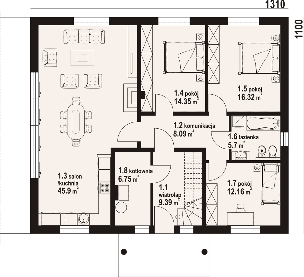 - 1.3 - kuchnia, salon45.9 m²