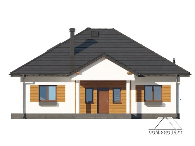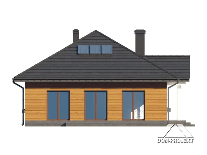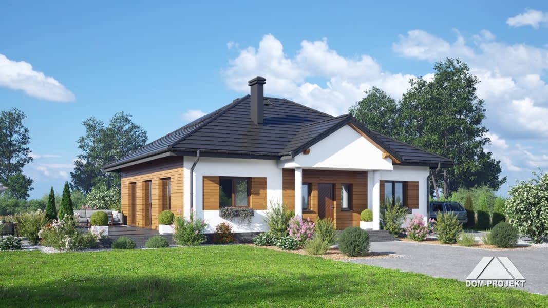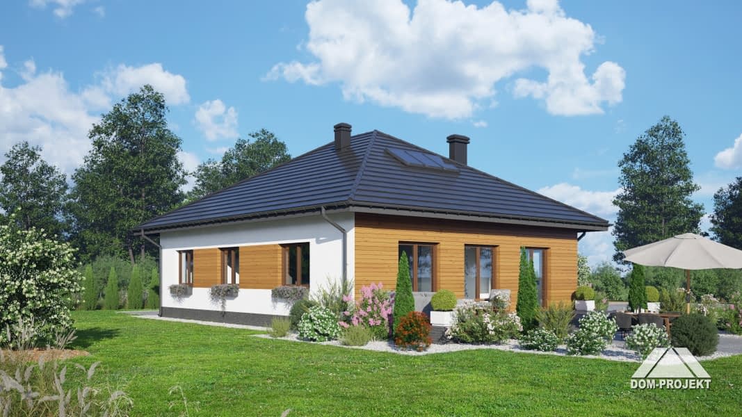 Dom parterowy. Duży salon z kuchnią, kominkiem oraz wyjściami na taras. Trzy pokoje, łazienka, komunikacja, kotłownia, wiatrołap. Z wiatrołapu schody prowadzą na strych nieużytkowy.Rzuty