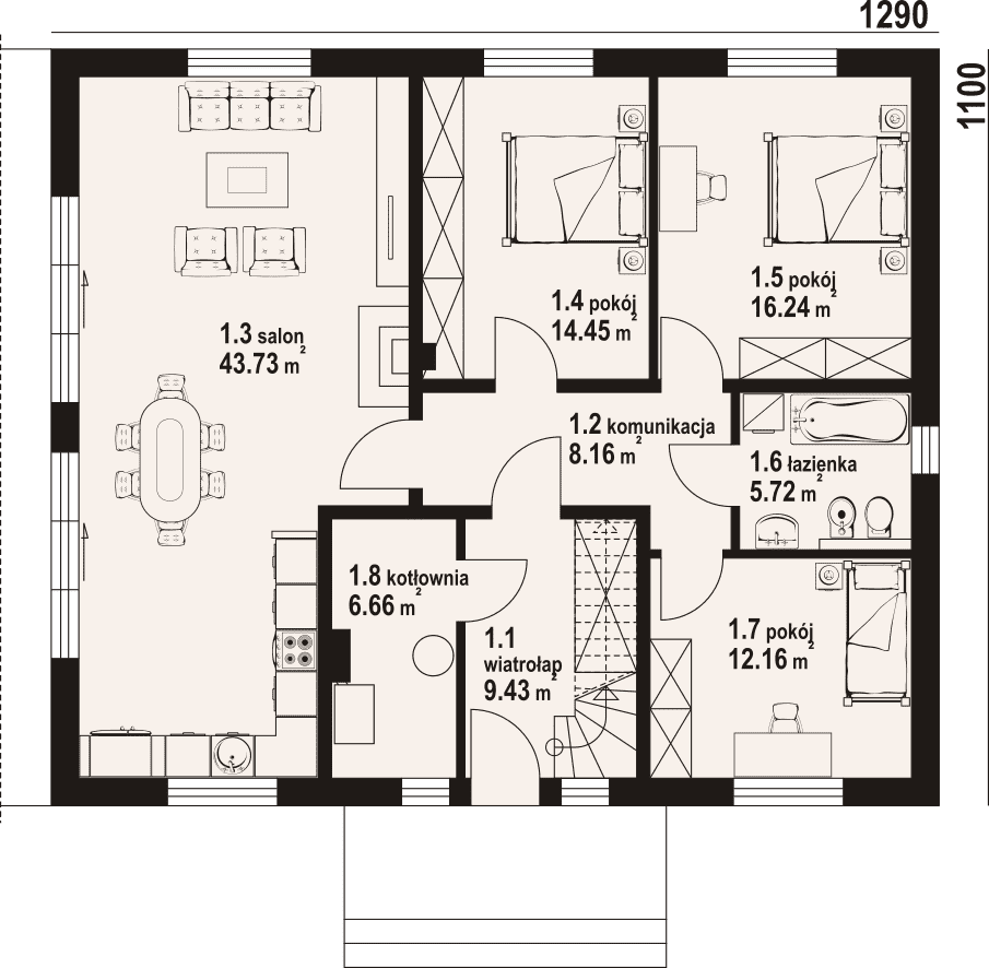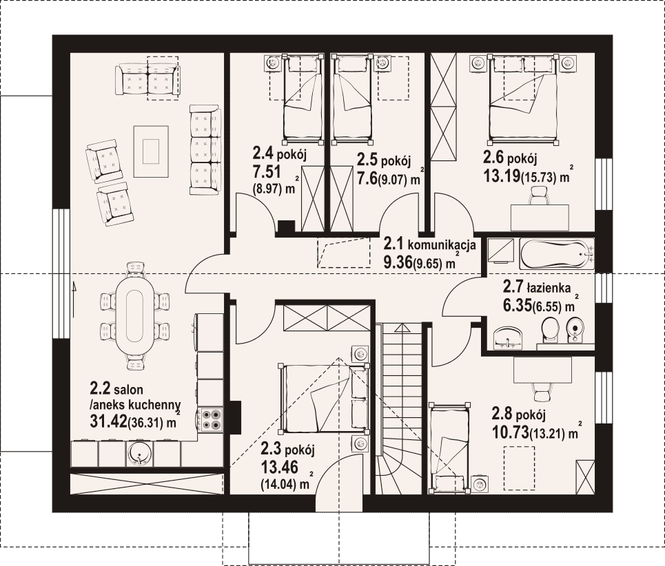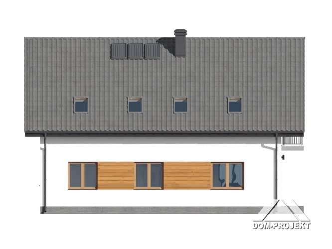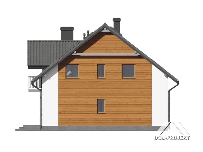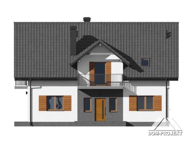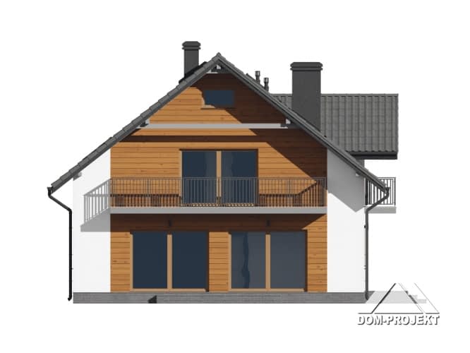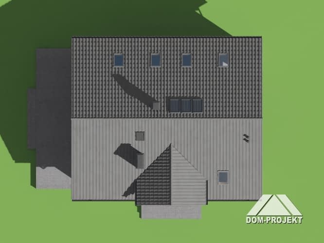 Dom z poddaszem użytkowym. Na parterze duży salon z aneksem kuchennym, kominkiem oraz wyjściem na taras. Trzy pokoje, łazienka, komunikacja, wiatrołap, kotłownia. W wiatrołapie schody na poddasze. Na poddaszu salon z aneksem kuchennym oraz wyjściem na balkon, pięć pokoi, łazienka, komunikacja. Poddasze jest samodzielnym mieszkaniem.Rzuty