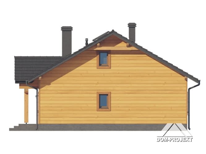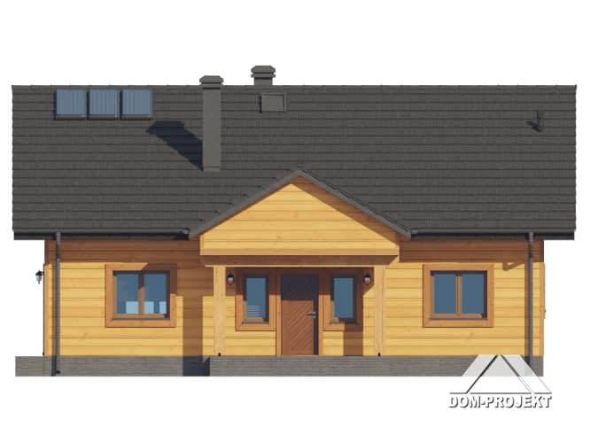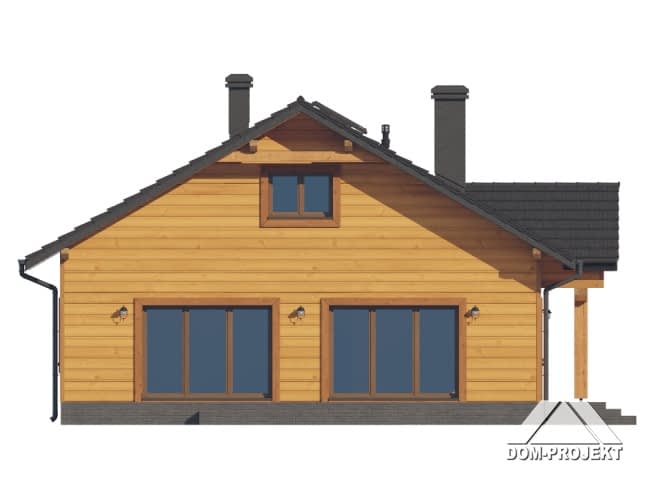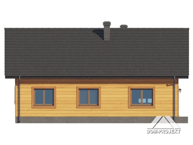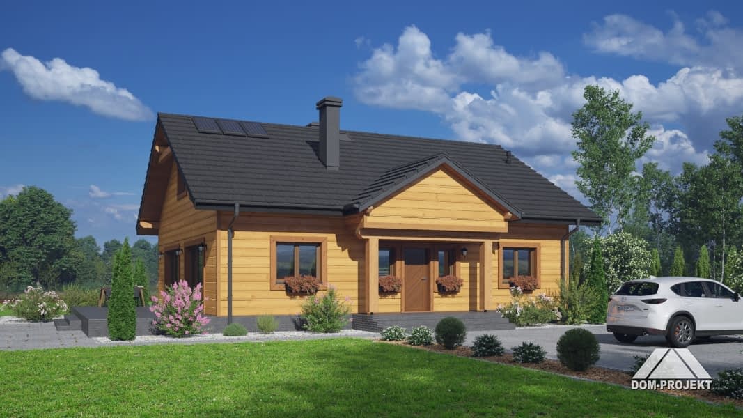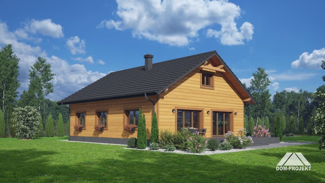 Dom w konstrukcji szkieletu drewnianego. Parterowy. Duży salon z aneksem kuchennym, kominkiem oraz wyjściem na taras. Trzy pokoje, łazienka, komunikacja, kotłownia, wiatrołap. W wiatrołapie schody na poddasze. Na poddaszu strych. Zwarta bryła budynku oraz dach dwuspadowy sprzyjają szybkiej i taniej budowie oraz niskim kosztom eksploatacji.Rzuty