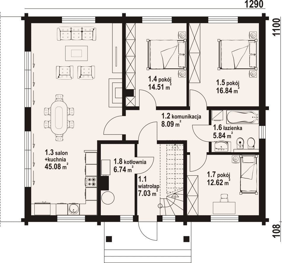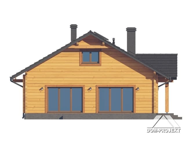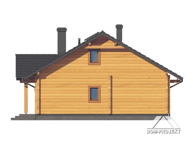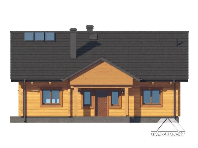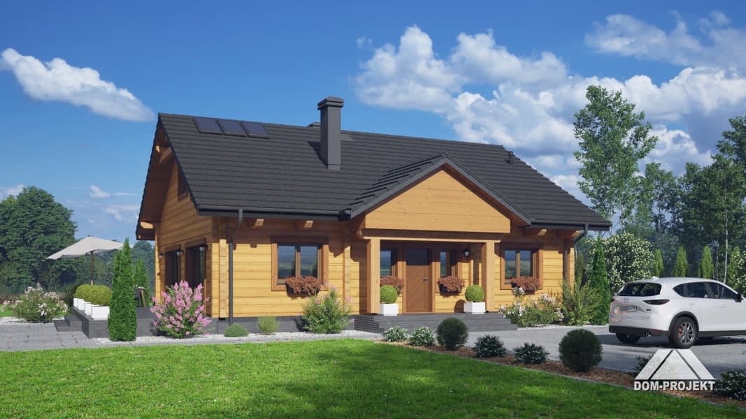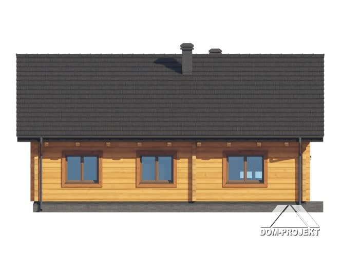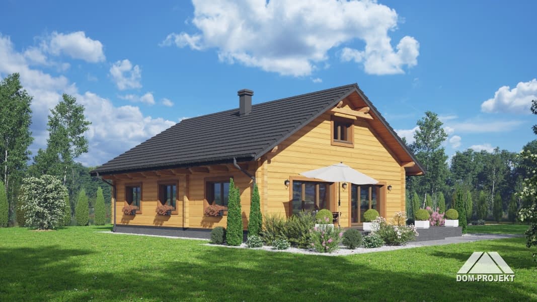 Dom z bali. Parterowy. Salon z aneksem kuchennym, kominkiem oraz wyjściem na taras. Trzy pokoje, łazienka, komunikacja, wiatrołap, kotłownia. Wyjście na poddasze nieużytkowe schodami z wiatrołapu. Zwarta bryła budynku i dach dwuspadowy sprzyjają szybkiej i taniej budowie oraz niskim kosztom eksploatacji.Rzuty